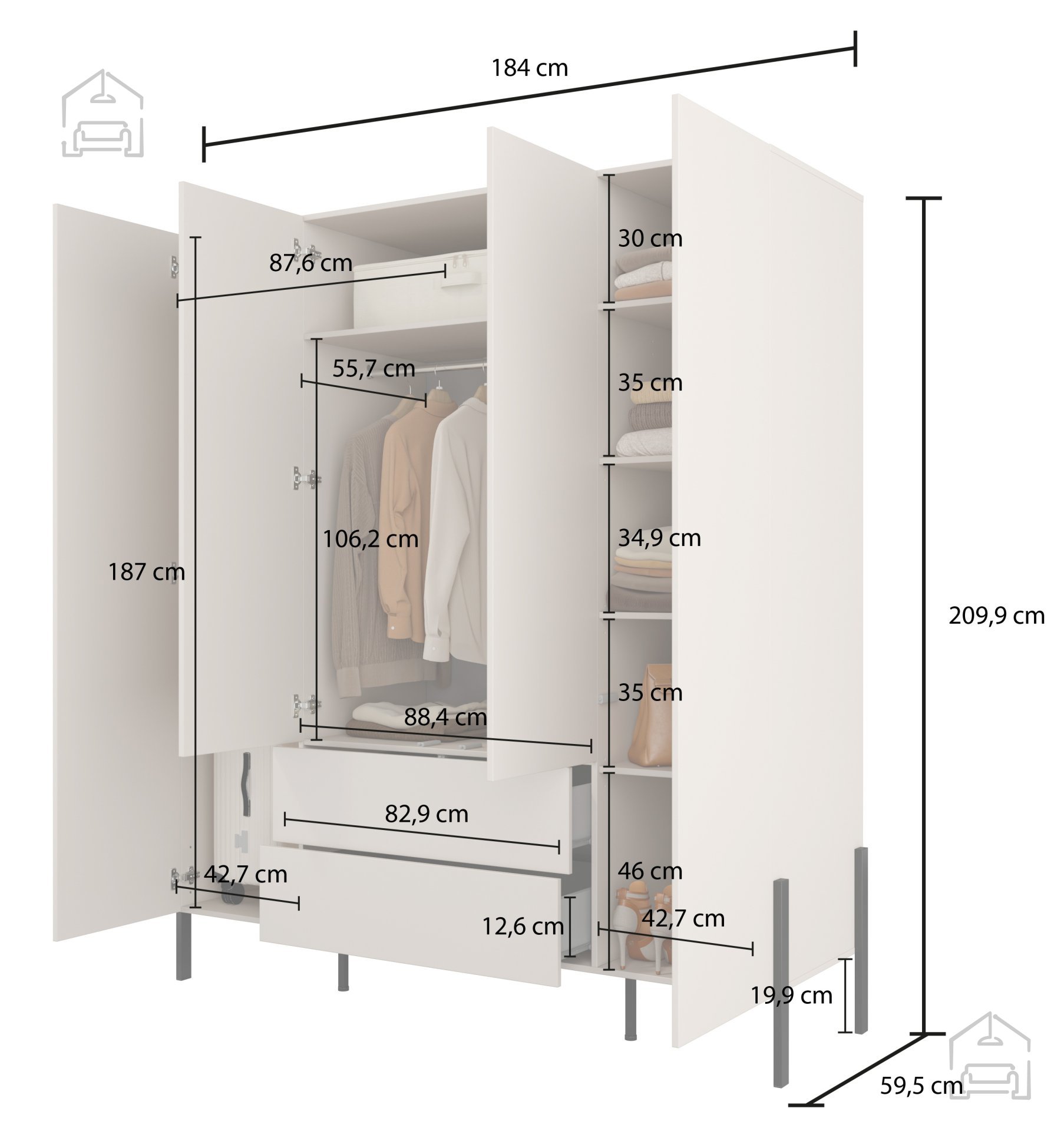Der Schrank misst 180 × 60 × 210 cm und bietet eine ausgewogene Kombination aus Stauraum und ansprechender Optik. Mit einer Höhe von 210 cm wird der vorhandene Platz optimal genutzt – genügend Raum zum Aufhängen von Kleidung, Aufbewahren von Accessoires und Falten von Textilien. Die Breite von 180 cm sorgt für eine übersichtliche Organisation, und mit einer Tiefe von 60 cm ist auch Platz für größere Kleidungsstücke wie Mäntel oder Sakkos.