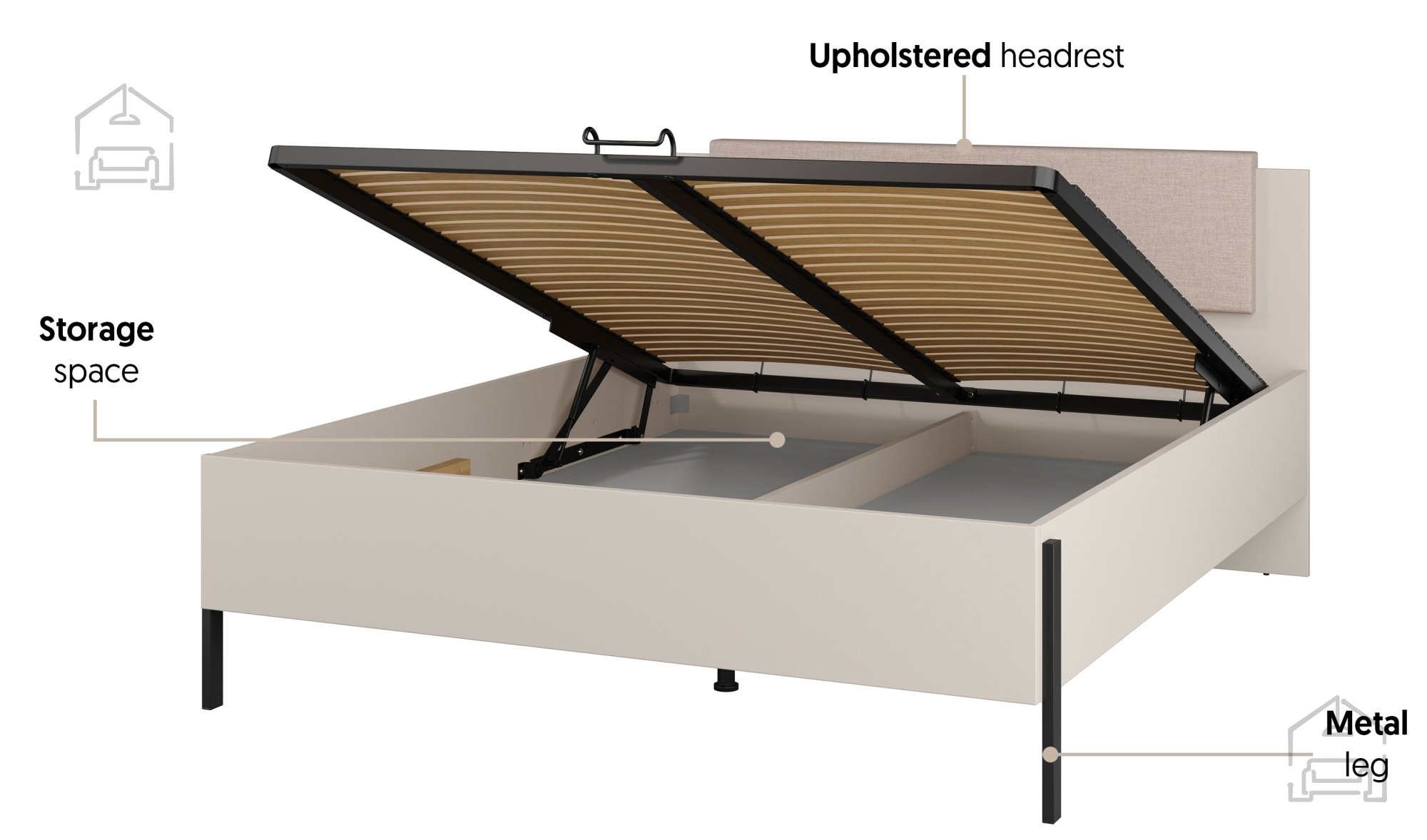 Das Bett mit Hebefunktion Jukon S ist ein modernes Möbelstück für alle, die Komfort, Funktionalität und ein ansprechendes Design im Schlafzimmer vereinen möchten. Sein sanfter Farbton Cashmere vermittelt Wärme und Ruhe, während die schwarzen Metallfüße einen dezenten Kontrast und einen Hauch moderner Eleganz schaffen. Gefertigt ist das Bett aus hochwertiger Möbelplatte mit einer Stärke von 15 mm, was für Stabilität und Langlebigkeit auch bei täglicher Nutzung sorgt.