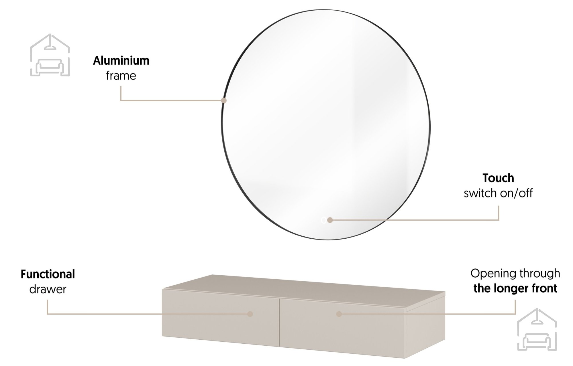 Der Farbton Kaschmir sorgt für Wärme und Ruhe und fügt sich harmonisch in verschiedenste Einrichtungsstile ein. Die sanften Nuancen lassen den Raum größer wirken, während klare Linien und das grifflose Öffnungssystem ein minimalistisches Gesamtbild schaffen. Die Oberfläche ist pflegeleicht und widerstandsfähig – ideal für die tägliche Schmink- und Pflegeroutine.