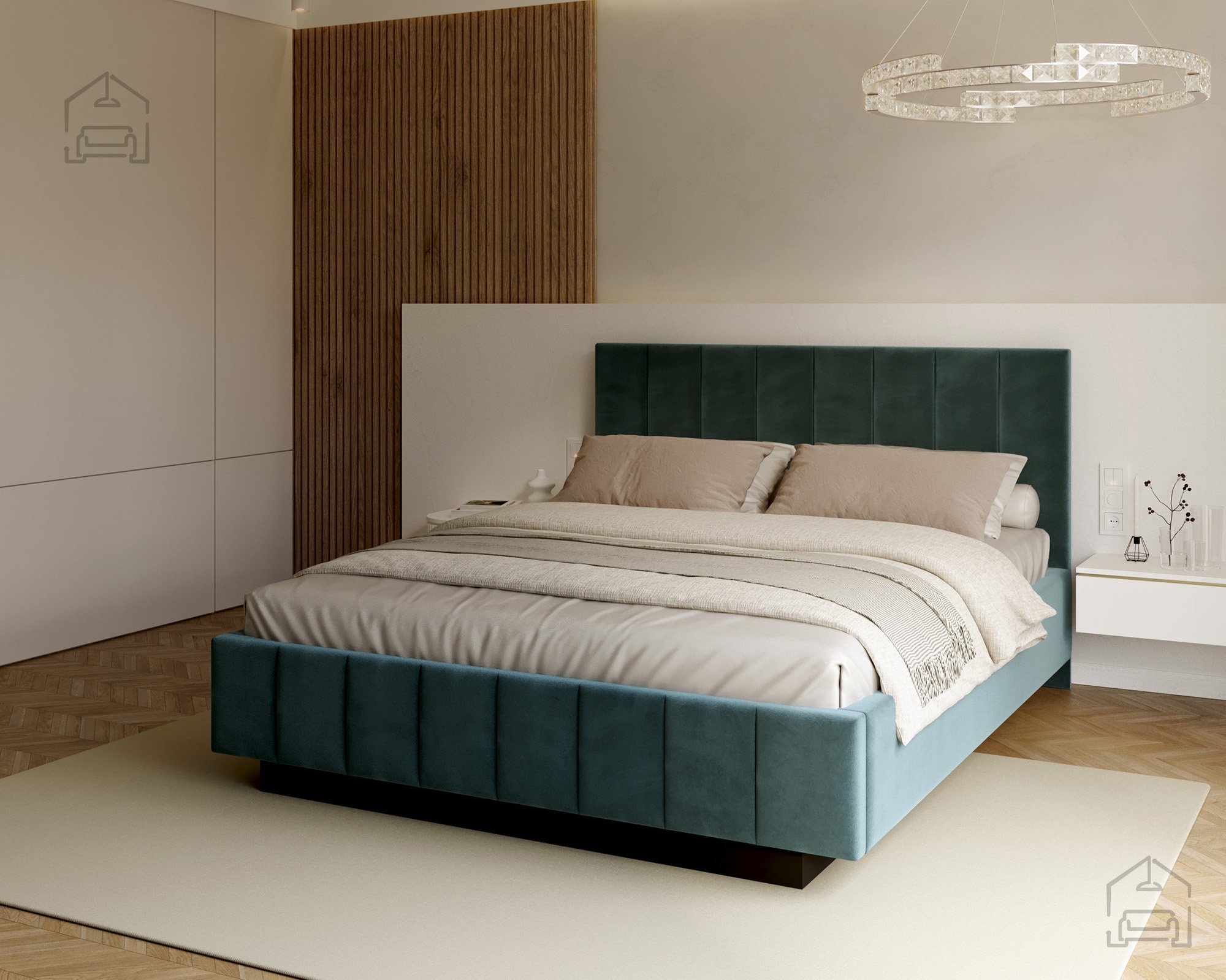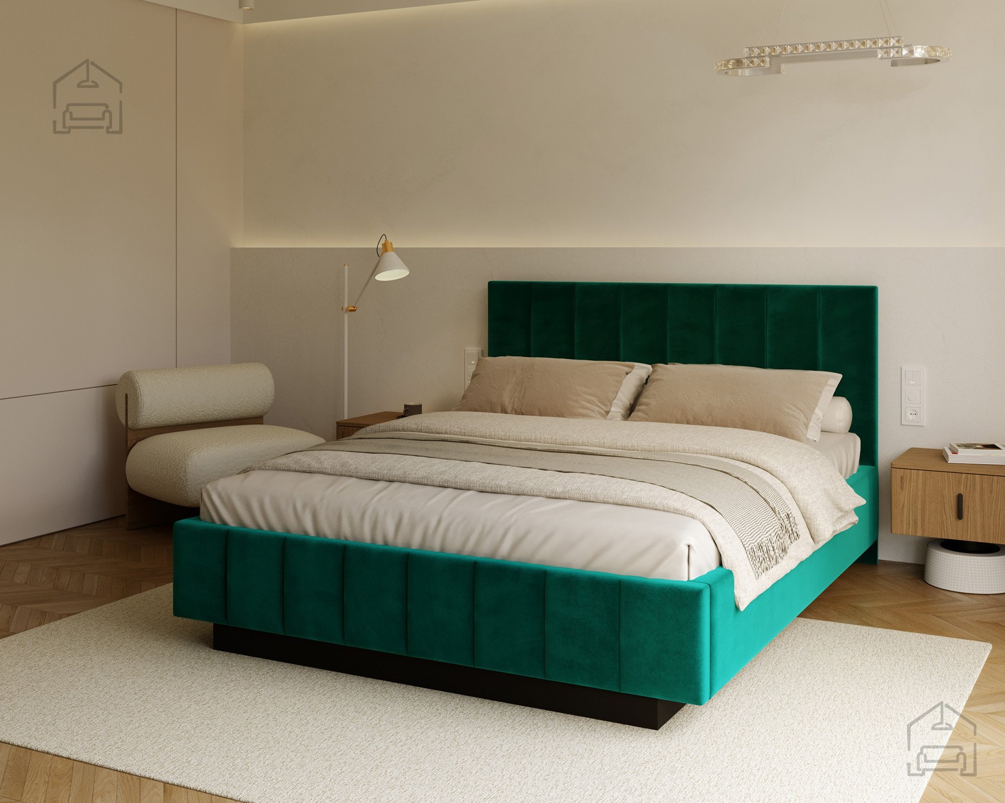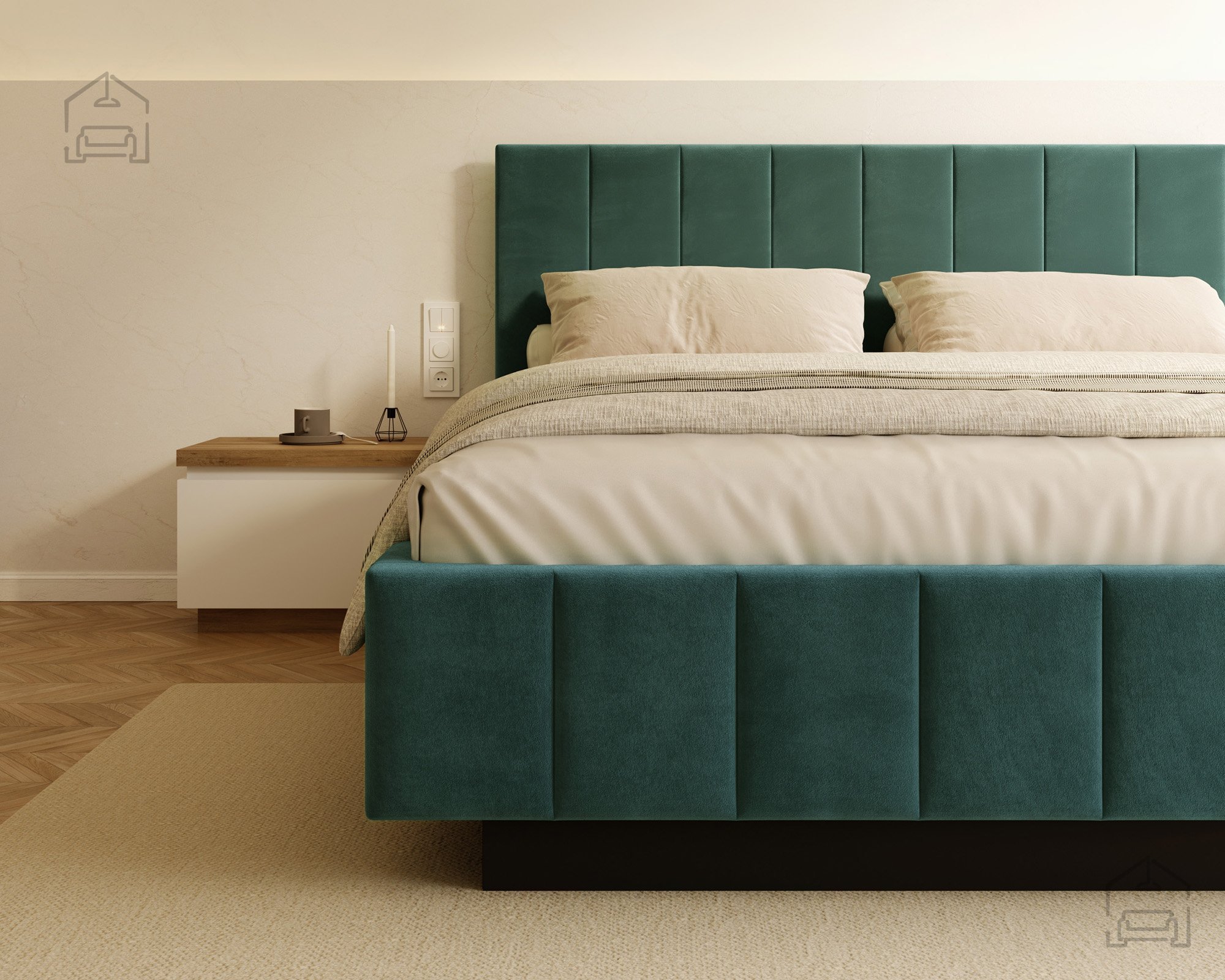 Das Modell Levito überzeugt sowohl durch seine ansprechende Optik als auch durch seine praktische Nutzung. Der gepolsterte Rahmen ist in mehreren Farbvarianten erhältlich, das auf dem Foto gezeigte Modell ist mit dem Stoff Trinity Turquoise bezogen. Dank seines klaren Designs passt das Bett ideal in moderne, minimalistische und stilvolle Interieurs, in denen auf klare Linien und ein offenes Raumgefühl Wert gelegt wird.