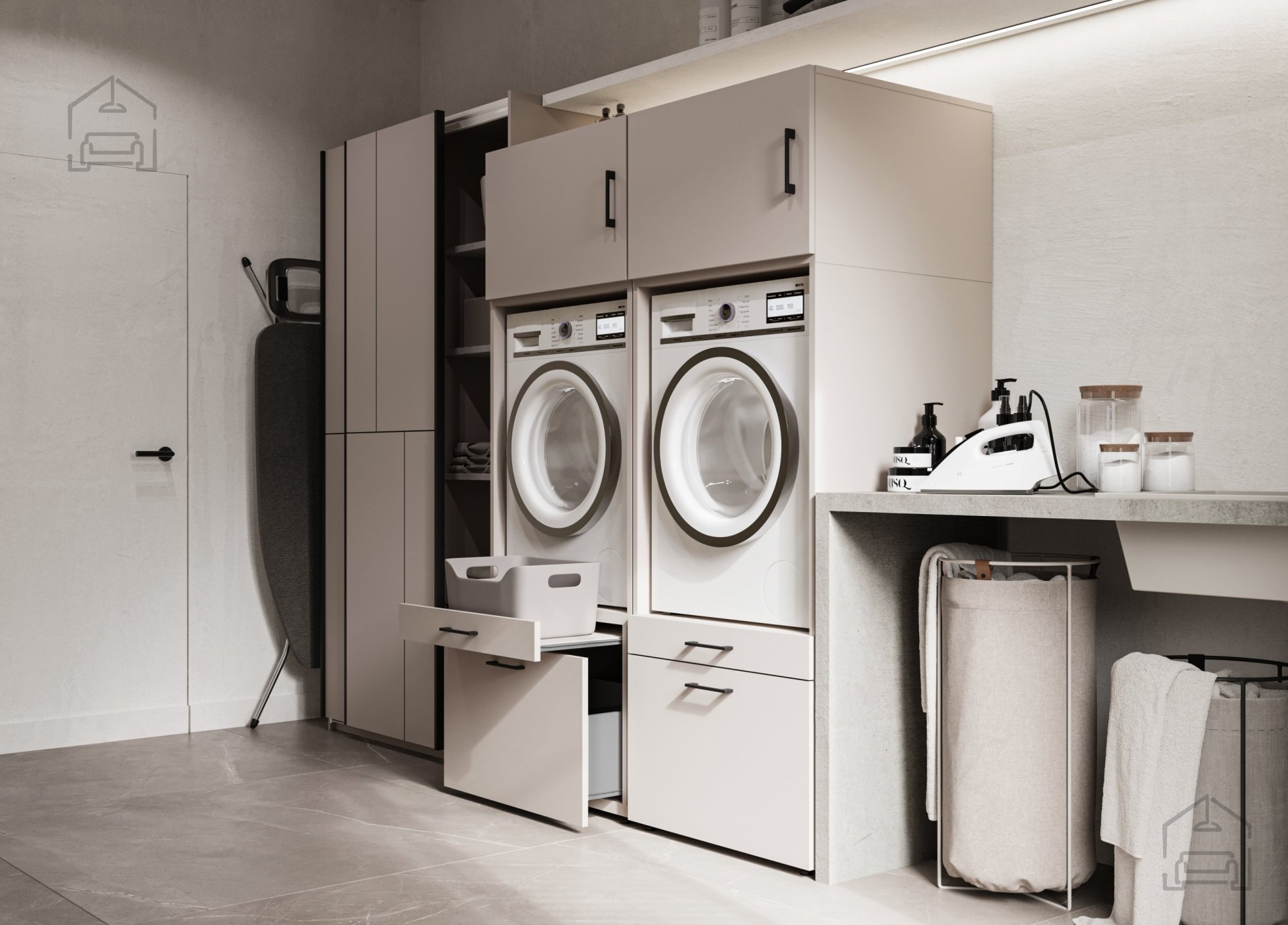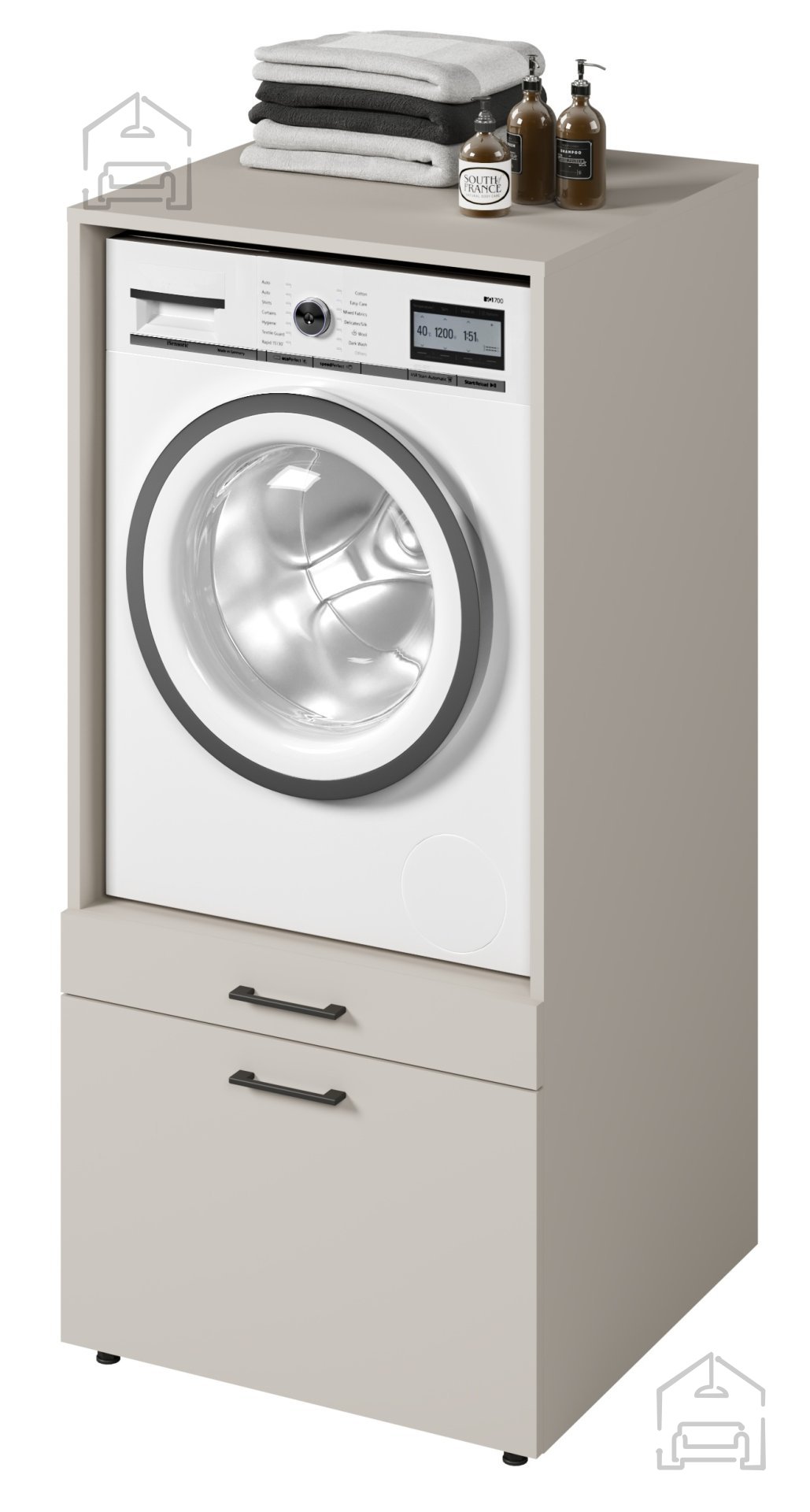 Besonders praktisch sind die integrierten Schubladen des Modells Aza. Sie bieten Platz zur übersichtlichen Aufbewahrung von Wasch- und Reinigungsmitteln, Weichspülern, Detergenzien und anderen Utensilien, die man gerne griffbereit hat. So bleibt alles ordentlich und leicht zugänglich, ohne unnötige Unordnung. Die Schubladen lassen sich sanft öffnen und schließen, was die Handhabung besonders angenehm macht.