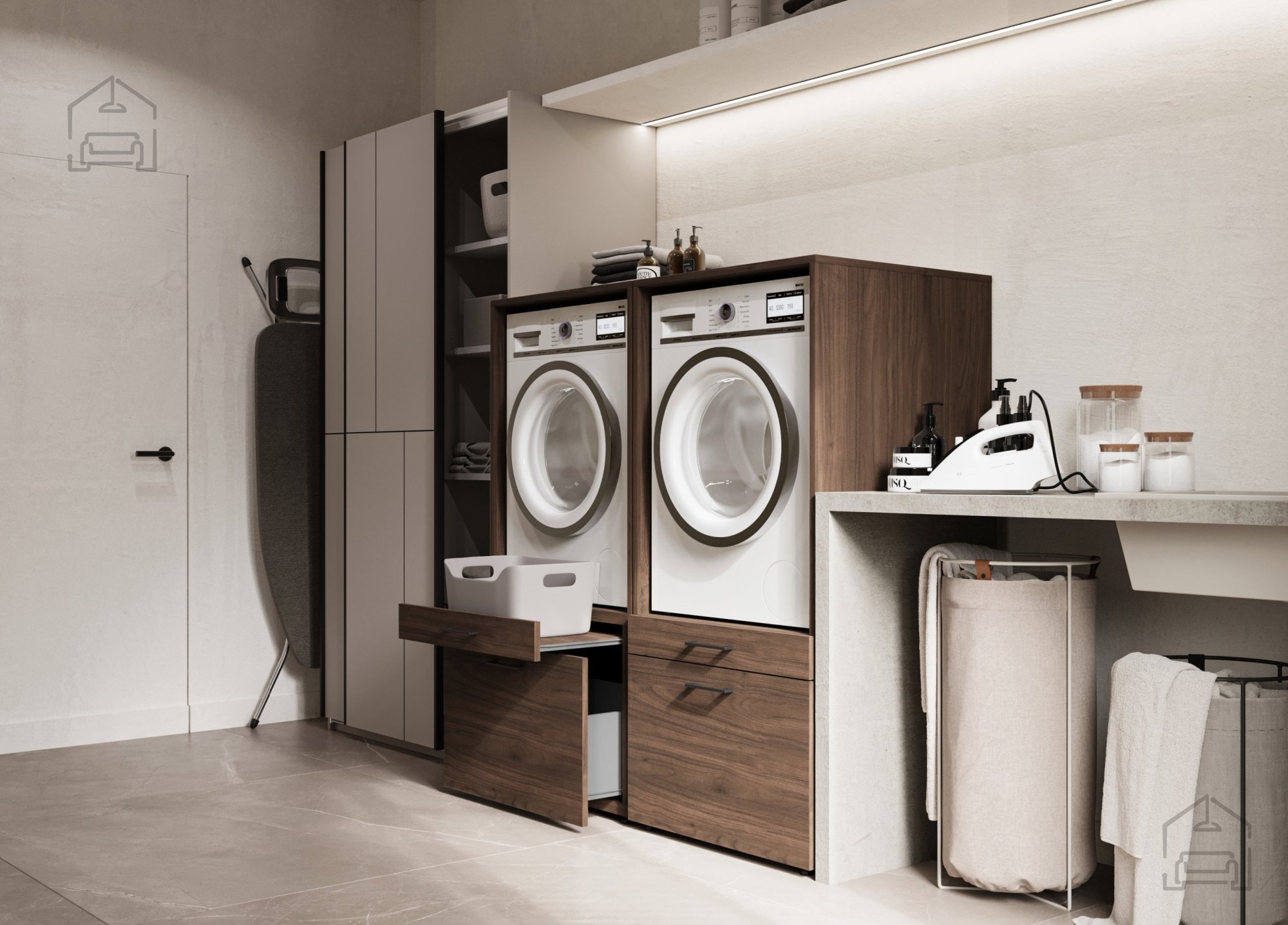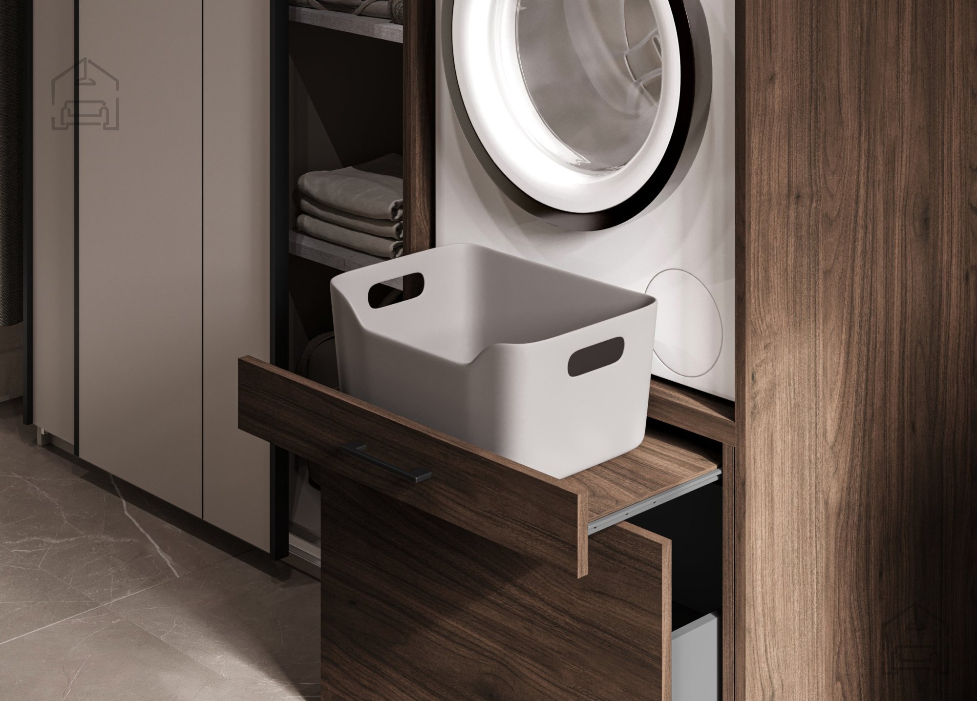Der Schrank ist so konstruiert, dass die Waschmaschine einfach unter die Konstruktion geschoben werden kann, ohne die Bedienung einzuschränken. Dank der durchdachten Höhe wird der Raum über dem Gerät optimal genutzt – besonders praktisch in kleineren Wohnungen oder Waschküchen mit begrenztem Platzangebot.