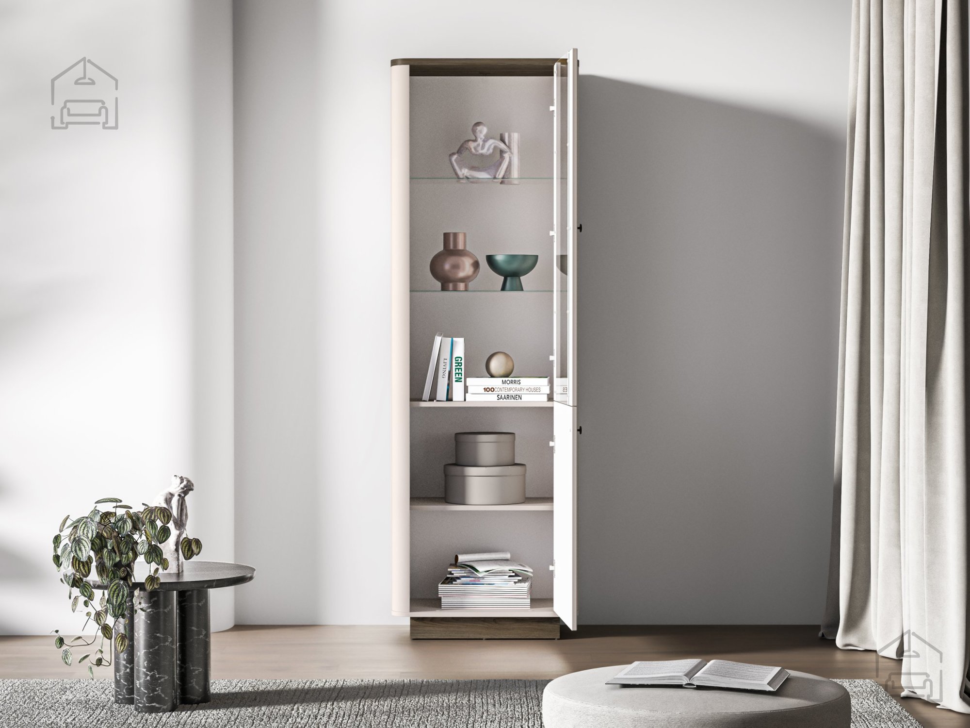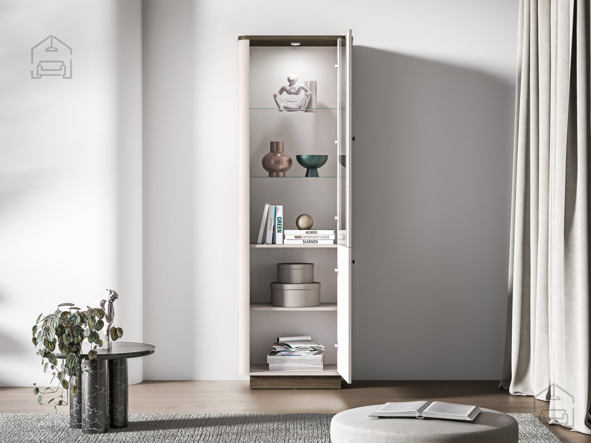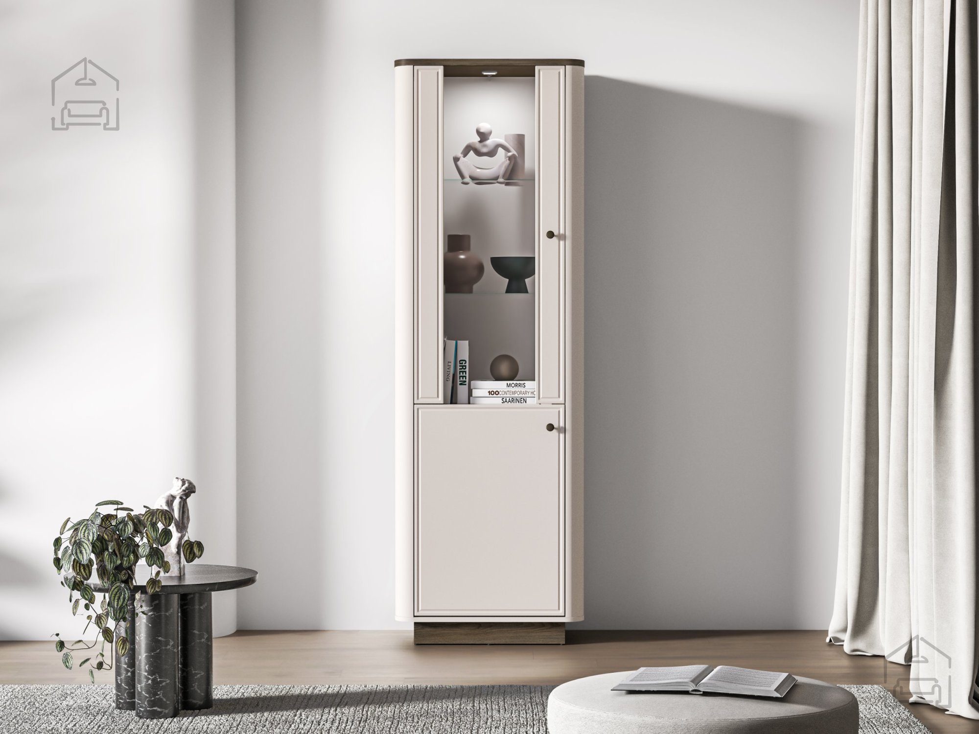 Das Modell Vilavio 01 eignet sich ideal fürs Wohnzimmer, wo es als Vitrine für Deko, Bücher oder Glaswaren dient. Im Schlafzimmer kann sie als stilvolle Ergänzung zur Garderobe genutzt werden – perfekt zur Aufbewahrung von Accessoires, Düften oder Textilien. Dank ihrer ausgewogenen Höhe und Tiefe harmoniert sie wunderbar mit niedrigeren Kommoden oder TV-Möbeln aus derselben Serie.