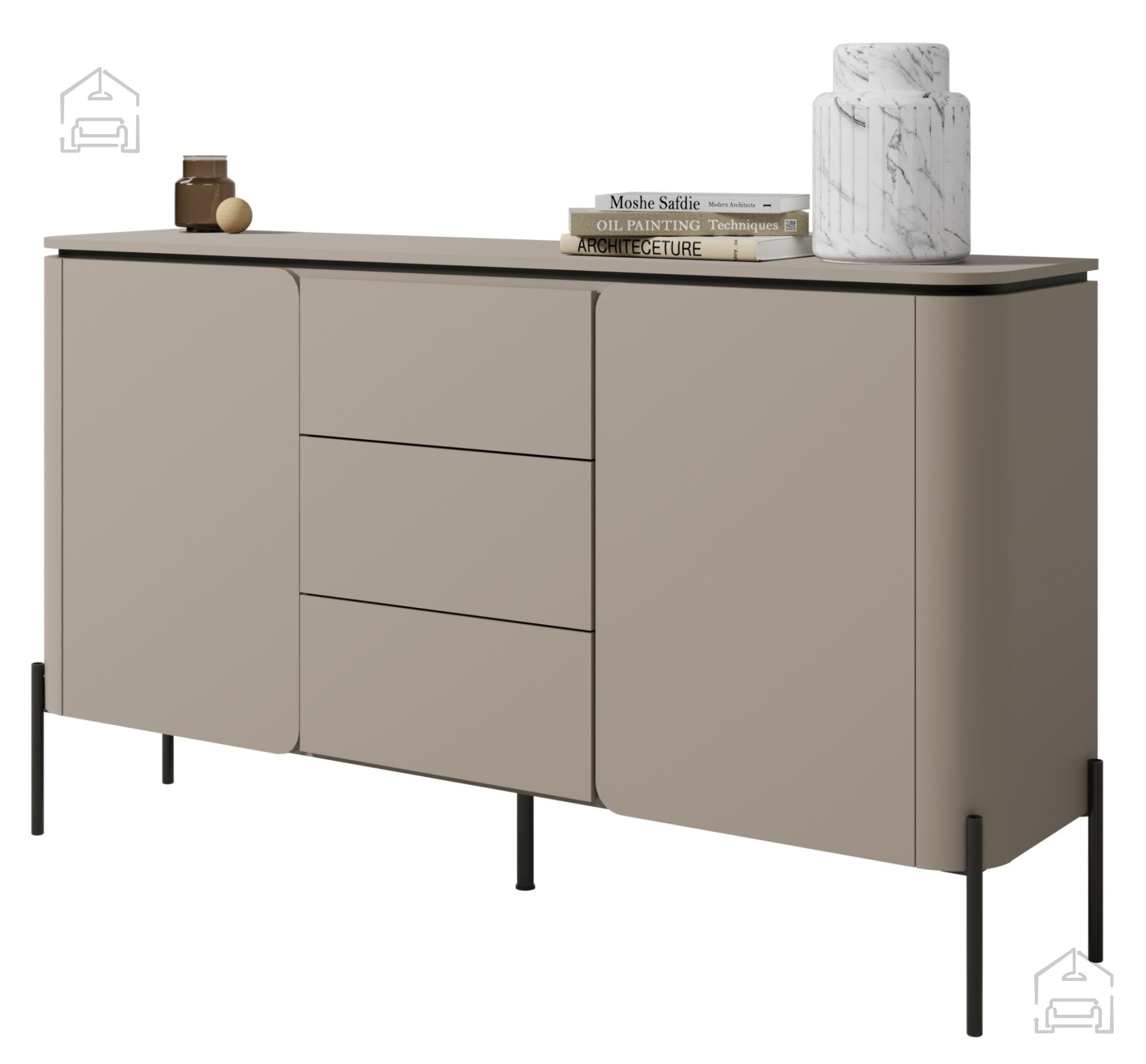 Die Kommode steht auf schwarzen Metallbeinen, die für Stabilität sorgen und den modernen Look abrunden. Diese Beine sind nicht nur funktional, sondern verleihen dem Möbelstück auch optische Leichtigkeit, sodass es nicht zu massiv wirkt. Durch die erhöhte Bauweise lässt sich der Boden darunter leicht reinigen, was zusätzlich für ein luftiges Raumgefühl sorgt.