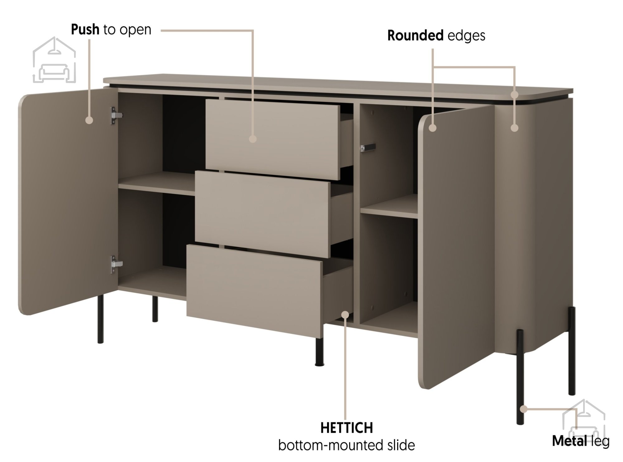 Anstelle klassischer Griffe verfügt die Kommode über das moderne Push to open-System. Dabei öffnen sich Türen und Schubladen durch leichtes Antippen. Diese Lösung sorgt für eine klare, grifflose Front und ein minimalistisches Erscheinungsbild – gleichzeitig ist die Bedienung komfortabel und angenehm leise.