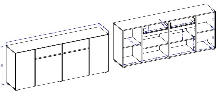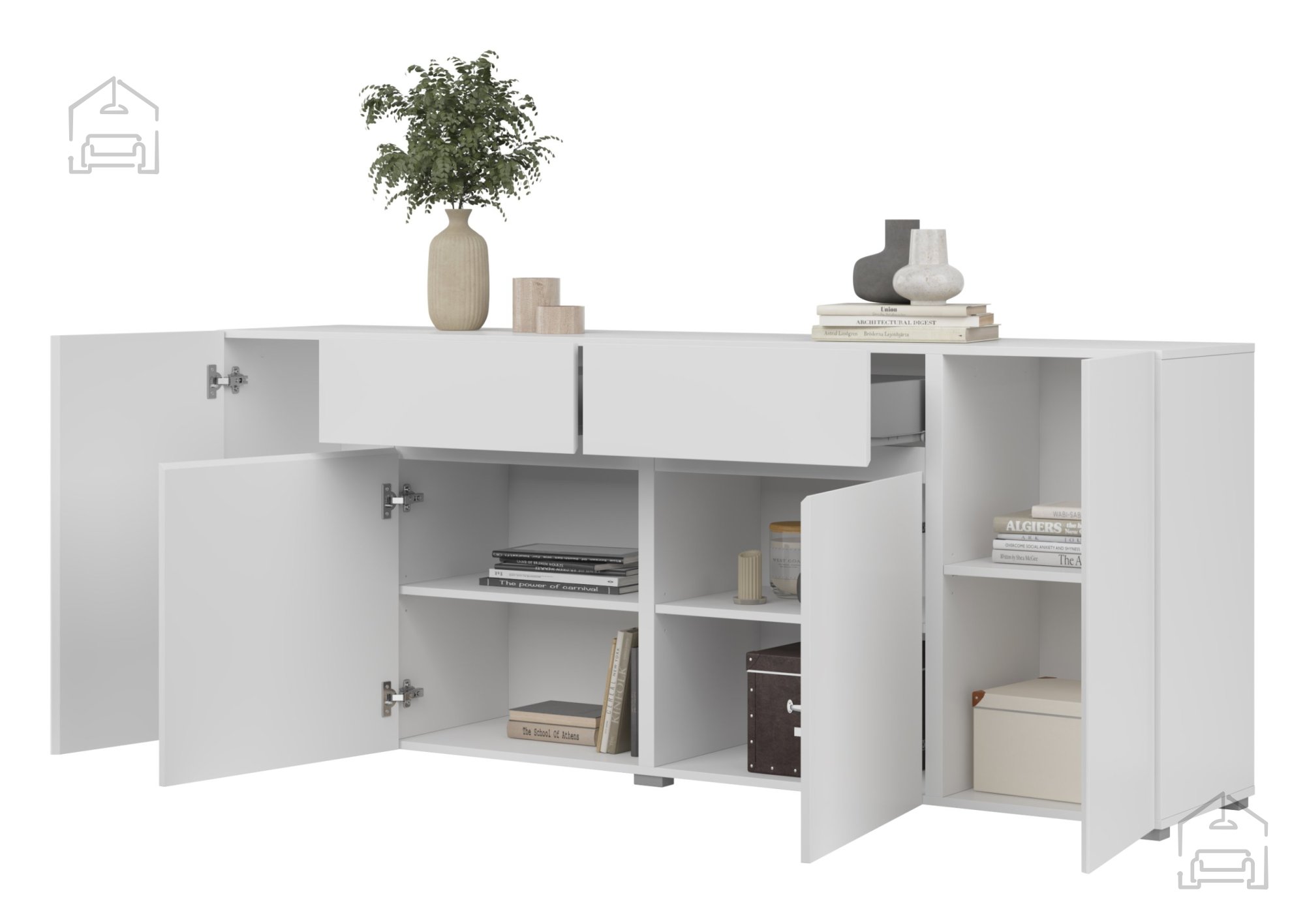 Das Sideboard verfügt über vier Türen und zwei geräumige Laden, wodurch sich verschiedene Aufbewahrungsmöglichkeiten ergeben. Hinter den Türen befinden sich praktische Einlegeböden für Geschirr, Textilien oder Dokumente. Die Laden eignen sich ideal für kleinere Gegenstände wie Besteck, Tischwäsche oder Haushaltsaccessoires. Dank des Push-to-Open-Mechanismus ist die Handhabung angenehm und leise – ganz ohne störende Griffe, die das klare Design unterbrechen würden.