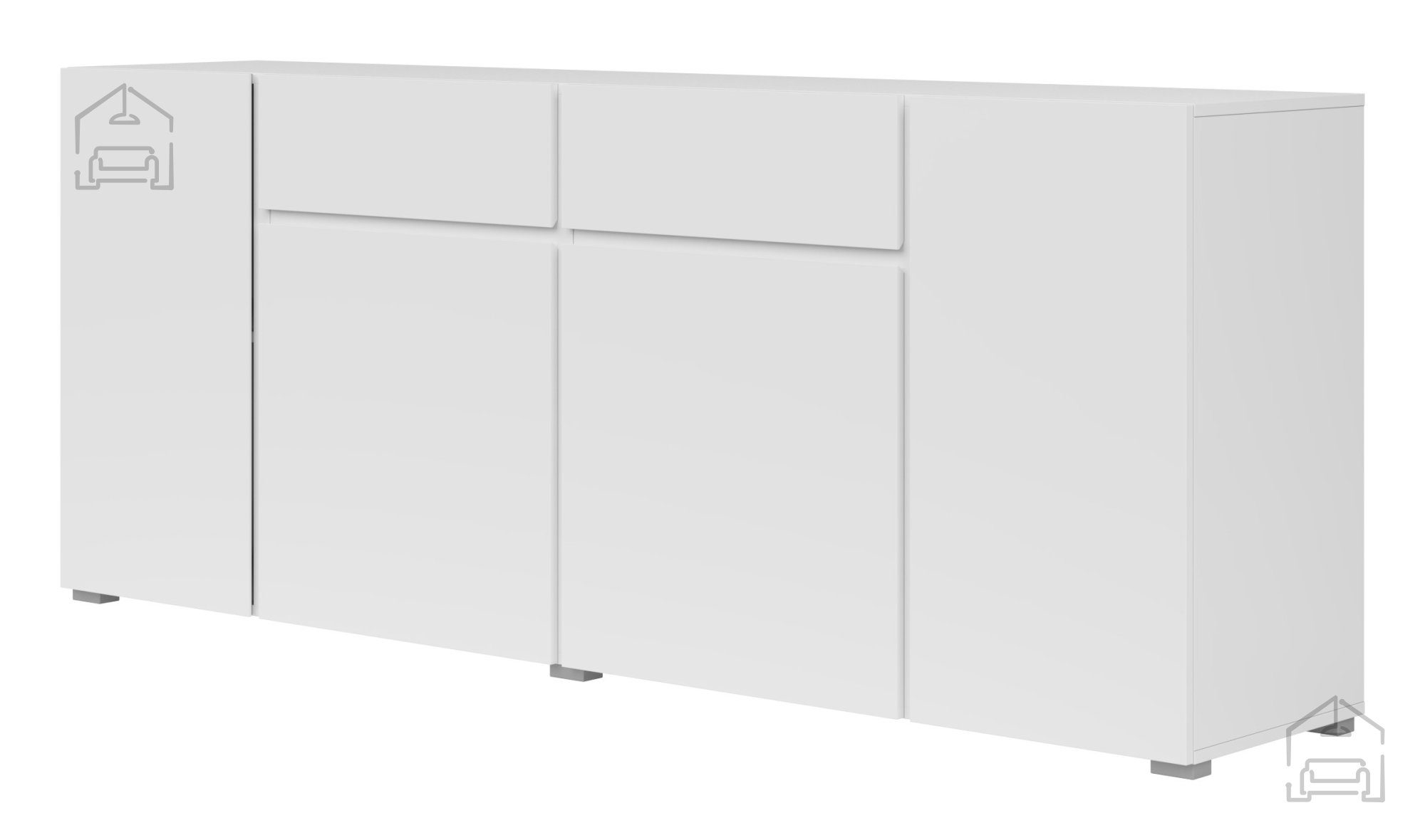 Das Sideboard besteht aus laminierter Spanplatte, die für ihre Langlebigkeit und leichte Pflege bekannt ist. Die laminierte Oberfläche ist kratz- und feuchtigkeitsbeständig und somit ideal für den täglichen Gebrauch. Das weiße Finish betont die Helligkeit des Raumes und sorgt für ein Gefühl von Großzügigkeit – besonders vorteilhaft in kleineren Wohnungen oder Räumen mit wenig Tageslicht.