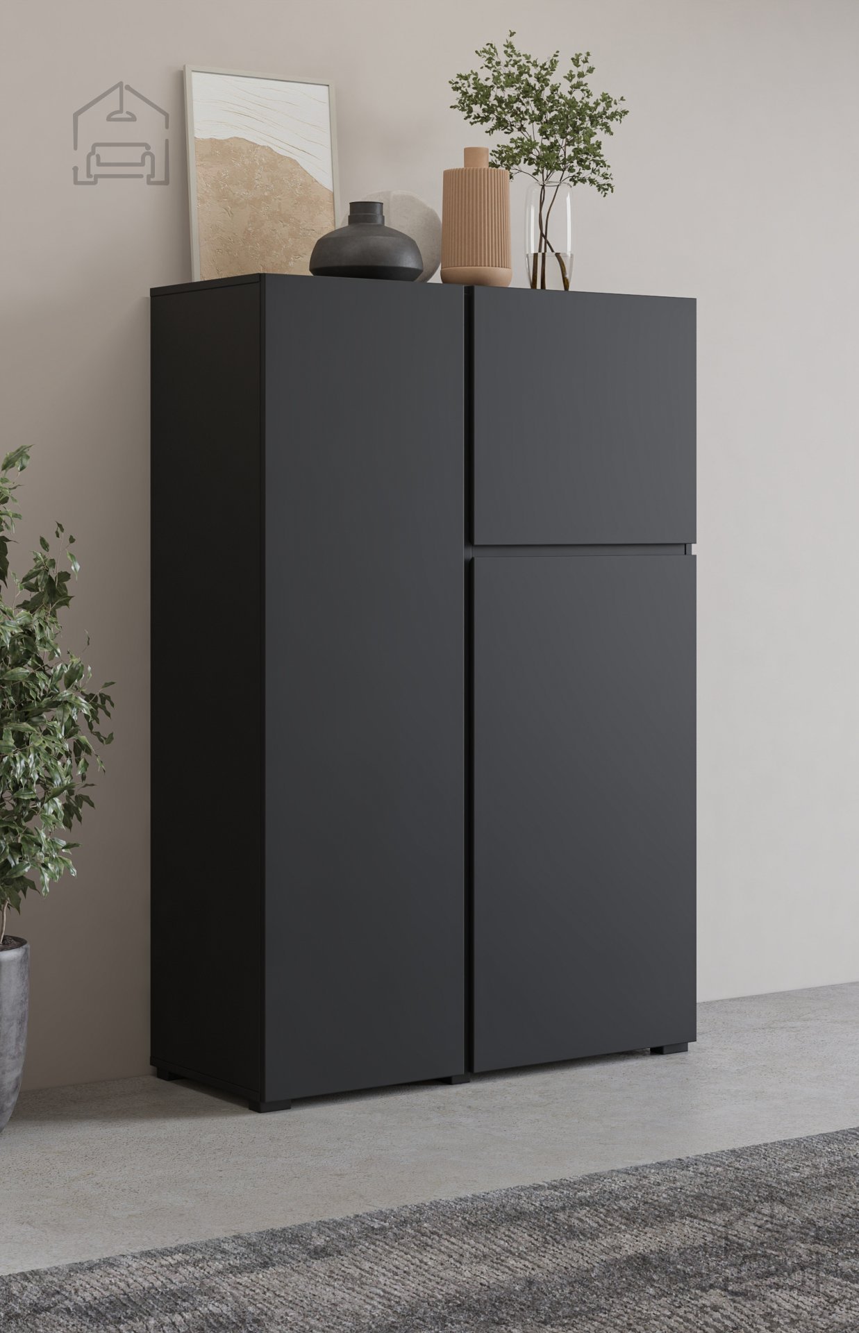Die elegante und moderne hohe Kommode Asymetric in der Farbe Schwarzer Onyx ist das ideale Möbelstück für alle, die Wert auf zeitgemäßes Design und Funktionalität legen. Gefertigt aus hochwertiger, laminierter Spanplatte und mit einem markanten geometrischen Muster versehen, bringt sie einen Hauch moderner Formgebung in jeden Raum. Das Modell mit der Bezeichnung 24W3OA46 lässt sich problemlos in Wohn-, Schlaf- oder Vorzimmer integrieren und sorgt dort für ein aufgeräumtes und stilvolles Ambiente.