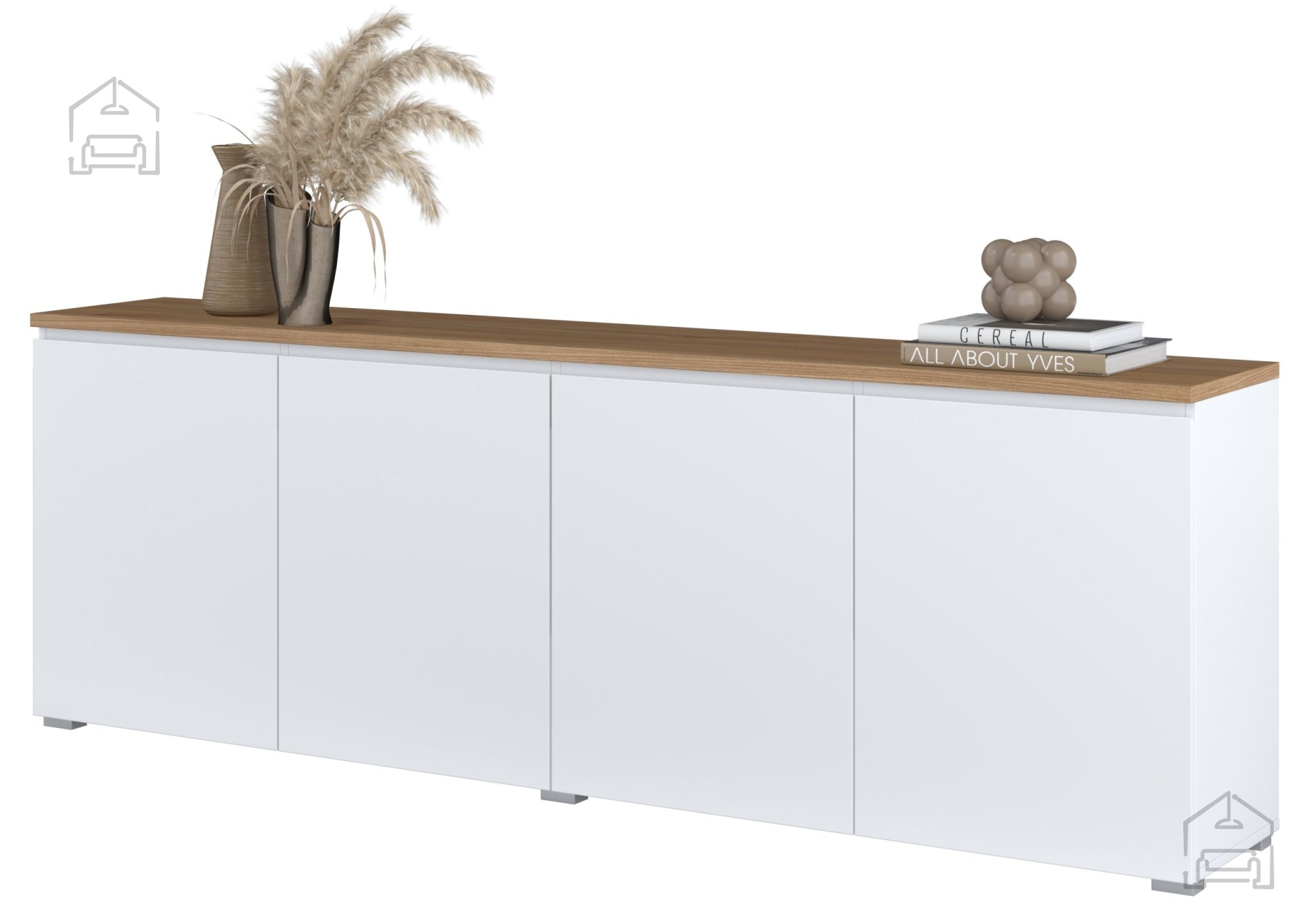 Mit ihren Maßen von 200x35x68 cm bietet die Kommode Modo 247VOJ25 reichlich Platz, ohne den Raum zu überladen. Die vier Türen gliedern das Innere in mehrere Bereiche, ideal zur Aufbewahrung von Dokumenten, Textilien, Geschirr oder Alltagsgegenständen. Durch die geringe Tiefe von 35 cm ist sie eine ausgezeichnete Wahl für Flure, Wohnzimmer oder Essbereiche, wo Platz optimal genutzt werden soll.