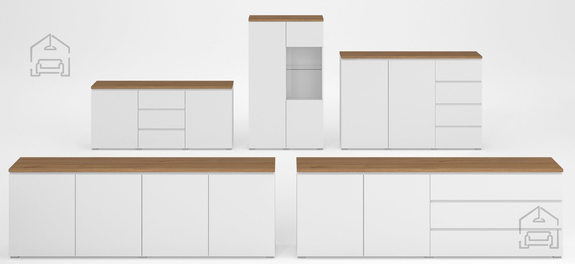 Die Kombination aus Weiß und dem Farbton Eiche Mauvella wurde mit Blick auf aktuelle Einrichtungstrends gewählt. Weiß vermittelt Leichtigkeit und Klarheit, während der Eichenton natürliche Wärme und Holzstruktur ins Spiel bringt. Gemeinsam erzeugen sie einen ausgewogenen Kontrast, der sich sowohl mit neutralen als auch mit kräftigeren Farbtönen gut kombinieren lässt.