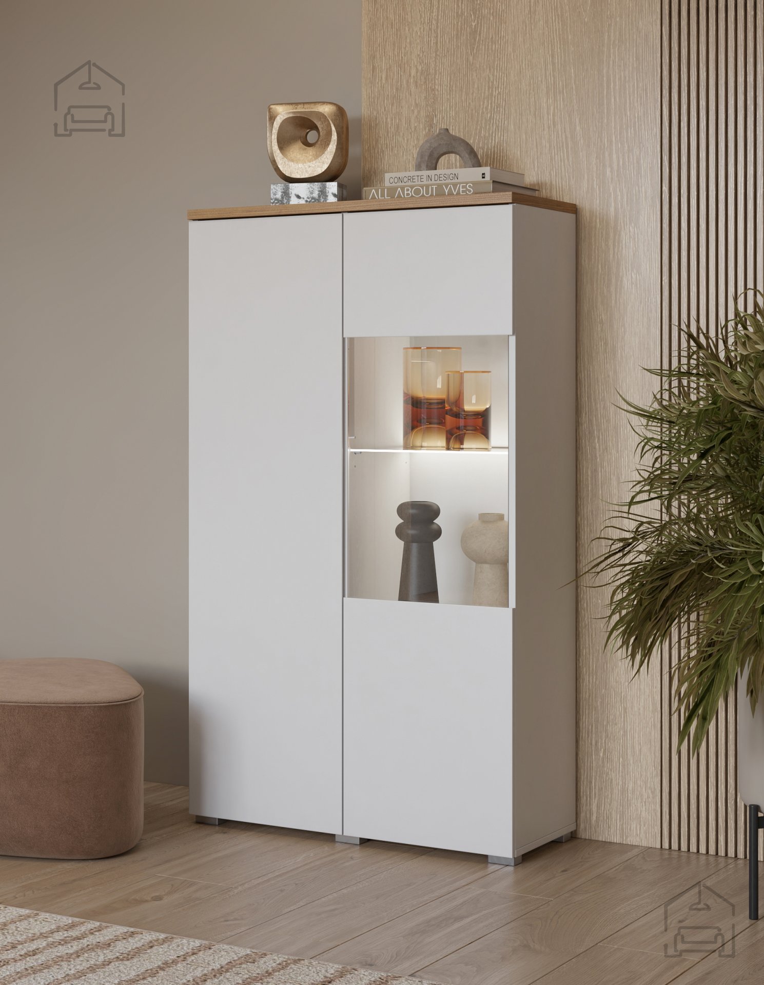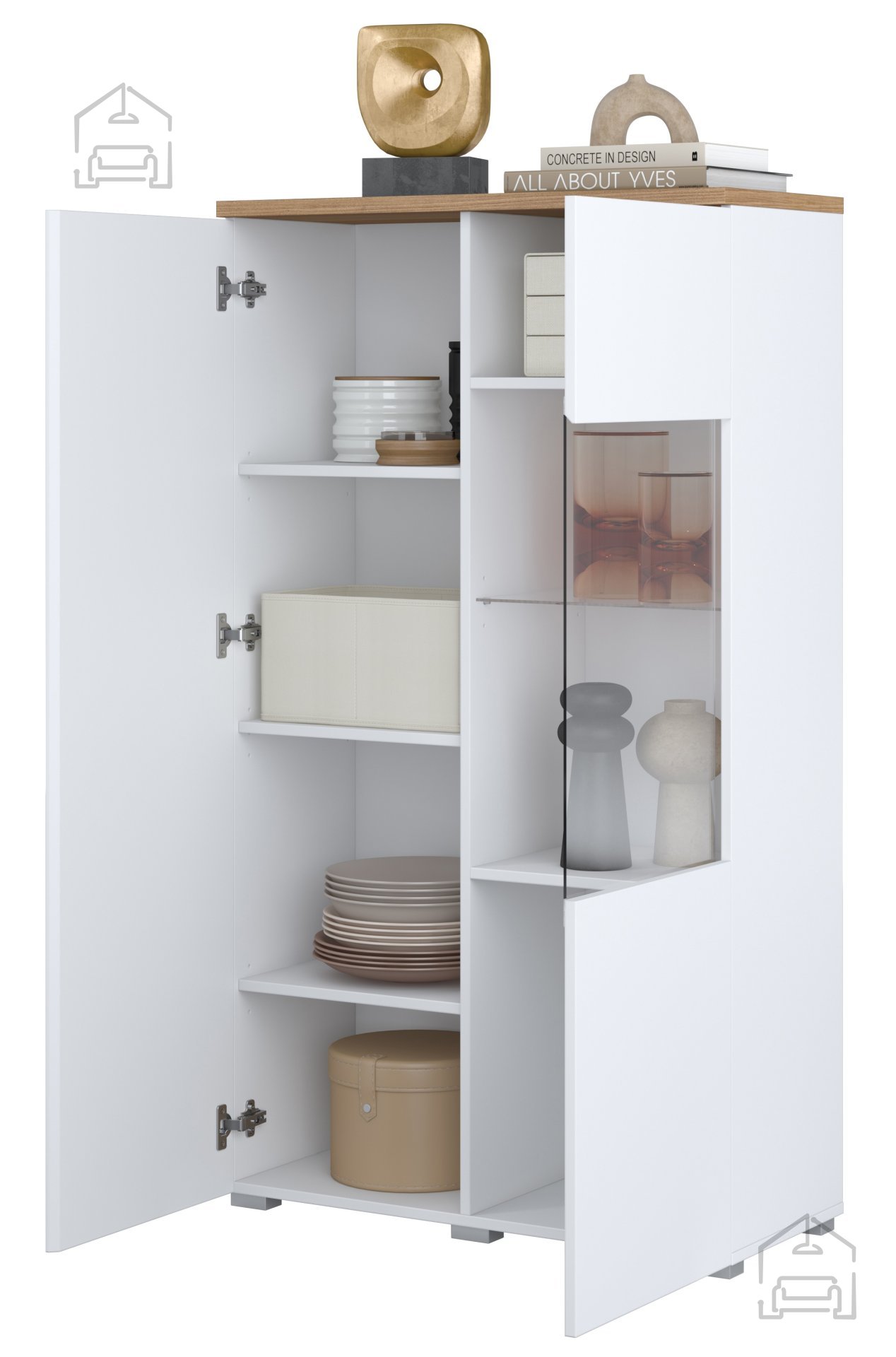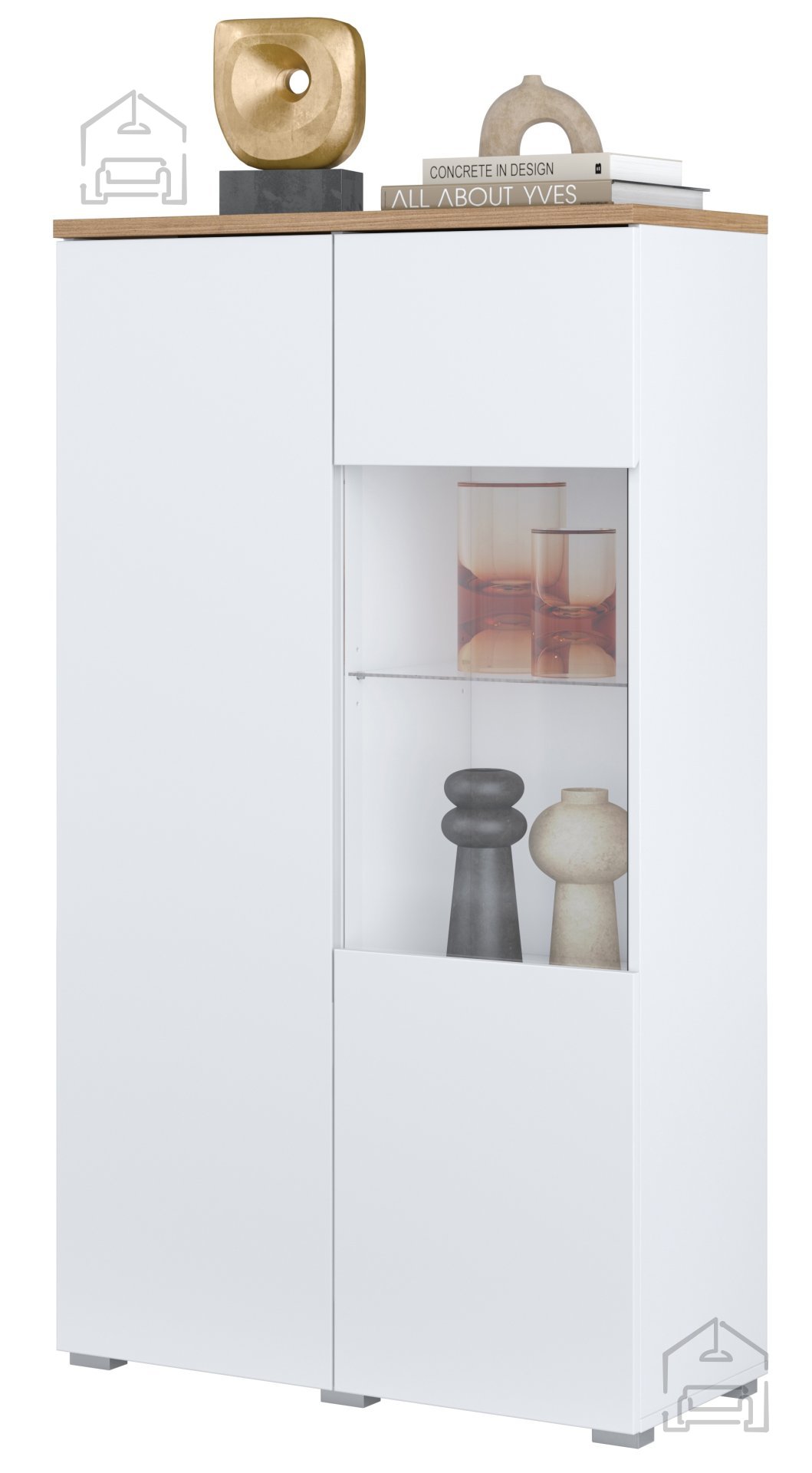 Die Vitrine Modo 247VOJ44 überzeugt nicht nur optisch, sondern auch praktisch. Sie bietet Platz für dekorative Accessoires, Erinnerungsstücke oder Alltagsgegenstände und ermöglicht zugleich diskretes Verstauen hinter geschlossenen Türen. Dank der durchdachten Innenaufteilung findet jedes Teil seinen Platz – für ein aufgeräumtes und stilvolles Ambiente.