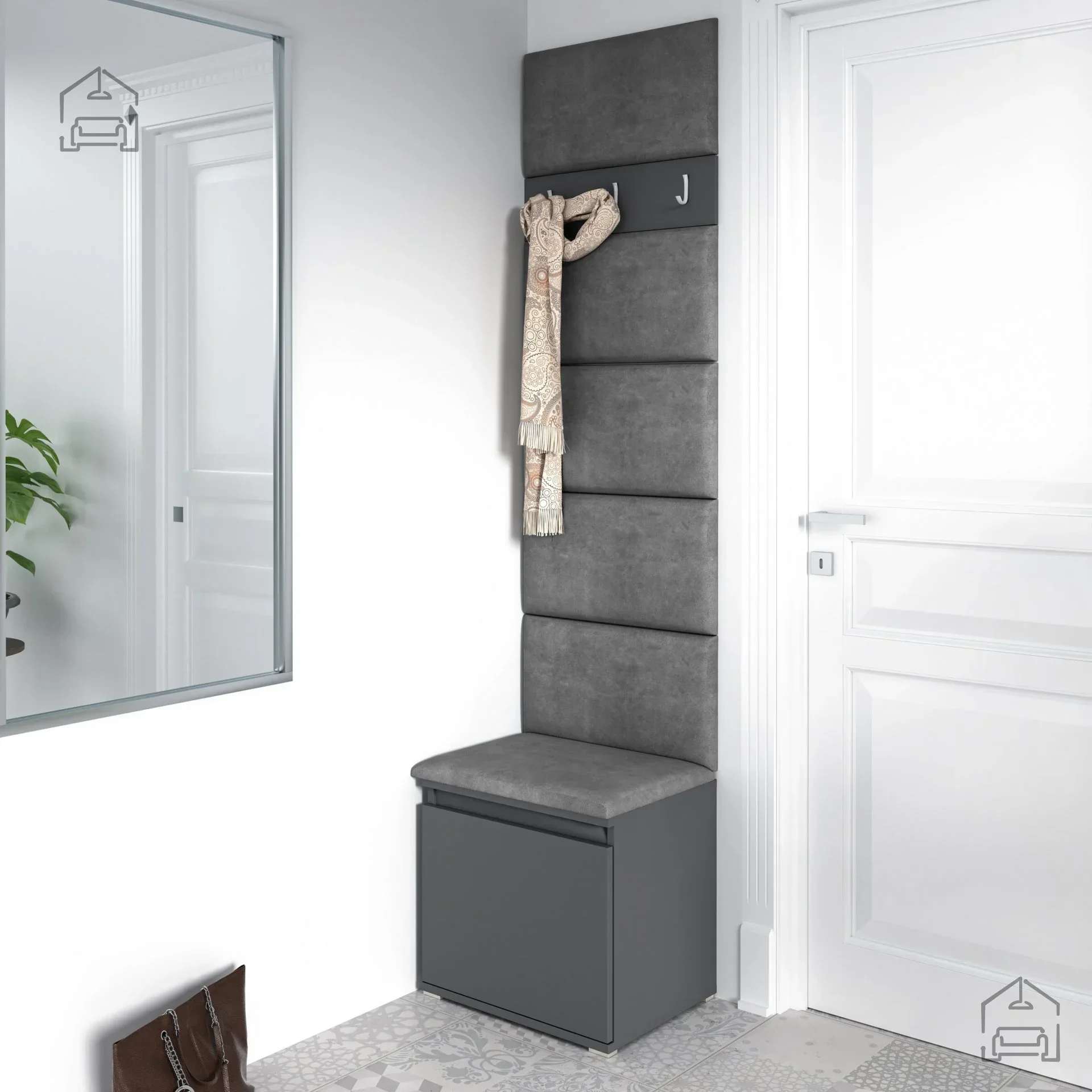 Jedes Element des Emi 7 Sets ist auf den täglichen Gebrauch ausgelegt. Das Garderobenpaneel bietet schnellen Zugriff auf häufig genutzte Kleidungsstücke, während der Schuhschrank für Ordnung bei der Aufbewahrung sorgt. Die gepolsterten Paneele sind nicht nur ein optisches Highlight, sondern dienen auch als bequeme Rückenlehne beim An- oder Ausziehen. Dank der Klebebefestigung lassen sie sich einfach und ohne zusätzliches Werkzeug montieren.