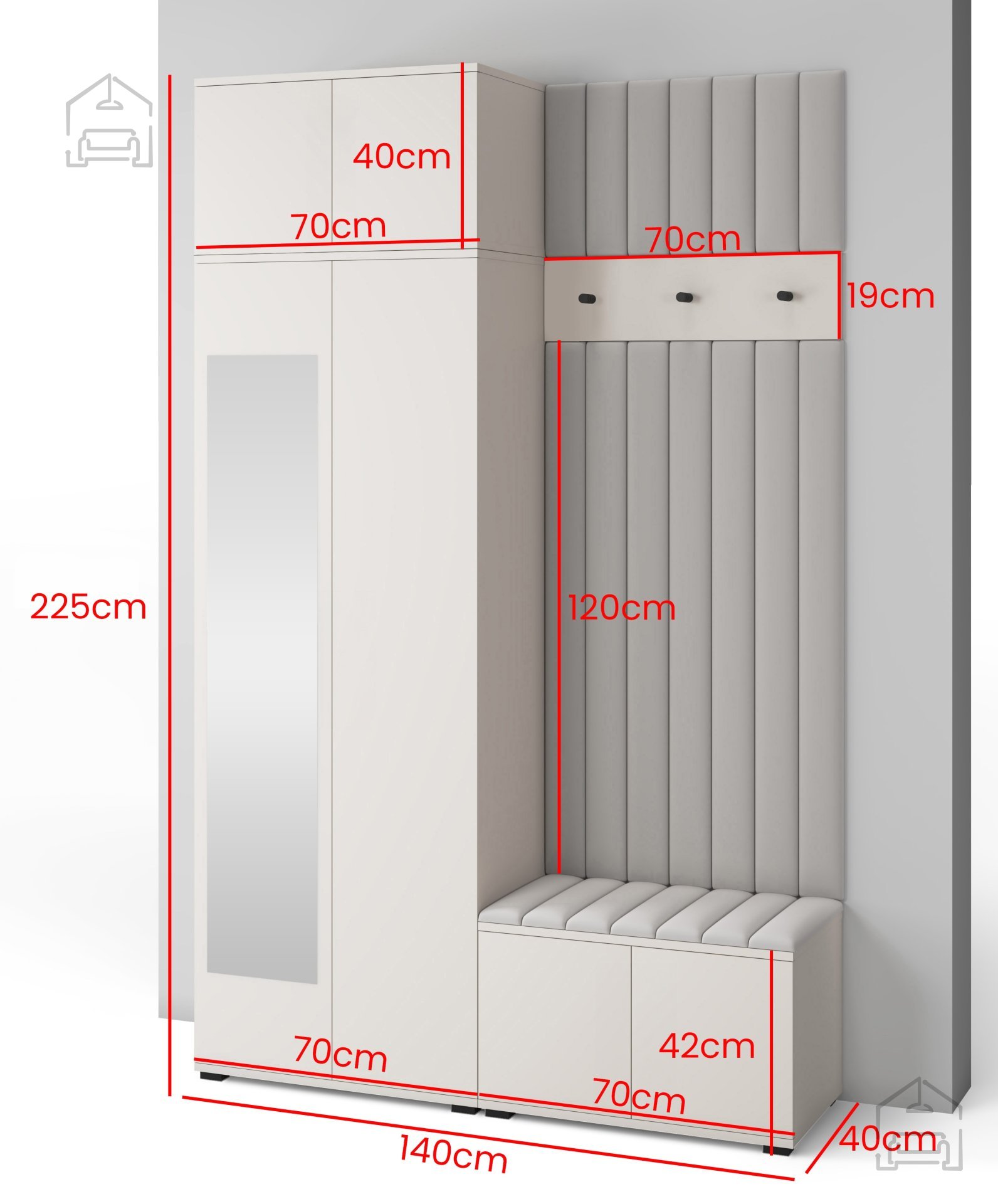 Das Set Bianco 14 umfasst alle wichtigen Elemente, die Sie für eine praktische und zugleich ansprechende Gestaltung Ihres Vorraums brauchen. Herzstück ist ein 70 cm breiter Schrank, in dem Kleidung, Schuhe oder Accessoires ihren Platz finden. Zwei Erweiterungselemente, die zugleich als Garderobenpaneel und Sitzbank dienen, sorgen für zusätzlichen Komfort beim An- und Ausziehen. Zusammen mit einem separaten Wandhaken und gepolsterten Wandpaneelen entsteht ein harmonisches Gesamtbild, bei dem jedes Teil sowohl funktional als auch optisch aufeinander abgestimmt ist.