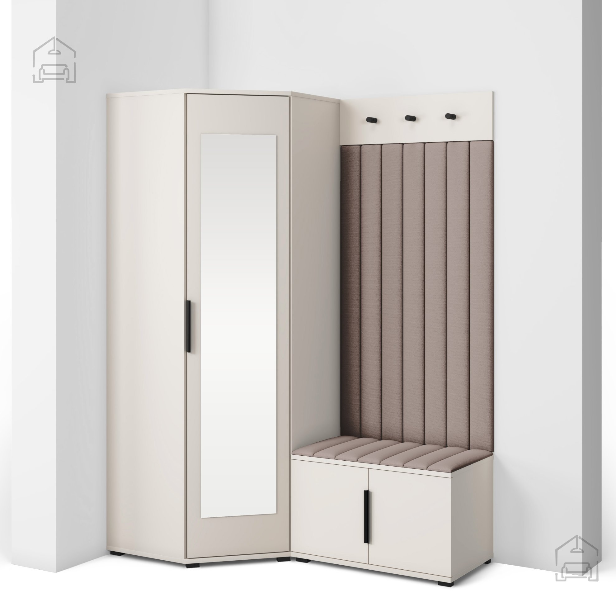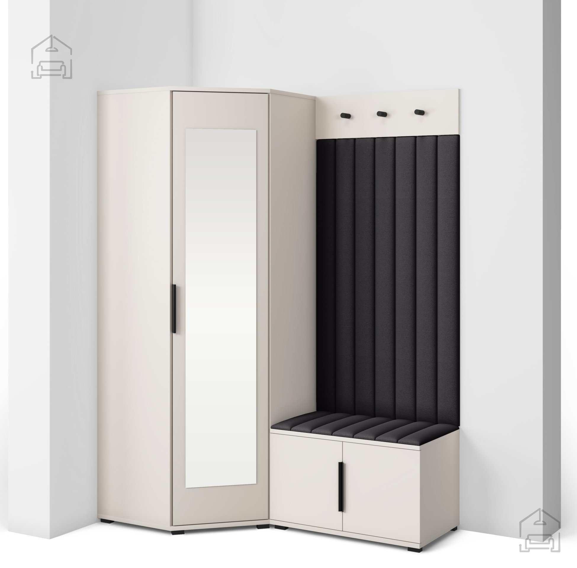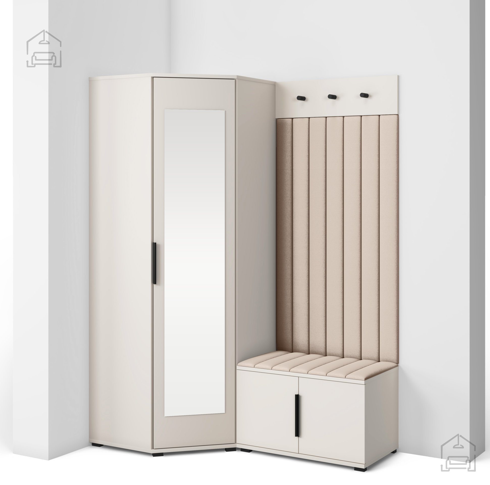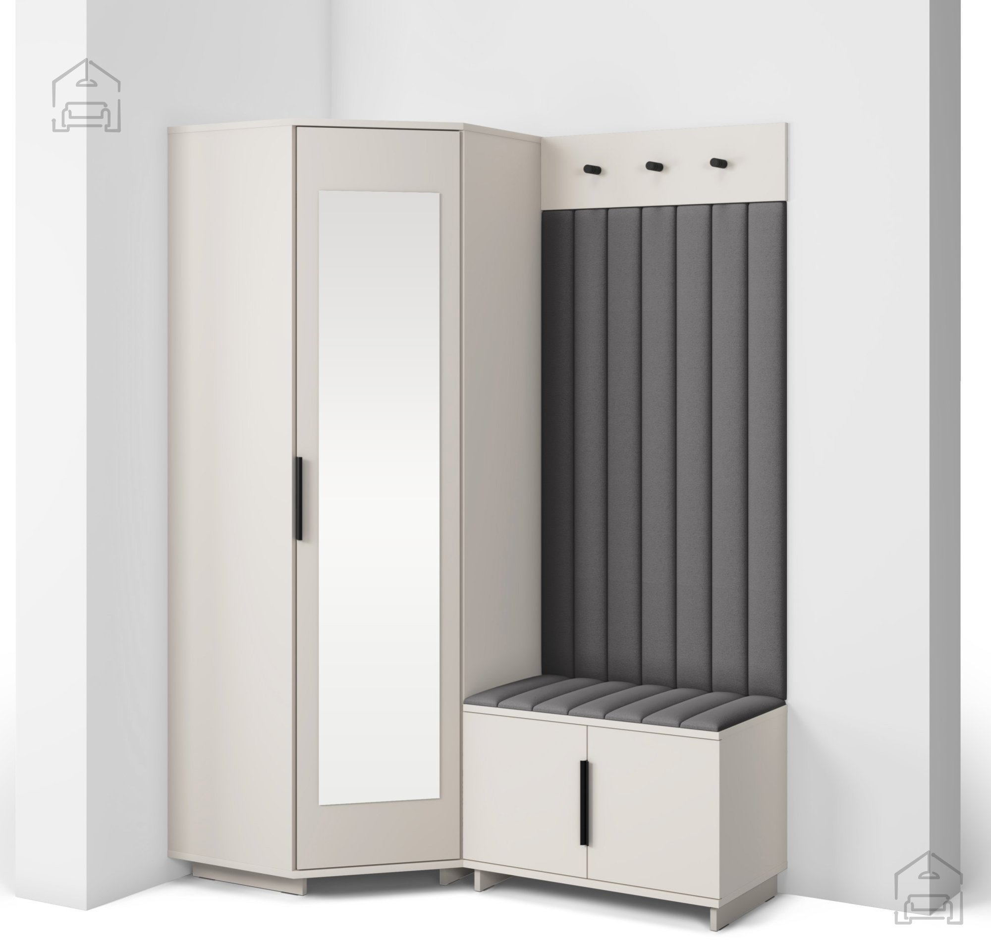 Das Push‑to‑open‑System ermöglicht ein leises, griffloses Öffnen, während die schwarzen Metallgriffe einen ästhetischen Kontrast bieten und bei Bedarf zusätzliche Bedienmöglichkeiten schaffen. Die Innenaufteilung der einzelnen Elemente sorgt für eine übersichtliche Organisation von Kleidung, Schuhen und Accessoires – so bleibt der Eingangsbereich ordentlich und strukturiert. Die gepolsterten Wandpaneele schützen zusätzlich die Wand vor Abnutzung und bieten bequemen Komfort beim An- oder Ausziehen.