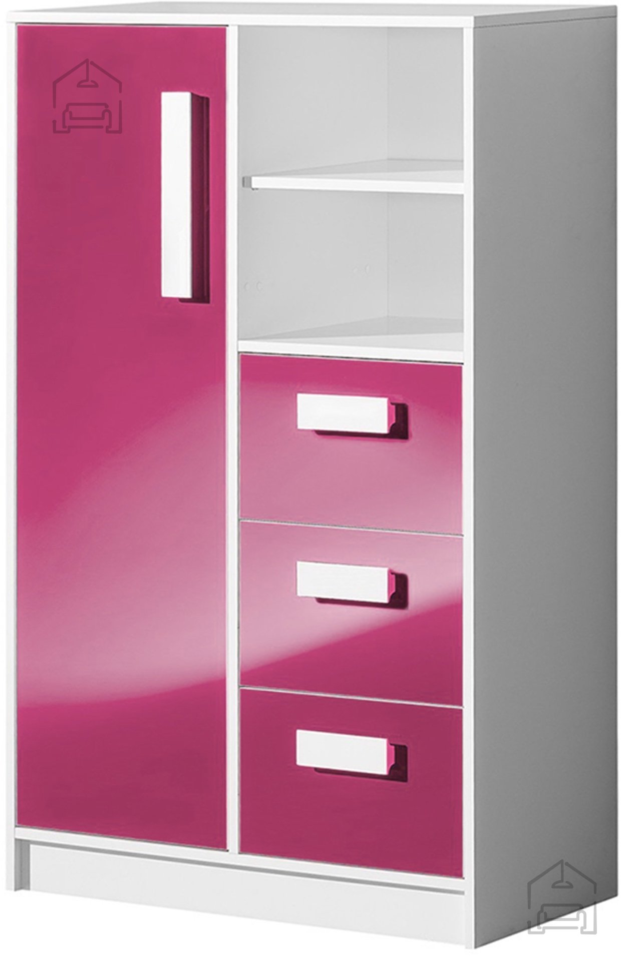 Der Korpus der Kommode ist in elegantem Weiß gehalten, was einen klaren, sauberen Look schafft und das Kombinieren mit anderen Möbelstücken erleichtert. Die rosafarbene Front sorgt für einen Hauch von Wärme und Sanftheit – ideal für Mädchenzimmer oder Räume, in denen Sie eine gemütliche und frische Atmosphäre schaffen möchten. Besonders hervorzuheben sind die farbigen Griffe – erhältlich in Weiß, Grün, Rot, Blau, Violett und Grau – mit denen sich das Erscheinungsbild der Kommode ganz nach Ihrem Geschmack oder der Farbgestaltung des Raumes anpassen lässt.