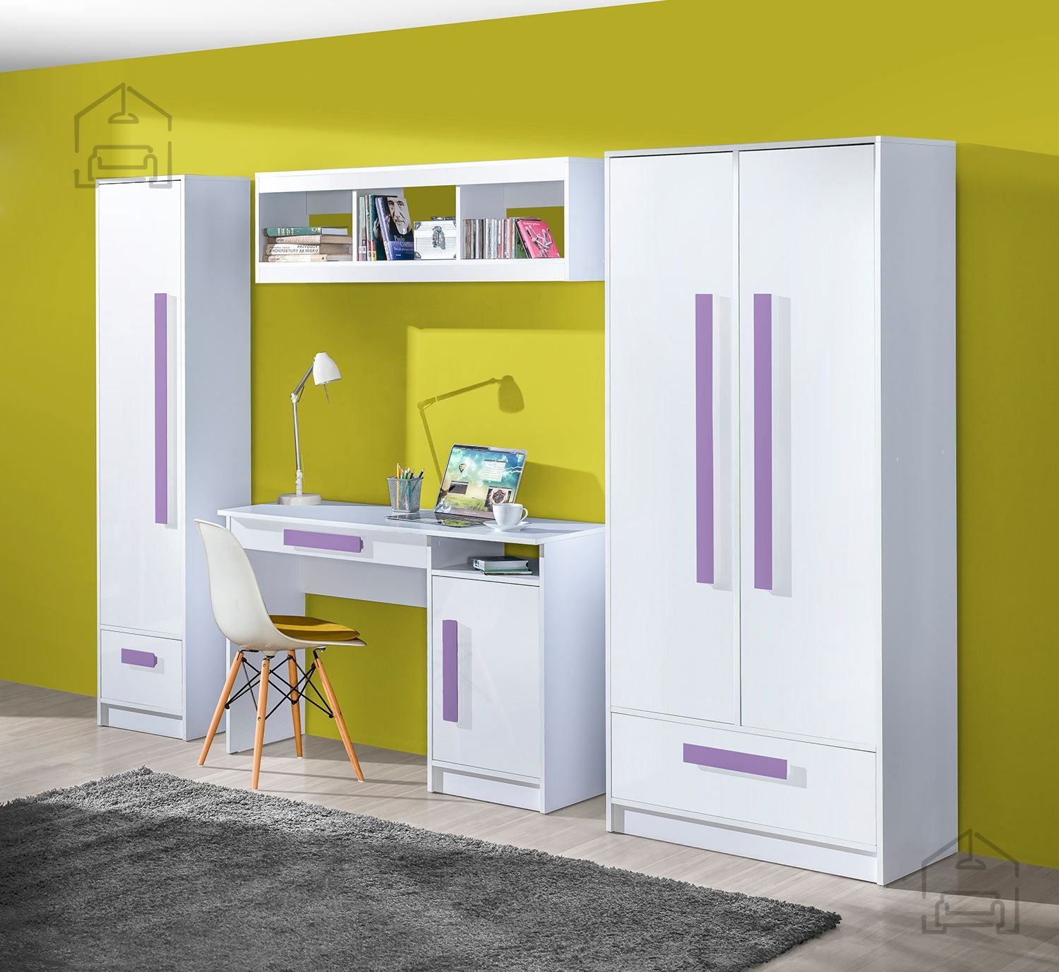 Das Kinderzimmer Guliver – Domel ist als durchdachte Komplettlösung für moderne Kinderzimmer konzipiert, in denen Funktionalität, Sicherheit und Ästhetik harmonisch miteinander verschmelzen. Gefertigt wird es aus einer hochwertigen laminierten Spanplatte mit 16 mm Stärke, die Stabilität und eine lange Lebensdauer garantiert. Die Oberfläche ist glatt, pflegeleicht und widerstandsfähig gegen tägliche Beanspruchung – ein wichtiges Kriterium gerade im Kinderzimmer. Der weiße Korpus und die weißen Fronten schaffen einen hellen, großzügigen Eindruck, der sich wunderbar mit unterschiedlichen Farbakzenten kombinieren lässt. Die Griffe sind in mehreren Farben erhältlich – Weiß, Grün, Rot, Blau, Violett und Grau – und ermöglichen so eine individuelle Gestaltung je nach Alter und Persönlichkeit des Kindes.