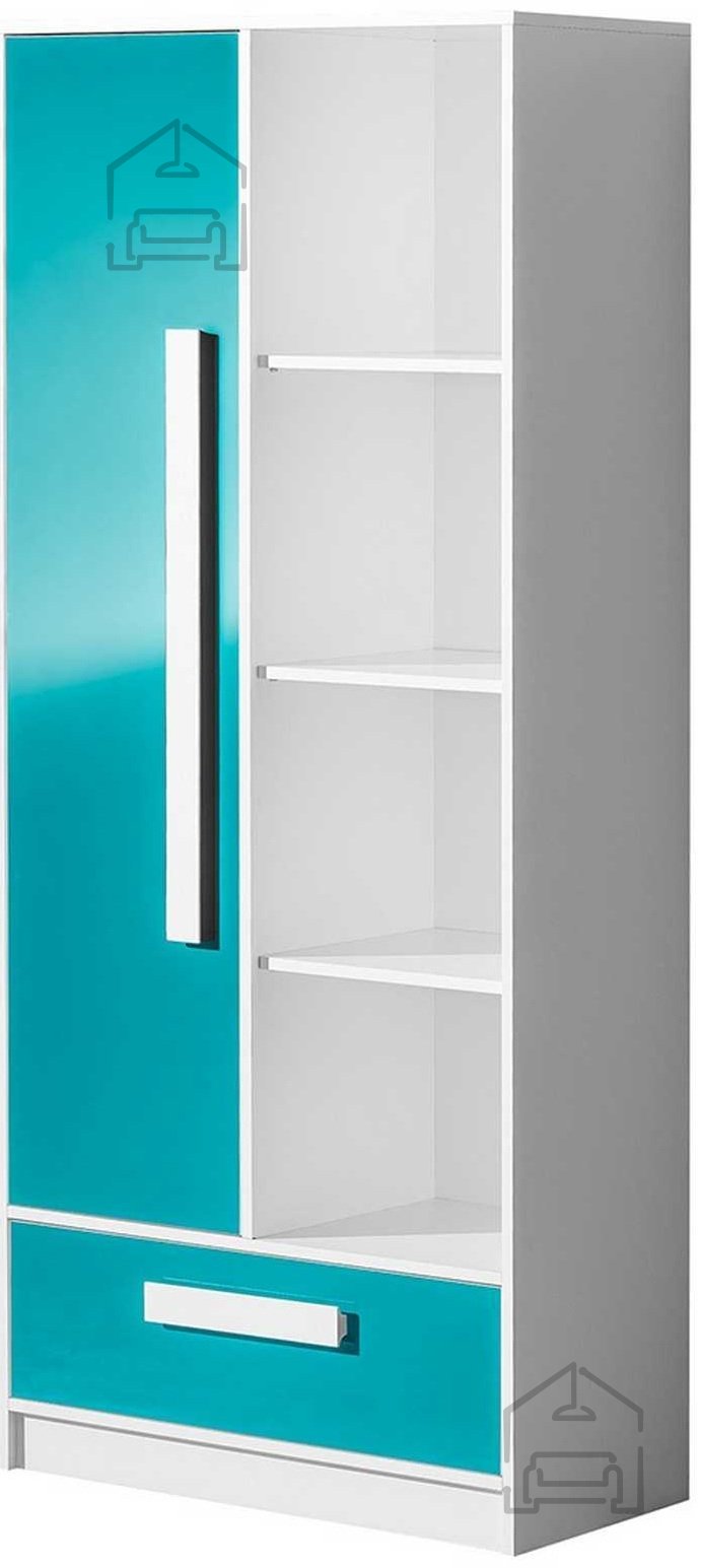 Das Regal Guliver 03 – Domel zieht mit seiner türkisen Front und dem weißen Korpus alle Blicke auf sich. Diese Farbkombination vermittelt Frische, Helligkeit und eine spielerische Note – perfekt für Räume, in denen etwas Farbe willkommen ist. Ein besonderer Akzent sind die Griffe in verschiedenen Farben – Weiß, Grün, Rot, Blau, Violett und Grau. So können Sie das Regal ganz nach Ihrem Geschmack oder passend zur Raumgestaltung gestalten. Die Griffe bestehen aus hochwertigem Kunststoff, der angenehm in der Hand liegt und abriebfest ist.