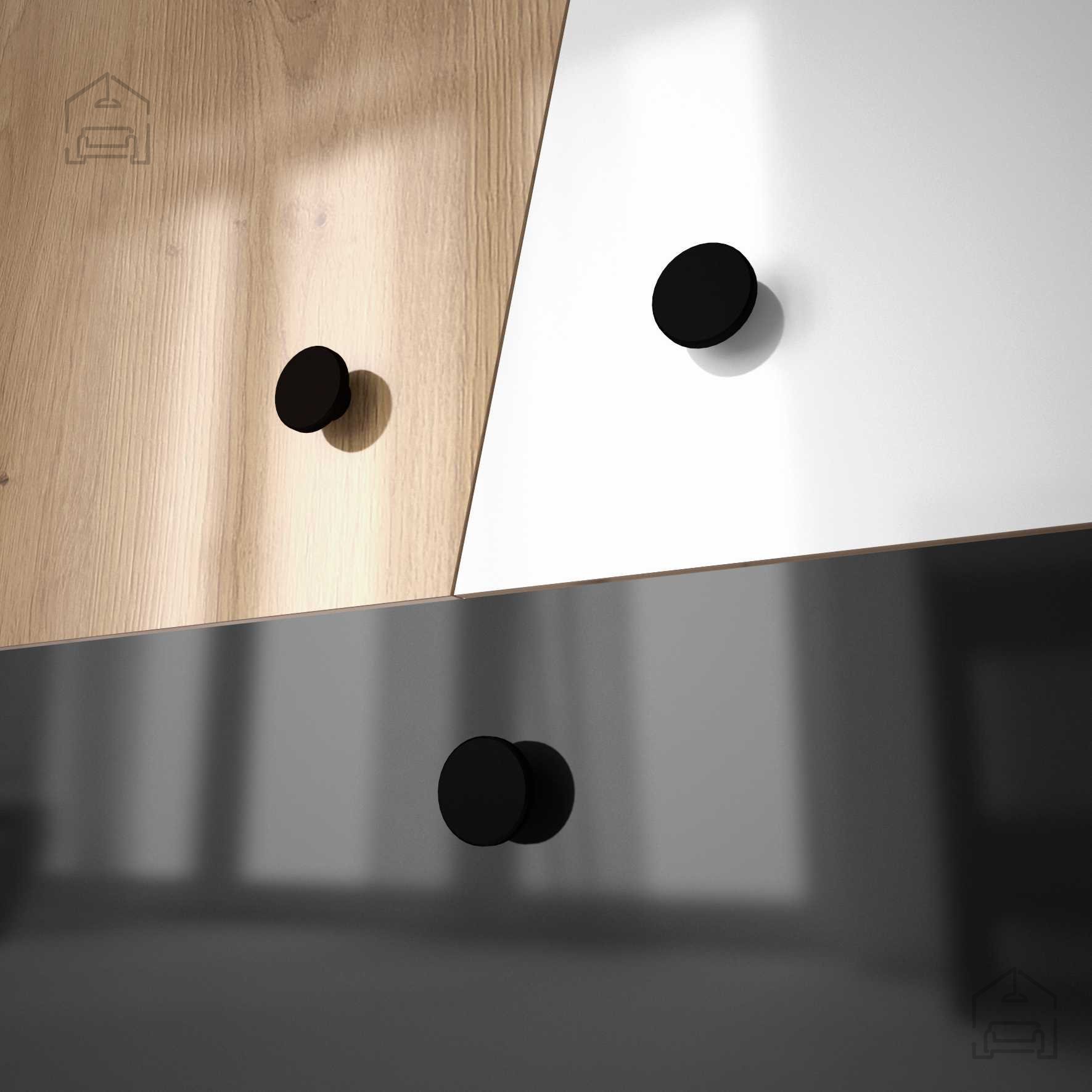 Ausgestattet ist der Schrank mit formschönen Griffen in drei Farbvarianten: Weiß, Schwarz oder Grau. Durch die Wahl der Griff-Farbe lässt sich der Schrank perfekt an andere Möbel oder Accessoires im Raum anpassen. Die ergonomisch geformten Griffe liegen angenehm in der Hand und sind auf eine lange Nutzungsdauer ausgelegt.