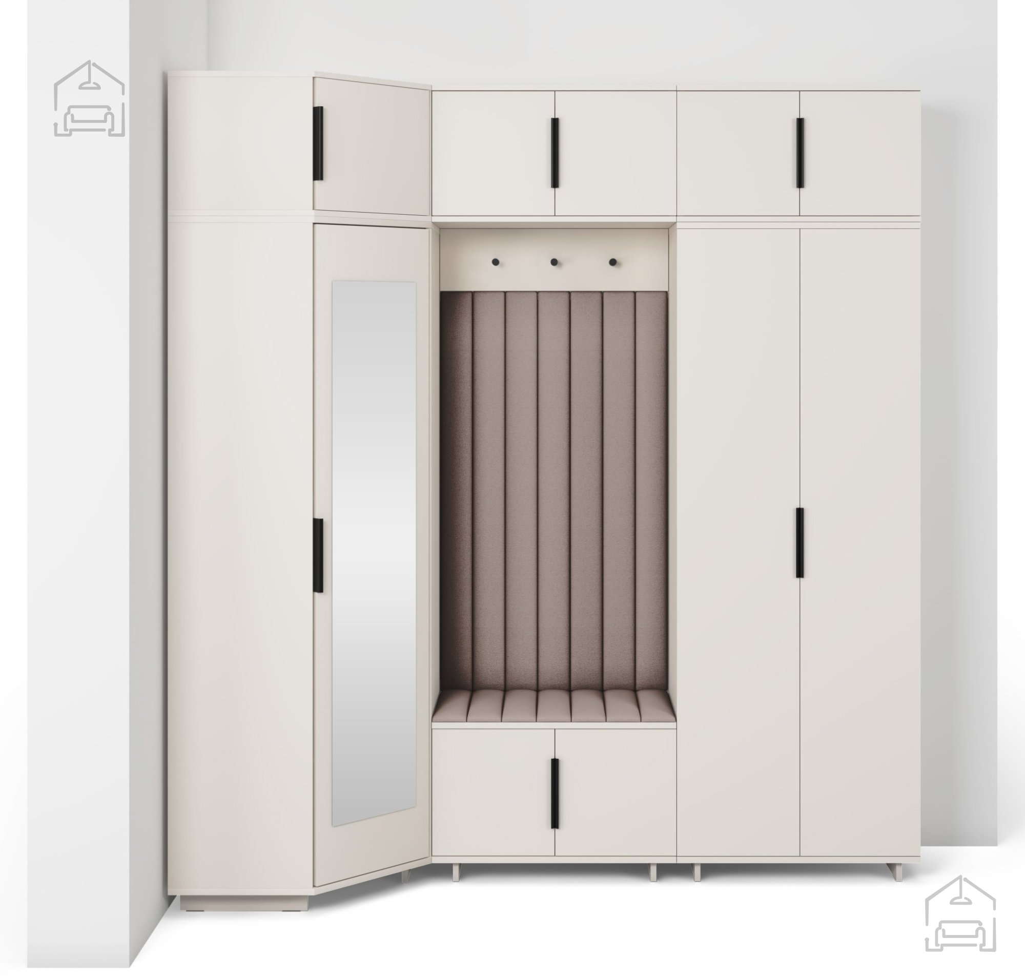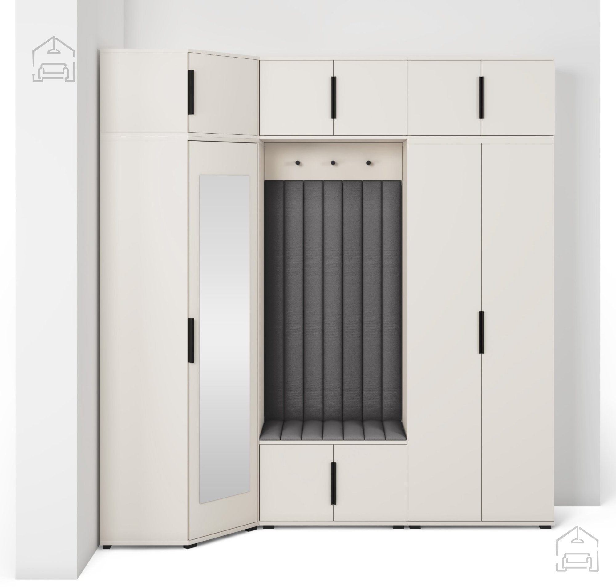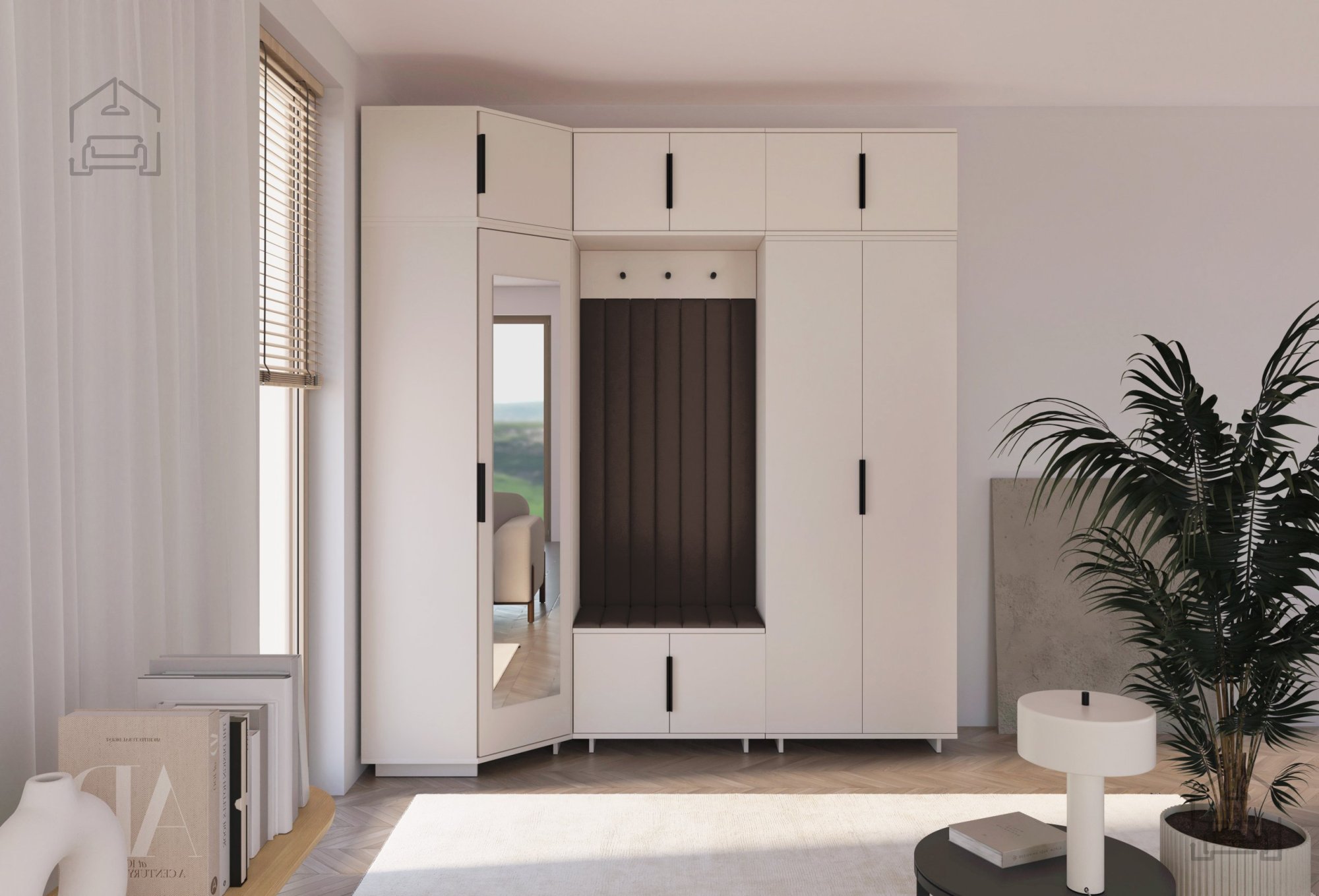 Durch die gut durchdachte Anordnung der Elemente lässt sich der verfügbare Platz effizient nutzen. In größeren Vorzimmern kann das Set über zwei Wände verteilt werden, in kleineren Räumen findet es als kompakte Einheit an einer Wand Platz. Spiegel und Garderobenpaneel erleichtern den Alltag, während die geräumigen Schränke alles Wichtige griffbereit halten. Die gepolsterten Paneele dienen zugleich als dekoratives Element und als bequeme Rückenlehne beim Anziehen der Schuhe.