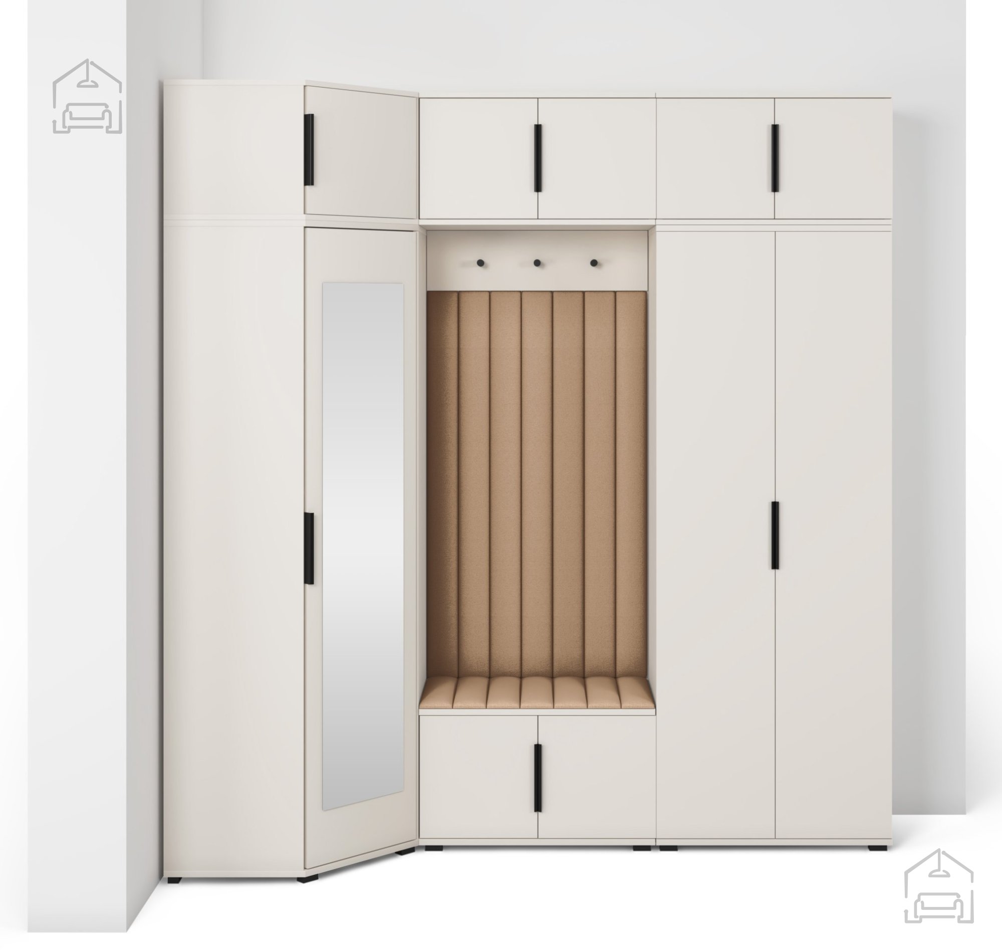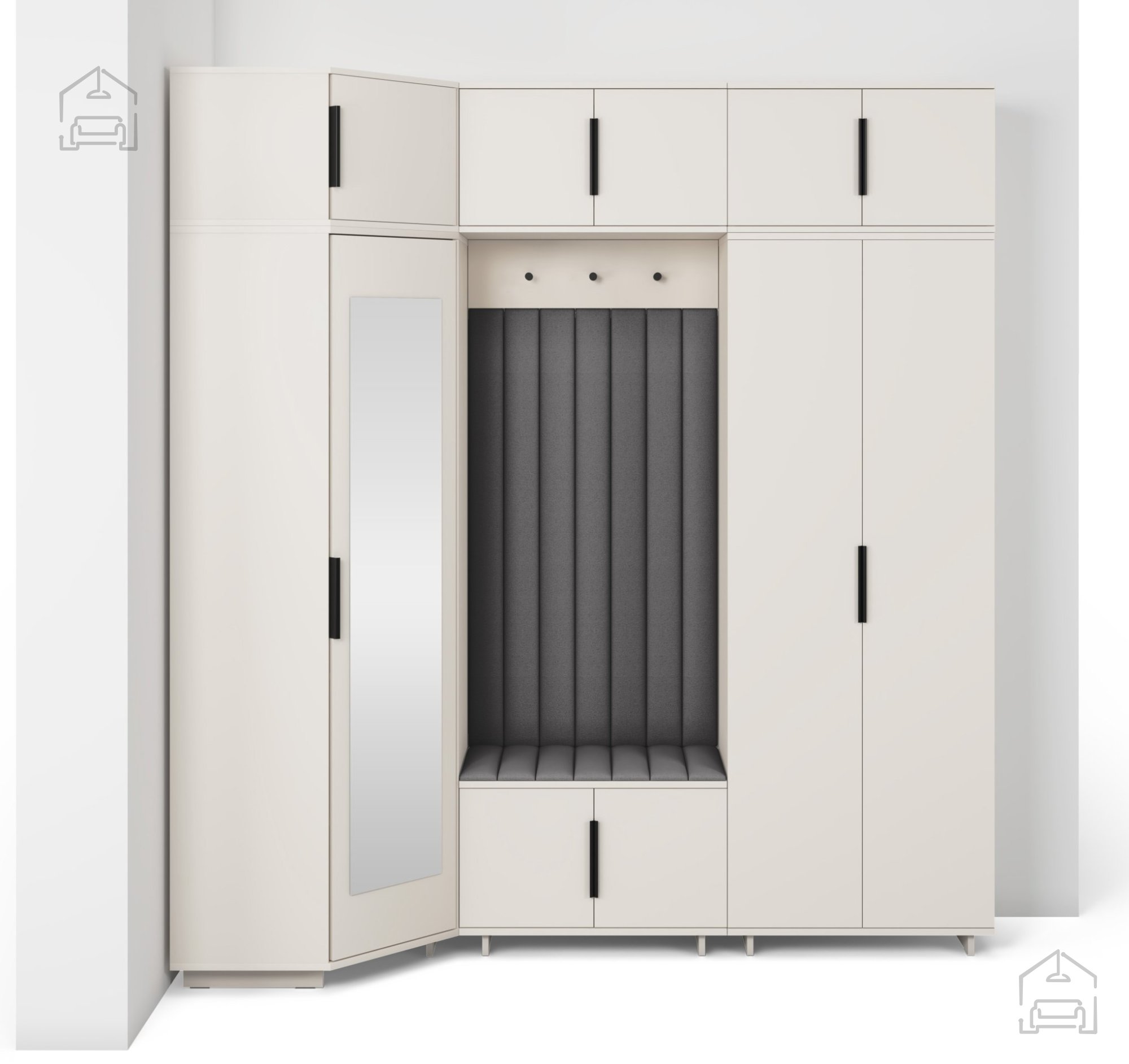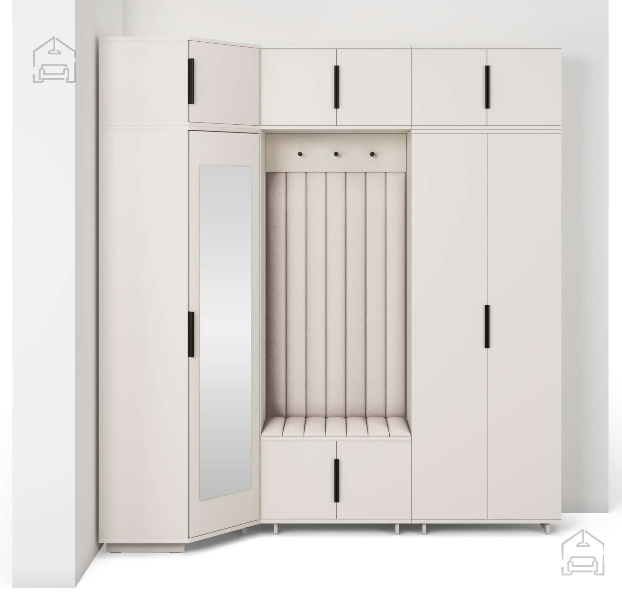 Durch die gut durchdachte Anordnung der Elemente lässt sich der verfügbare Platz effizient nutzen. In größeren Vorzimmern kann das Set über zwei Wände verteilt werden, in kleineren Räumen findet es als kompakte Einheit an einer Wand Platz. Spiegel und Garderobenpaneel erleichtern den Alltag, während die geräumigen Schränke alles Wichtige griffbereit halten. Die gepolsterten Paneele dienen zugleich als dekoratives Element und als bequeme Rückenlehne beim Anziehen der Schuhe.