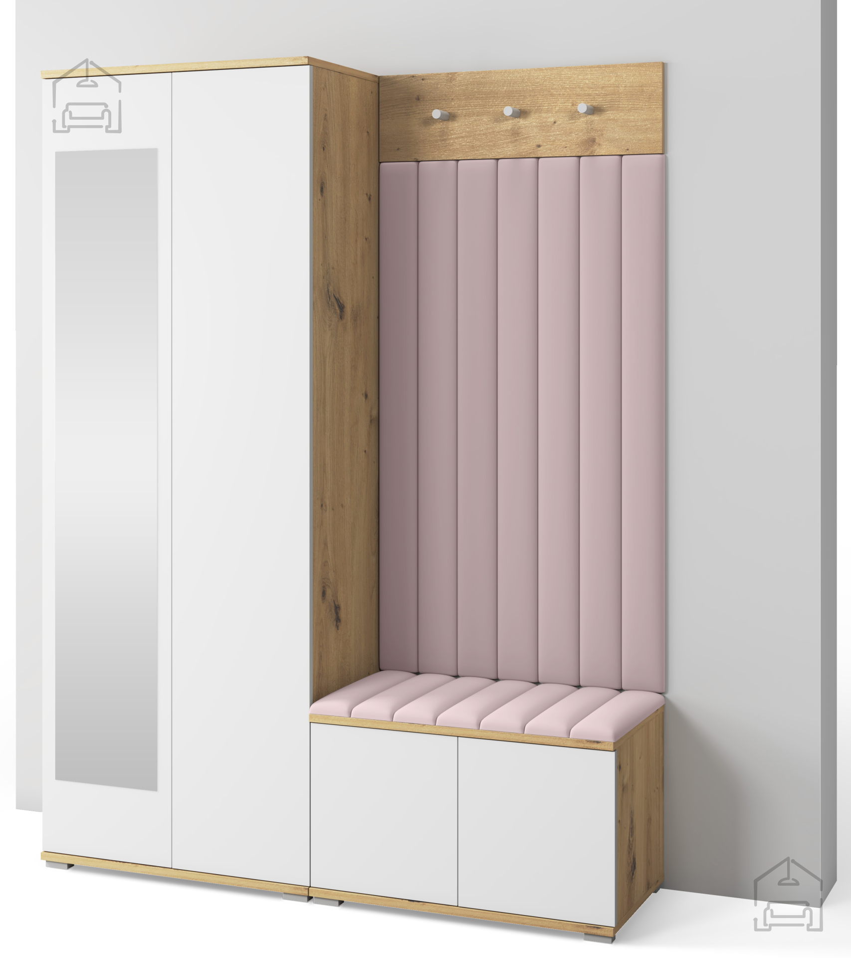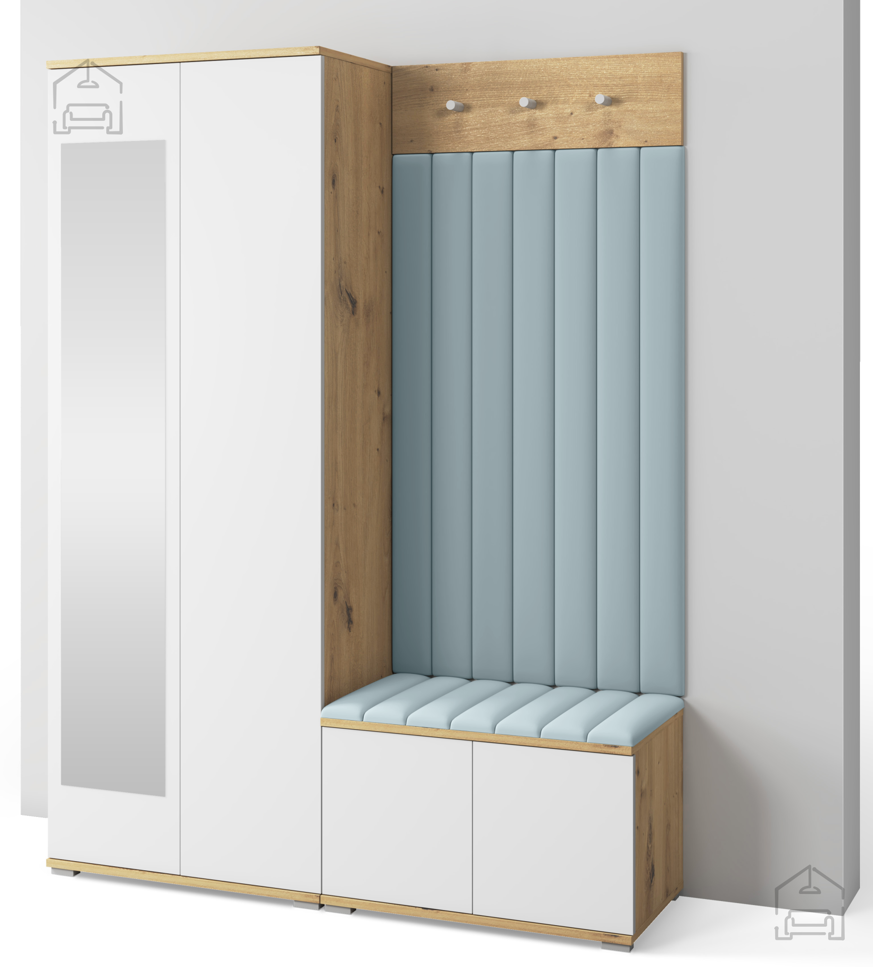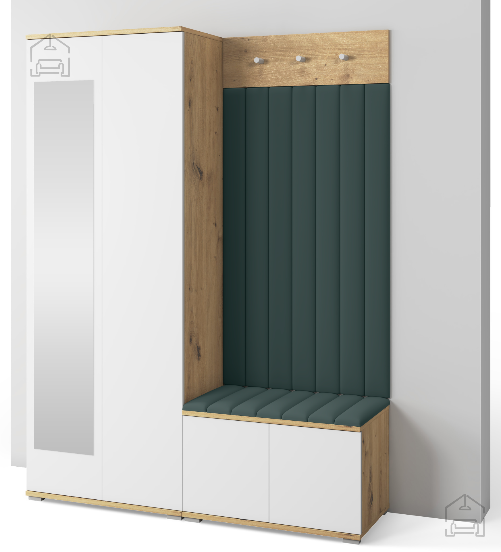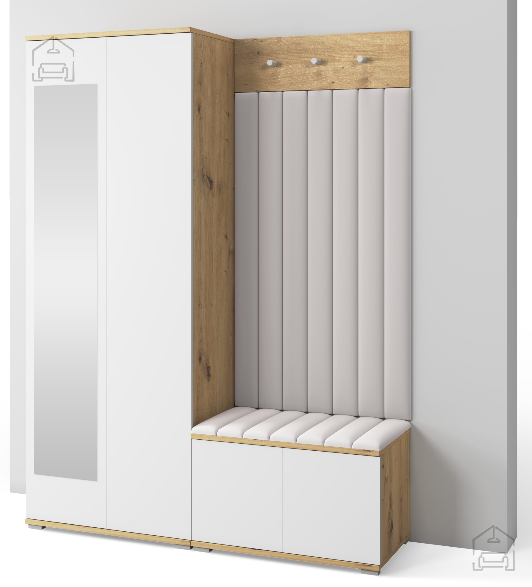 Das Garderobenset Sevilla 7 ist so gestaltet, dass sich alle Elemente perfekt ergänzen. Der Schrank bietet Stauraum für saisonale Kleidung oder Accessoires, während das Garderobenpaneel schnellen Zugriff auf täglich genutzte Stücke ermöglicht. Der Sitzbereich verbindet Komfort mit Funktionalität – ideal zum An- und Ausziehen der Schuhe. Die gepolsterten Wandpaneele runden das Gesamtbild ab und verleihen dem Raum eine wohnliche und warme Atmosphäre.