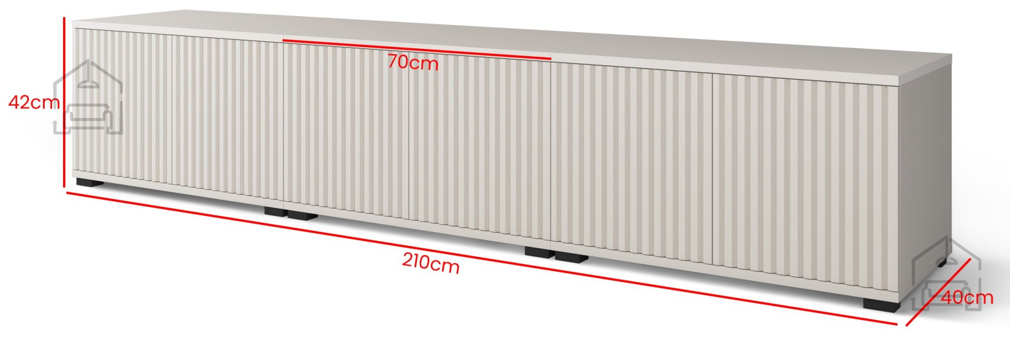 Die Kommode hat Außenmaße von 210x40x42 cm. Diese Länge bietet Platz für größere Fernseher und zugleich genügend Stauraum für Zubehör wie Spielkonsolen, Lautsprecher oder Receiver. Mit einer Höhe von 42 cm behält sie eine niedrige, elegante Silhouette, die den Raum offen wirken lässt und einen bequemen Blick auf den Bildschirm von der Couch aus ermöglicht.