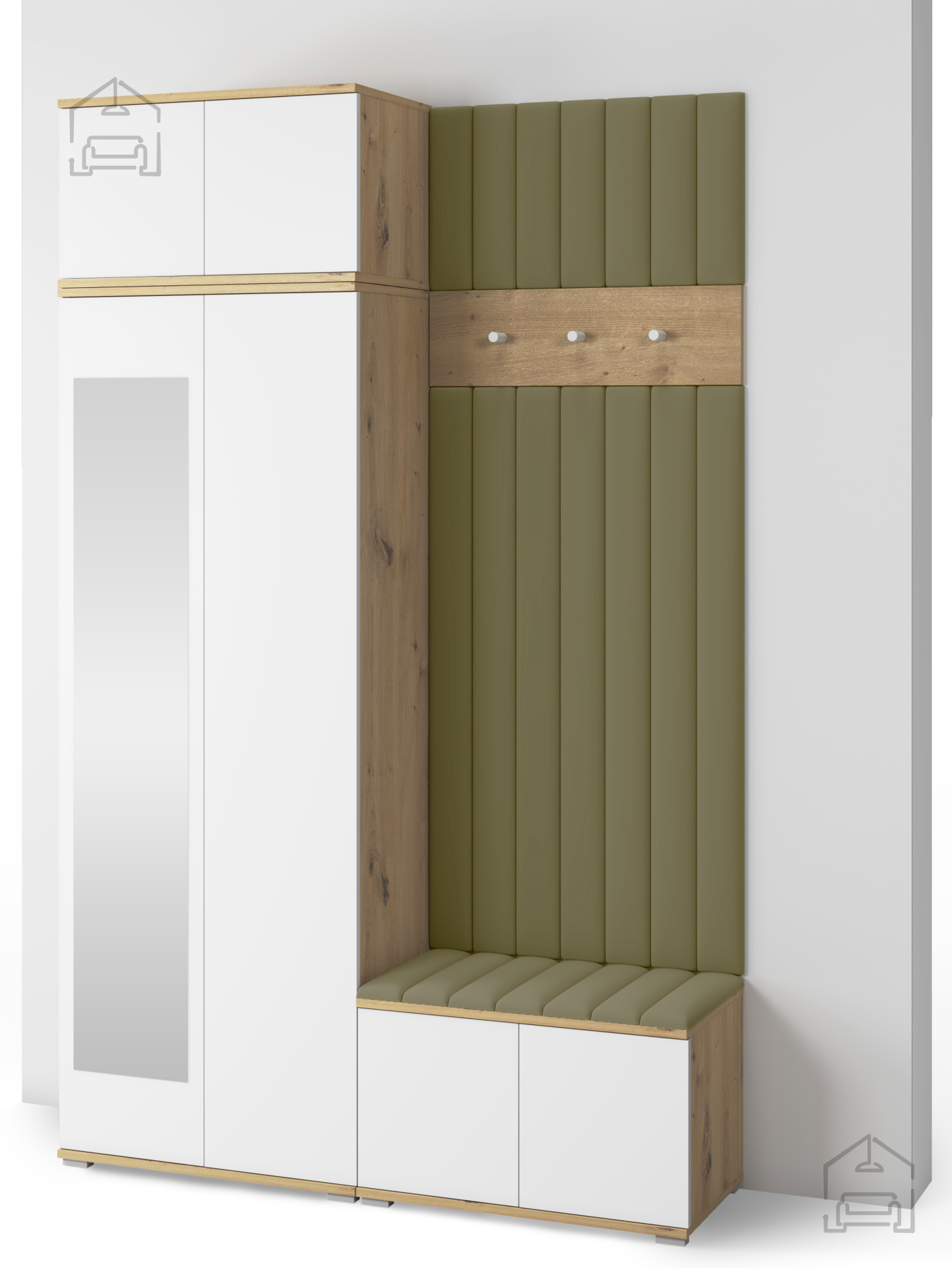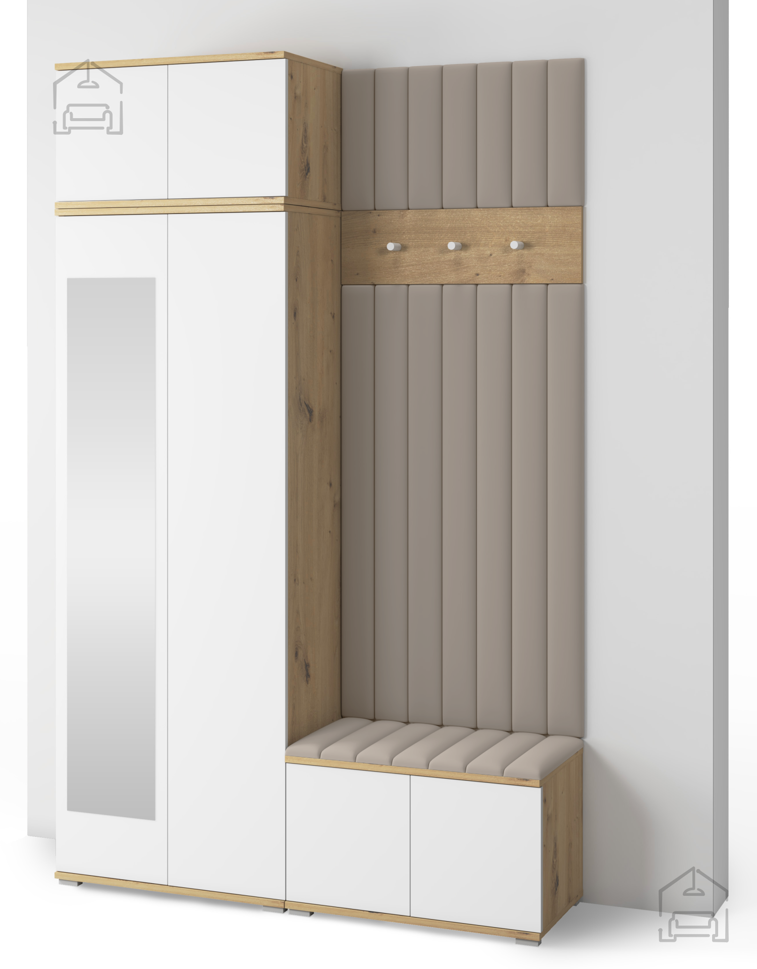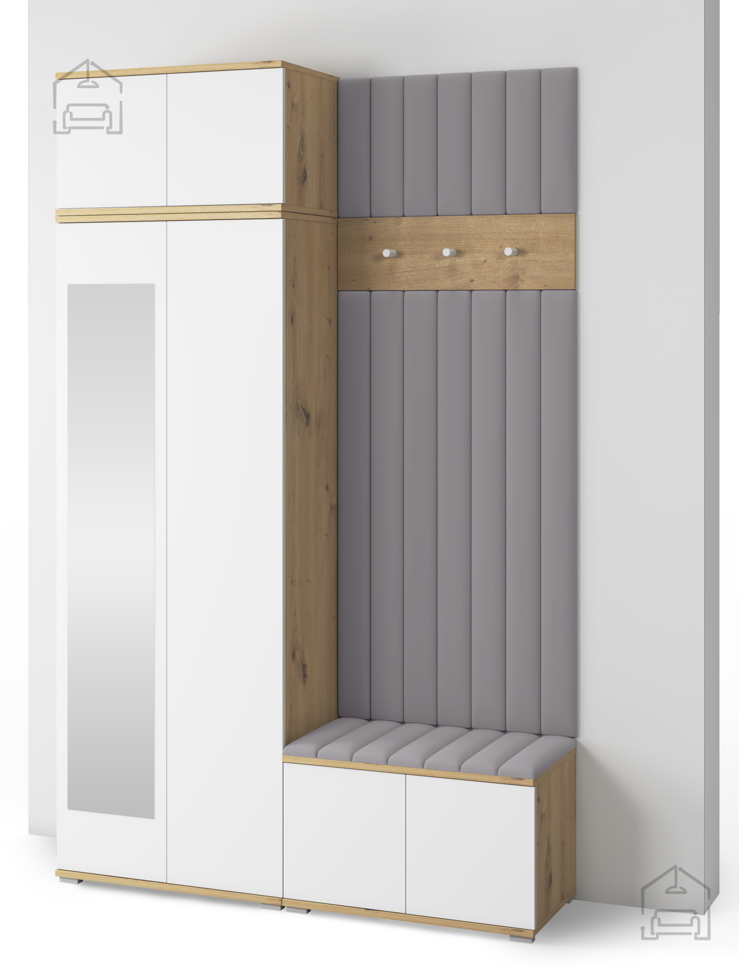 Jedes Element des Sets ist auf den täglichen Gebrauch abgestimmt. Die Haken und Paneele bieten ausreichend Platz für Jacken und Mäntel, während der Schrank Ordnung und Übersicht schafft. Der Sitzbereich erhöht den Komfort beim Anziehen, und das Push-to-Open-System ermöglicht eine einfache Bedienung ohne Griffe. So bleibt das Möbel nicht nur pflegeleicht, sondern auch optisch klar und modern.