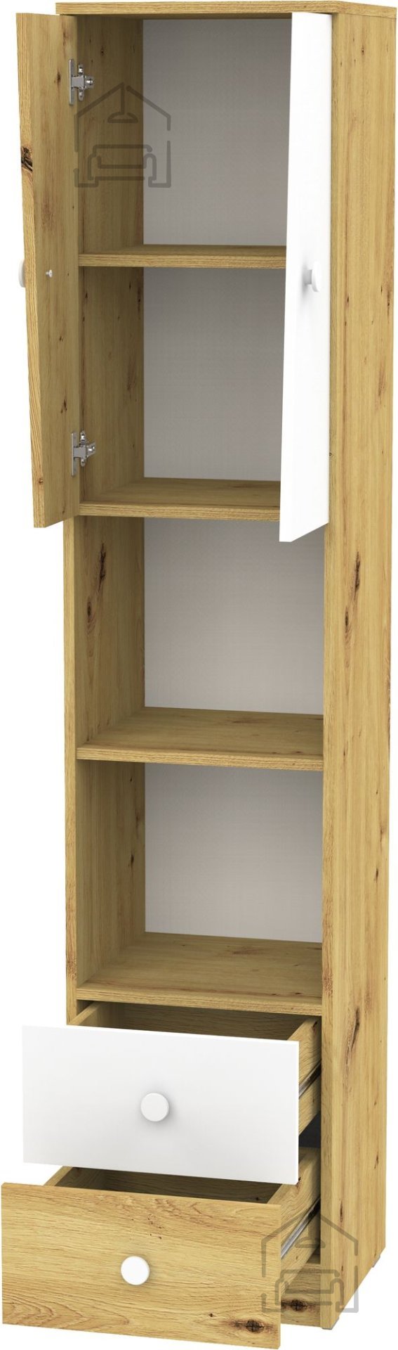 Die Basis des Regals besteht aus einer laminierten Spanplatte, die sich durch Kratzfestigkeit und einfache Pflege auszeichnet. Die Oberfläche ist so behandelt, dass sie den natürlichen Holzcharakter bewahrt und sich gleichzeitig leicht mit einem trockenen oder leicht feuchten Tuch reinigen lässt. Der Korpus ist in der Farbe Artisan Eiche gehalten, die eine warme und gemütliche Atmosphäre schafft. Die Fronten sind in mehreren Varianten erhältlich: