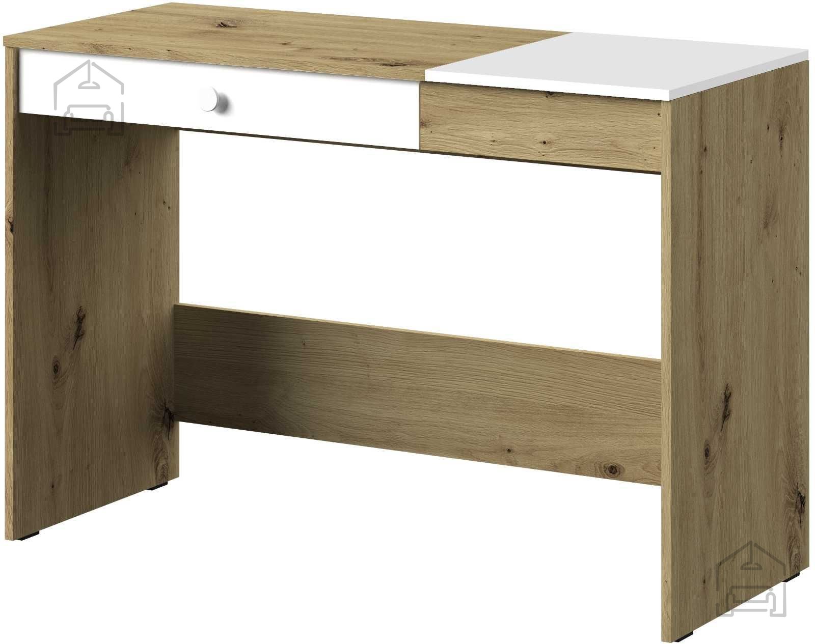 Der Schreibtisch Nero 10 von Domel ist eine praktische und ästhetisch ansprechende Lösung für jedes moderne Arbeits- oder Jugendzimmer. Mit seinen kompakten Maßen von 120x50x82 cm passt er auch in kleinere Räume und bietet dennoch ausreichend Platz für Computer, Unterlagen und alle notwendigen Arbeitsutensilien. Gefertigt aus einer hochwertigen, 16 mm starken laminierten Spanplatte, überzeugt er durch Stabilität, Langlebigkeit und einfache Pflege. Die Oberfläche ist widerstandsfähig gegen den täglichen Gebrauch und bewahrt das natürliche Erscheinungsbild des Artisan-Eichen-Dekors, das dem Raum Wärme und eine wohnliche Atmosphäre verleiht.