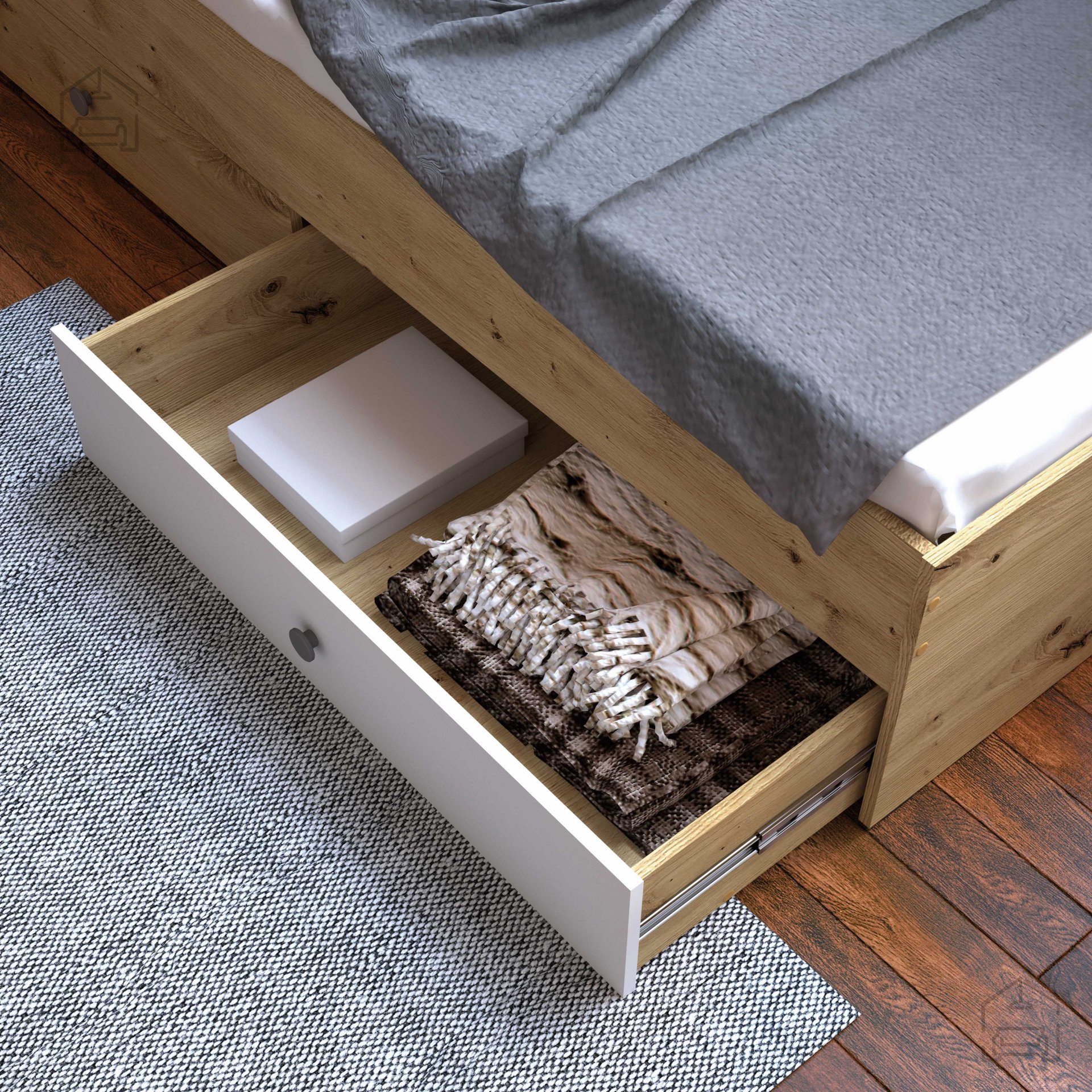 Ein besonderes Plus des Modells Nero 14 ist die Bettzeuglade, in der Decken, Pölster oder saisonale Kleidung Platz finden. Die Lade ist unauffällig unter dem Bett integriert und nutzt so den Stauraum optimal. Dank der leichtgängigen Führung lässt sie sich auch von Kindern einfach öffnen – ideal, um Ordnung halten zu lernen.