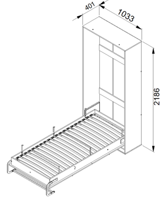 Die Gesamtmaße betragen 103,3×40,1×218,6 cm (Breite × Tiefe × Höhe). Im geschlossenen Zustand nimmt das Bett kaum mehr Platz ein als ein schmaler Kleiderschrank – ideal für kleine Räume. Im Inneren befindet sich eine Standard-Einzelbettliegefläche, die beim Herunterklappen der Front sichtbar wird. Die Konstruktion ist auf stabilen und sicheren Gebrauch ausgelegt; ein Hebemechanismus ist nicht integriert, das Bett wird also manuell geöffnet.