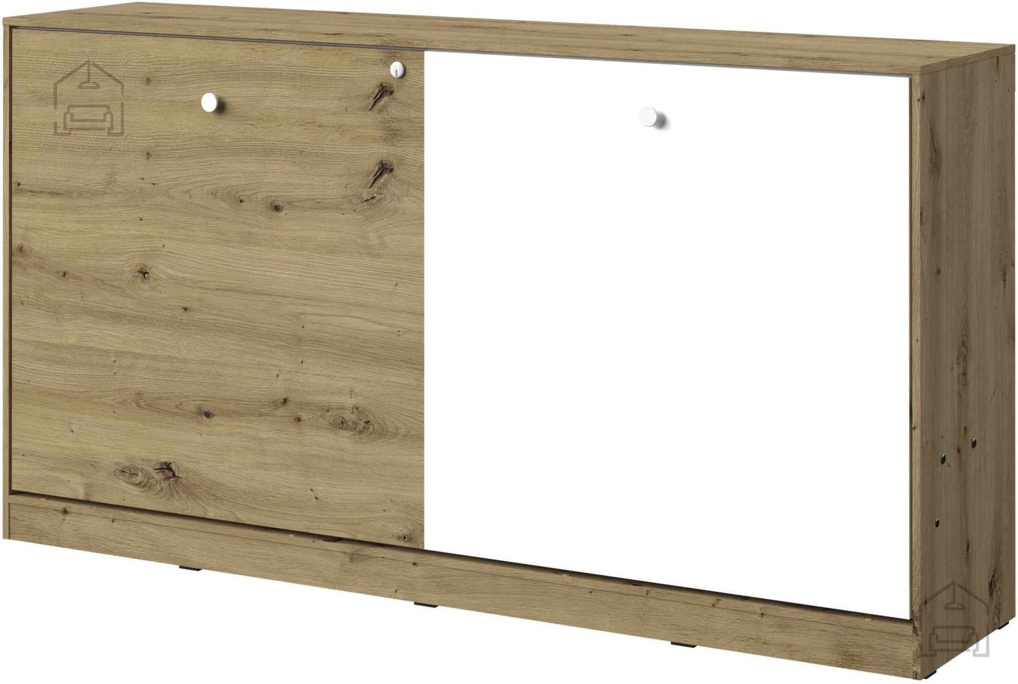 Das Bett besteht aus einer 16 mm starken laminierten Spanplatte, die Stabilität und Langlebigkeit gewährleistet. Die Oberfläche ist widerstandsfähig im täglichen Gebrauch und leicht zu reinigen. Die Kombination aus Korpus in Artisan-Eiche und Front in matt Weiß schafft einen harmonischen Kontrast, der dem Raum ein natürliches und helles Ambiente verleiht. Die Griffe sind in drei Farben erhältlich – weiß, schwarz oder grau –, sodass Sie den Farbton wählen können, der am besten zu Ihrer Einrichtung passt.