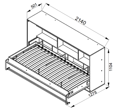 Die Maße des Produkts betragen 214 x 50,1 x 110,4 cm und bieten eine komfortable Liegefläche von 90 x 200 cm. Im eingeklappten Zustand nimmt das Bett nur wenig Platz ein – ideal für Räume mit mehreren Nutzungen, etwa als Wohn-, Arbeits- oder Gästezimmer. Zusammengeklappt verwandelt es sich in einen eleganten Schrank, der sich harmonisch ins übrige Mobiliar einfügt.