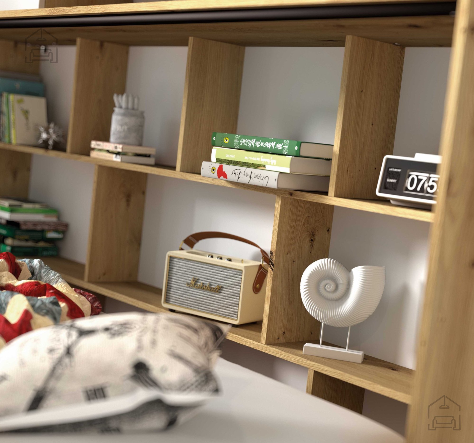 Der Aufsatz Nero 17 harmoniert besonders gut mit dem horizontalen Bett derselben Serie, lässt sich dank seiner neutralen Farbgebung aber auch leicht mit anderen Möbeln in Holz- oder Weißtönen kombinieren. Ideal für Jugendzimmer, kleine Schlafzimmer oder multifunktionale Räume, in denen Funktionalität und schlichte Eleganz gefragt sind. Mit zusätzlichen offenen Regalen oder geschlossenen Schränken aus der Nero-Serie können Sie eine modulare Lösung zusammenstellen, die sich Ihren Bedürfnissen anpasst.