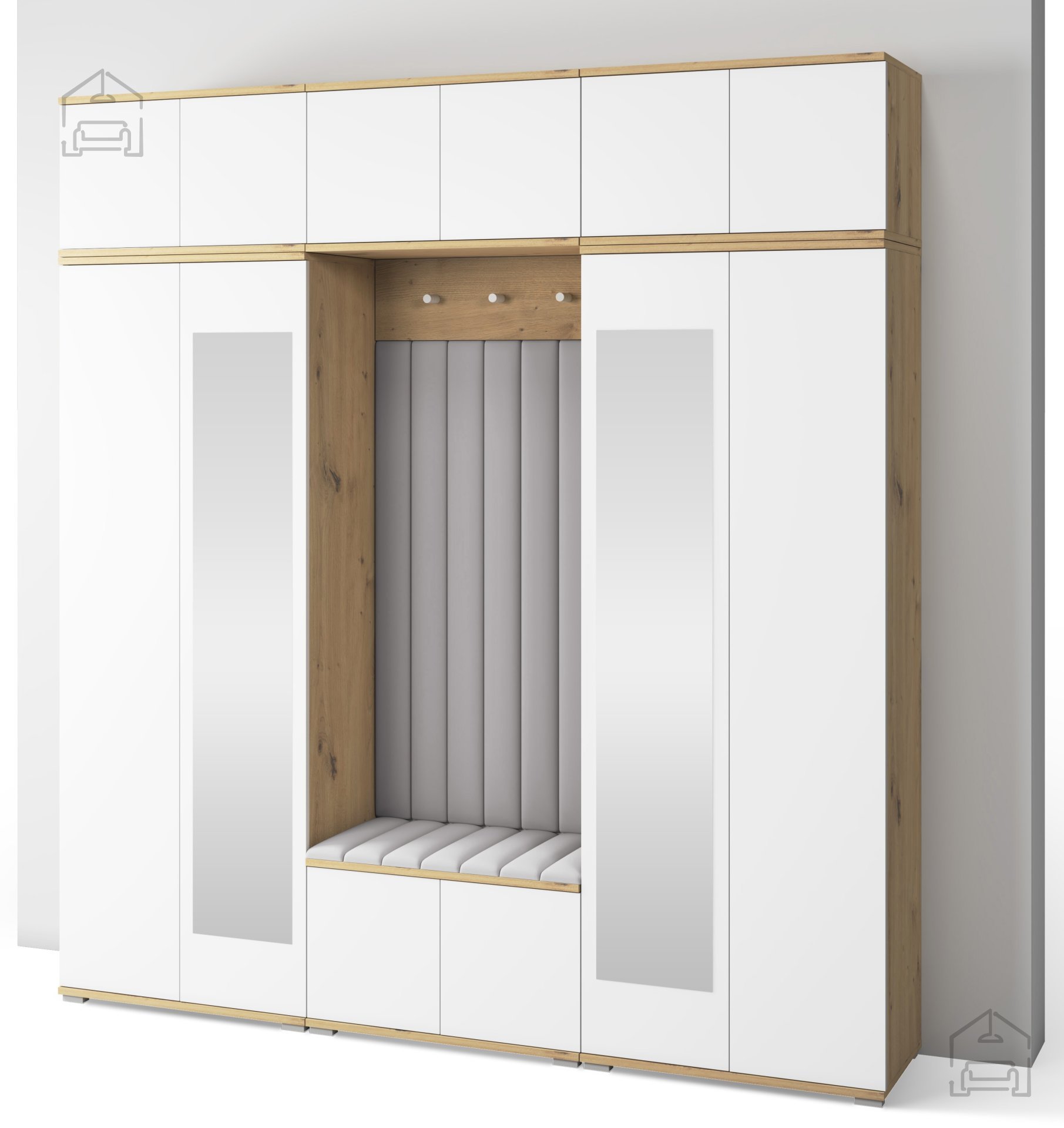 Das Garderobenset Sevilla 10 vereint Funktionalität und modernes Design zu einer harmonischen Einheit, die Ihrem Zuhause Wärme und Eleganz verleiht. Die Kombination aus Artisan-Eiche und Weiß sorgt für eine angenehme Optik, die sowohl zu modernen als auch klassischen Einrichtungen passt. Das Set ist darauf ausgelegt, den Vorraum praktisch zu gestalten – jeder Ablageplatz und jedes Detail ist durchdacht. Das Push-to-Open-System ermöglicht eine komfortable Nutzung ohne klassische Griffe und unterstreicht die klaren Linien und den minimalistischen Stil. Gefertigt wird das Set in Polen in der renommierten PKMebel-Fabrik, die für hochwertige Verarbeitung und präzise Details bekannt ist.