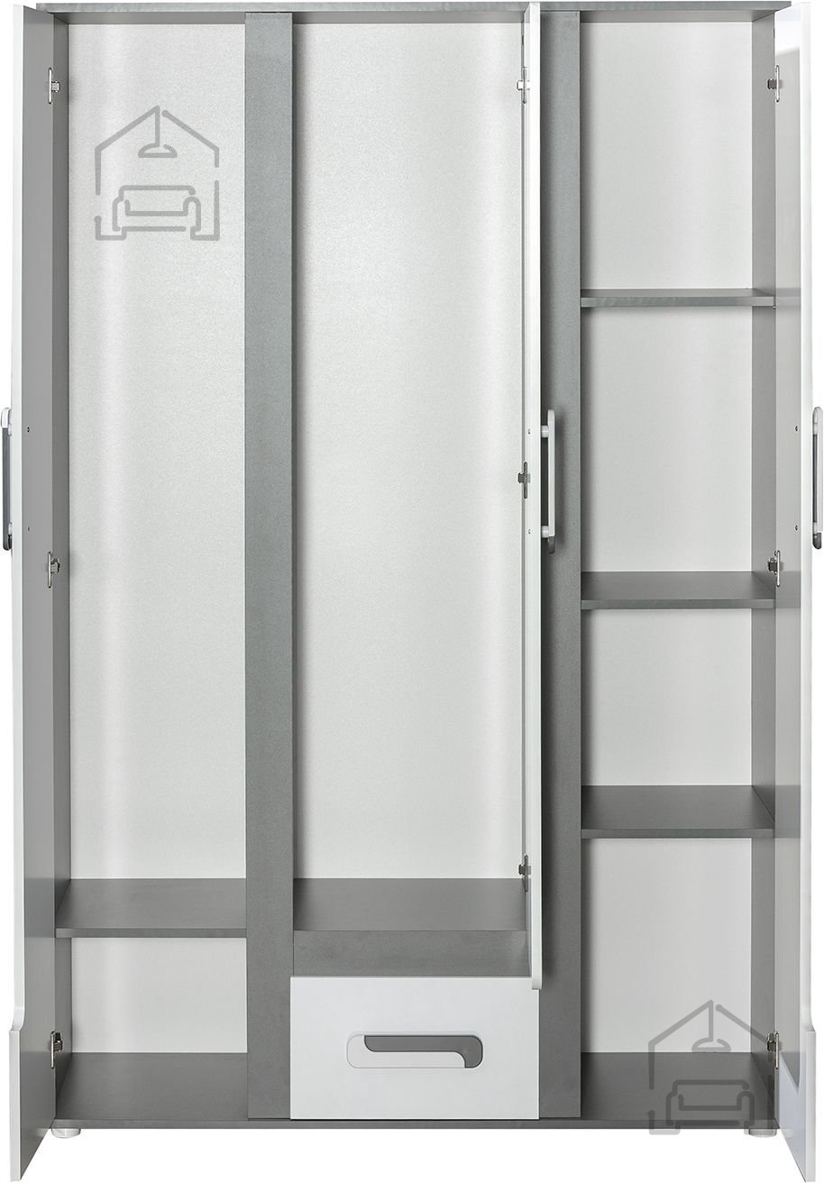 Die Maße des Kleiderschranks betragen 127,5 × 50 × 192 cm. Diese Größe ermöglicht eine optimale Raumnutzung – ob im Schlafzimmer, Vorraum oder Ankleidezimmer. Im Inneren sind die Fächer auf Kugelführungen montiert, was ein leises und sanftes Öffnen und Schließen ermöglicht. Der geräumige Innenbereich bietet viel Platz für Kleidung, Accessoires und andere Dinge, die ordentlich und griffbereit aufbewahrt werden sollen.