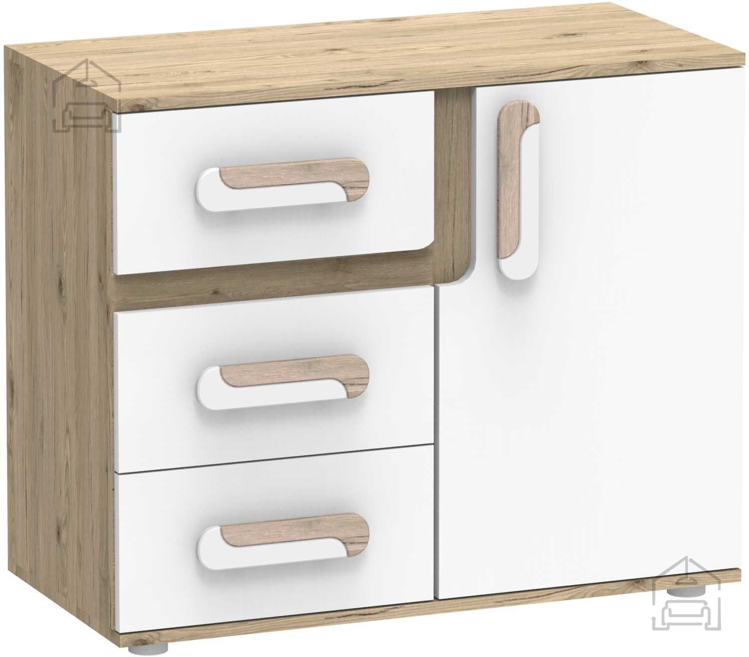Der Korpus präsentiert sich in hellem Eichenfarbton, die Fronten sind in Weiß gehalten – das ergibt einen angenehmen Kontrast und bringt Helligkeit in den Raum. Die Griffe in Weiß und heller Eiche fügen sich harmonisch ins Gesamtbild ein. Dank dieser dezenten Farbtöne lässt sich die Kommode gut mit verschiedenen Einrichtungsstilen kombinieren – vom skandinavischen Minimalismus bis hin zu klassisch-natürlichen Wohnkonzepten.