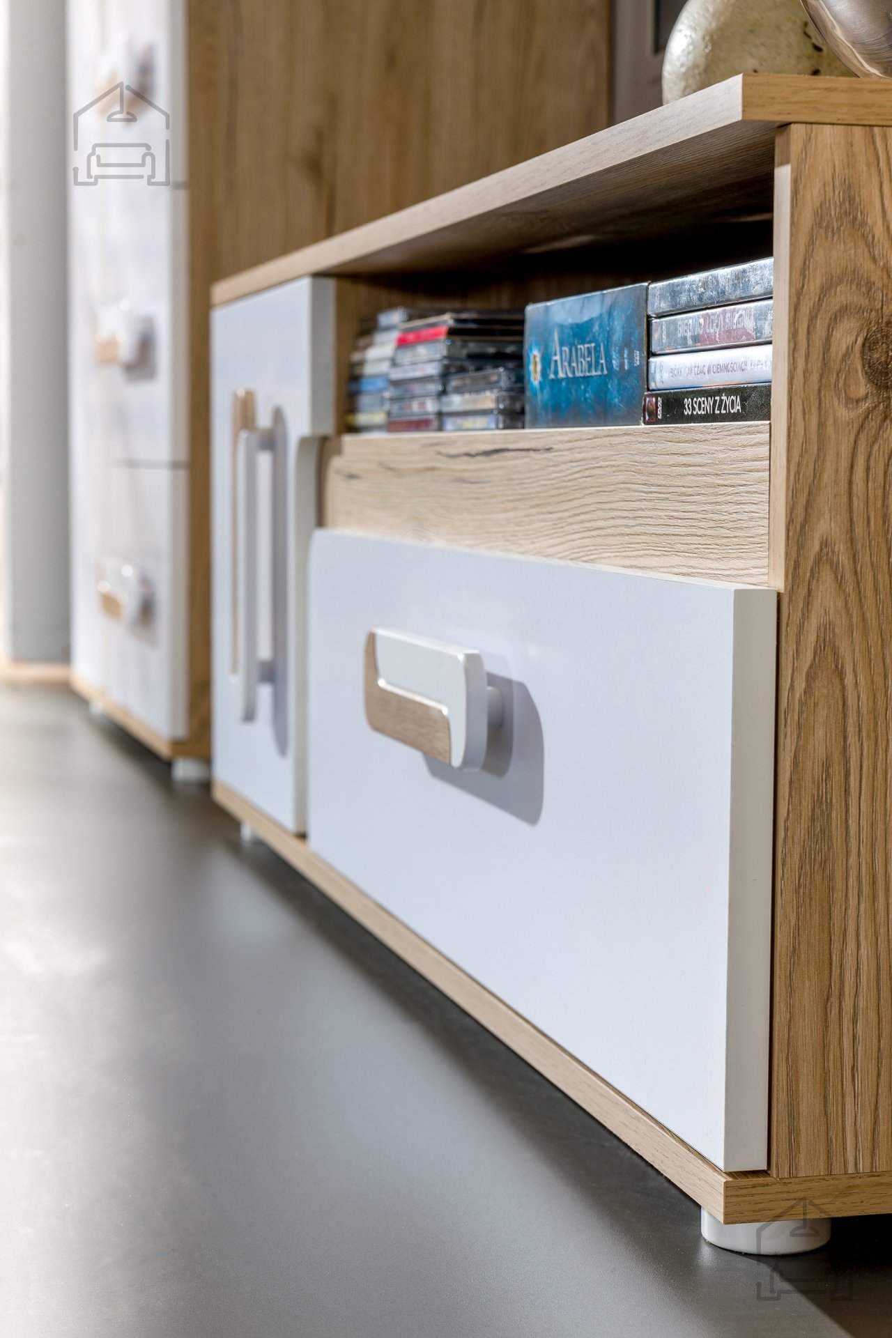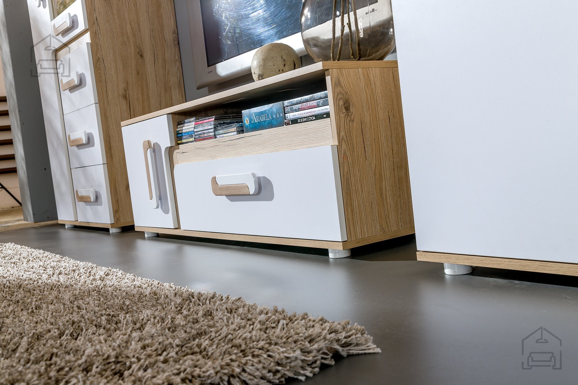 Das Möbelstück wird in der renommierten Fabrik Domel in Polen hergestellt, die für präzise Verarbeitung und hochwertige Montage bekannt ist. Jeder Bestandteil ist so konzipiert, dass Stabilität und lange Lebensdauer gewährleistet sind. Die laminierte Oberfläche ist unempfindlich gegenüber Kratzern und Farbverlust, wodurch das Lowboard auch bei häufiger Nutzung sein Erscheinungsbild behält. Sorgfältig gearbeitete Verbindungen und solide Materialien machen es stabil und sicher im Gebrauch.