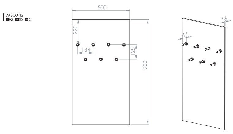 Die Garderobe Vasco 12 ist so konzipiert, dass Kleidung, Taschen und andere Alltagsgegenstände ordentlich verstaut werden können. Durch die geringe Tiefe von nur 2 cm liegt sie flach an der Wand und nimmt kaum Raum ein. Mit einer Höhe von 92 cm sind die Haken bequem erreichbar, und die Breite von 50 cm bietet ausreichend Platz für mehrere Kleidungsstücke zugleich. Dieses Modell harmoniert hervorragend mit weiteren Möbeln aus der Vasco-Kollektion und sorgt so für ein stimmiges Gesamtbild im Raum.