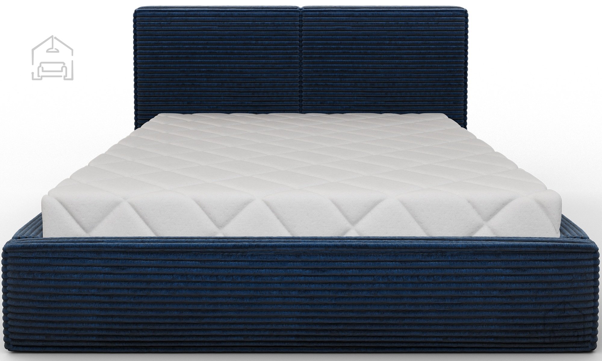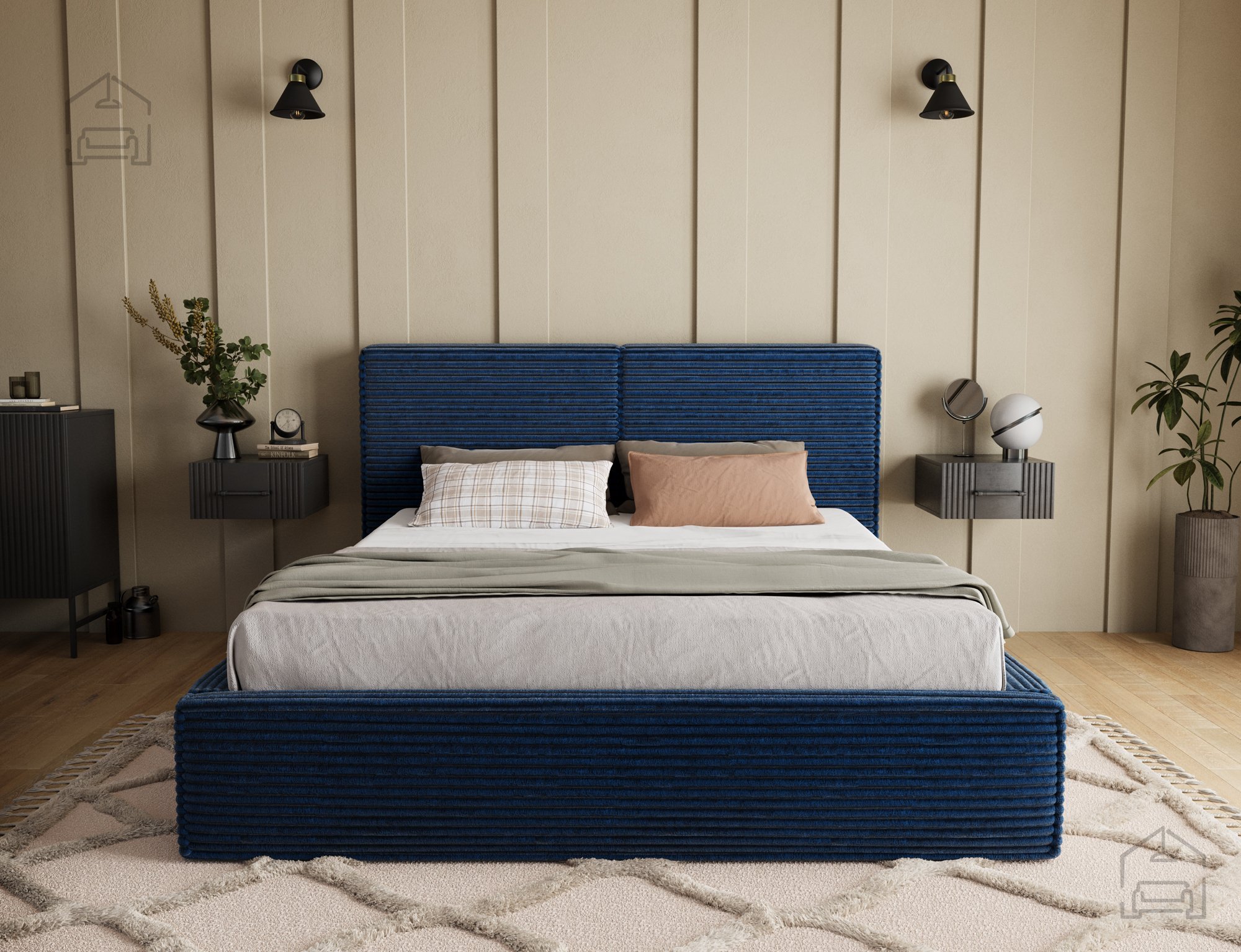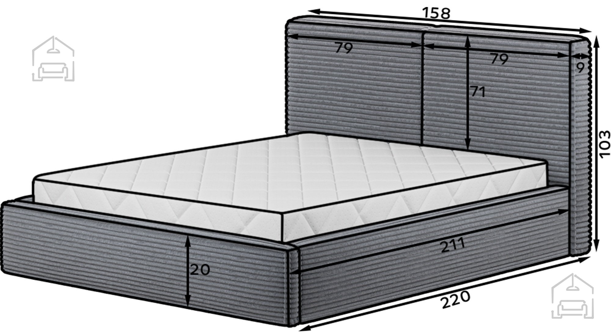Die Gesamtlänge des Bettes beträgt 220 cm, die Höhe des Kopfteils 103 cm. Je nach Ausführung ist die Liegefläche in drei Größen erhältlich: 140x200 cm, 160x200 cm und 180x200 cm. Die Breite variiert somit je nach Modell und lässt sich optimal an den Raum anpassen. Trotz seines modernen Designs bleibt das Bett kompakt und passt sowohl in größere als auch in kleinere Schlafzimmer.