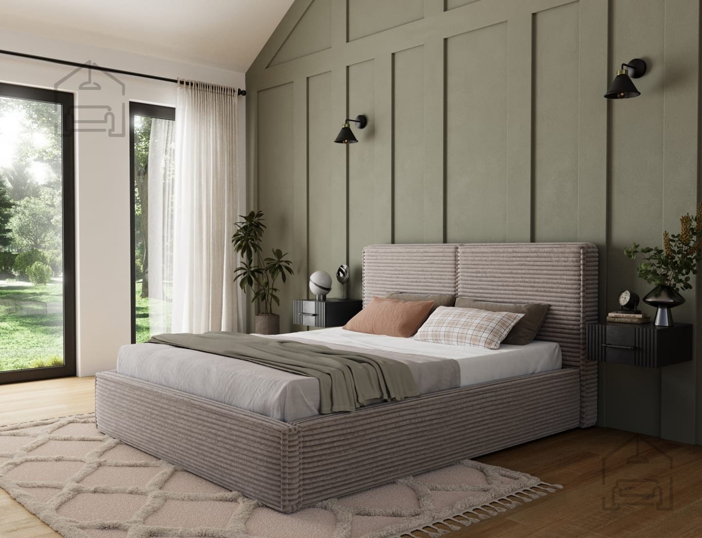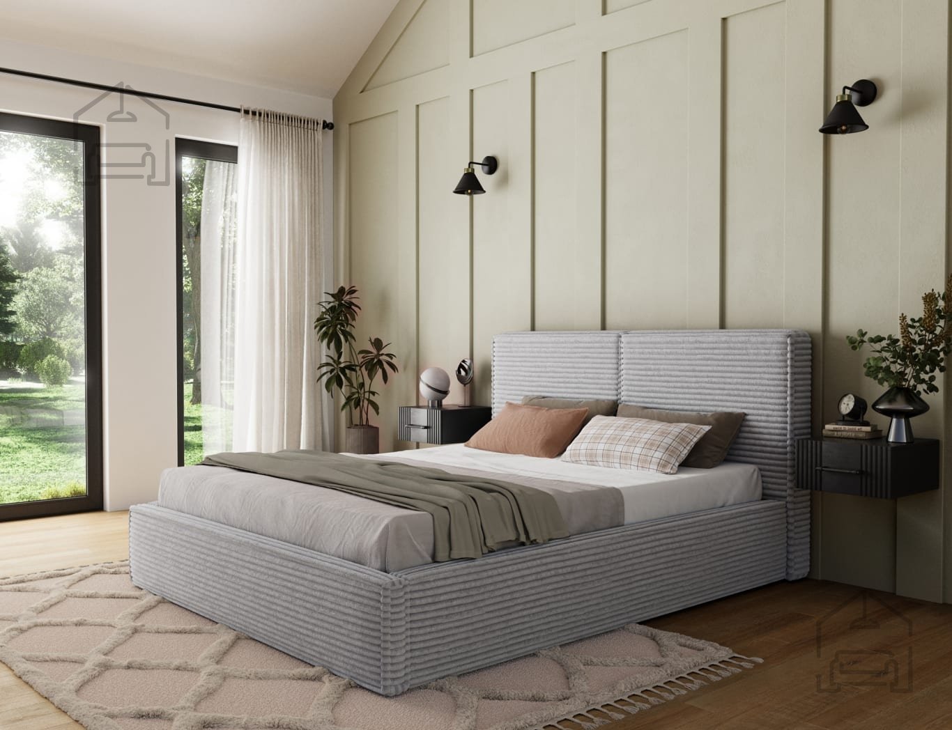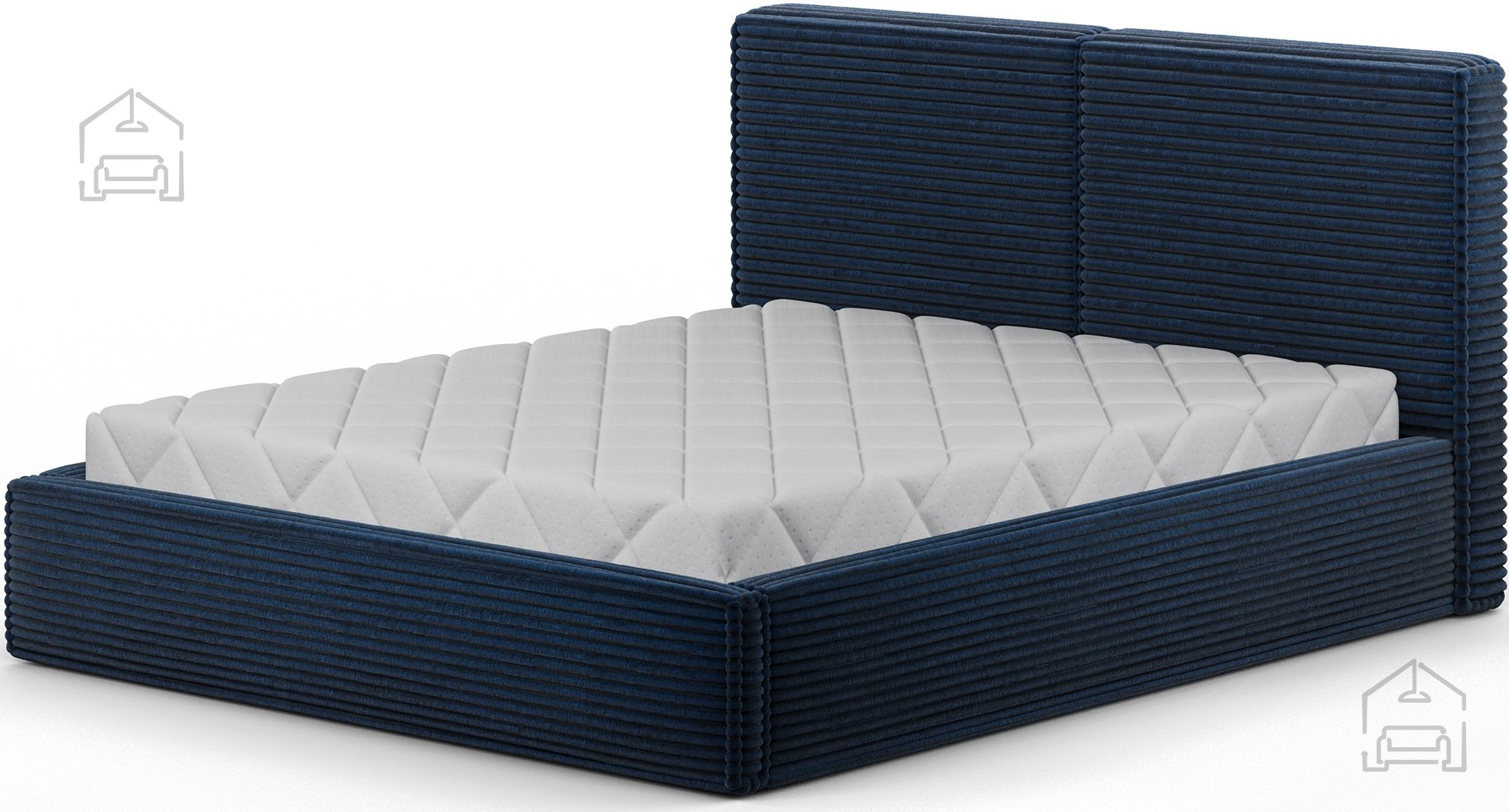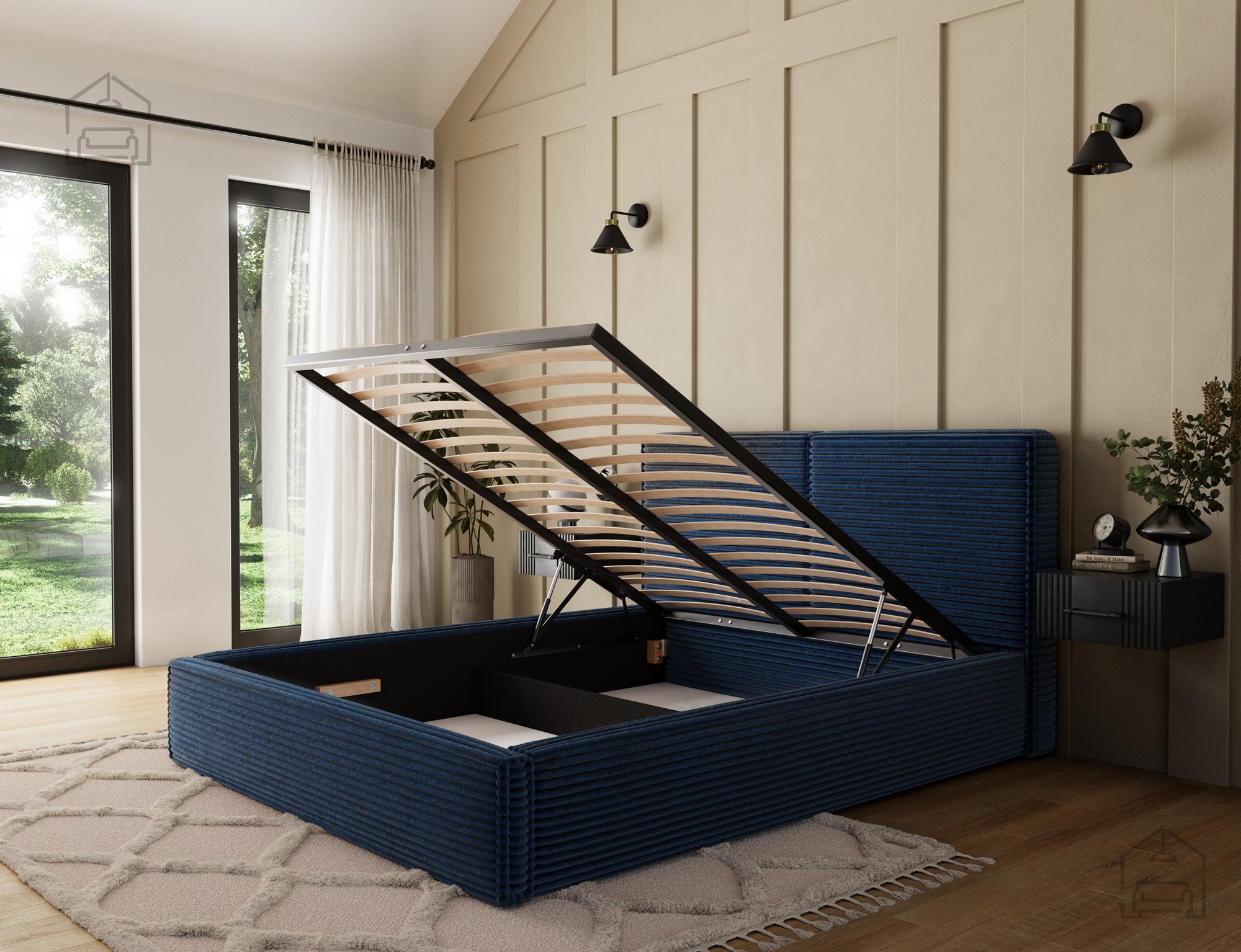 Die Gesamtlänge des Bettes beträgt 220 cm, die Höhe des Kopfteils 103 cm. Je nach Ausführung ist die Liegefläche in drei Größen erhältlich: 140x200 cm, 160x200 cm und 180x200 cm. Die Breite variiert somit je nach Modell und lässt sich optimal an den Raum anpassen. Trotz seines modernen Designs bleibt das Bett kompakt und passt sowohl in größere als auch in kleinere Schlafzimmer.