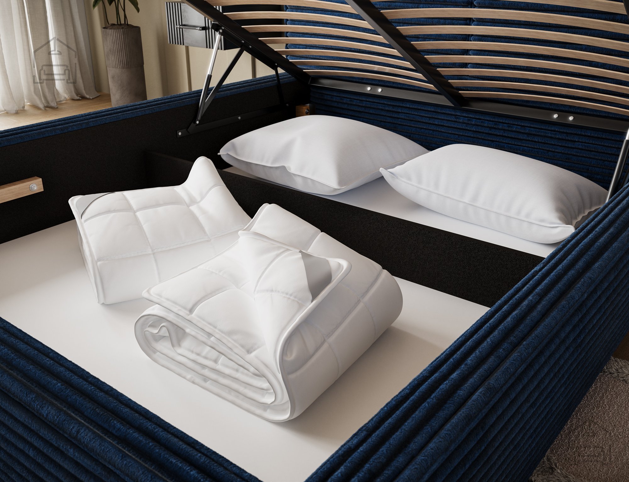 Das Bett Pesillo ist nicht nur optisch ansprechend, sondern auch praktisch durchdacht. Der integrierte Hebemechanismus ermöglicht einen einfachen Zugang zu einem großzügigen Bettkasten, in dem Decken, Kissen oder saisonale Bettwäsche Platz finden. Damit wird der Raum unter dem Bett optimal genutzt – besonders vorteilhaft in kleineren Wohnungen.