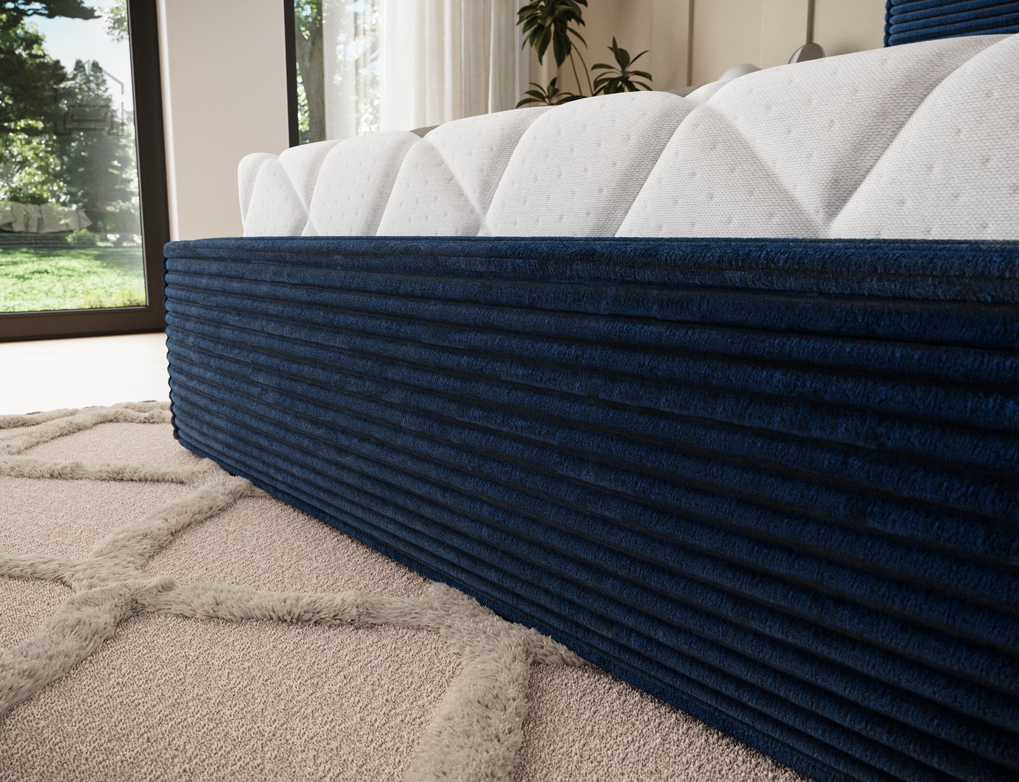 Das Modell ist als Boxspringbett konzipiert, das sowohl Matratze als auch Lattenrost umfasst. Diese Bauweise sorgt für gute Belüftung und verlängert die Lebensdauer der Matratze. Das weich gepolsterte Kopfteil mit einer Füllung aus T2130-Schaum bietet angenehmen Halt und hohen Komfort. Die Sitzhöhe beträgt etwa 32 cm, was ein bequemes Ein- und Aussteigen ermöglicht.