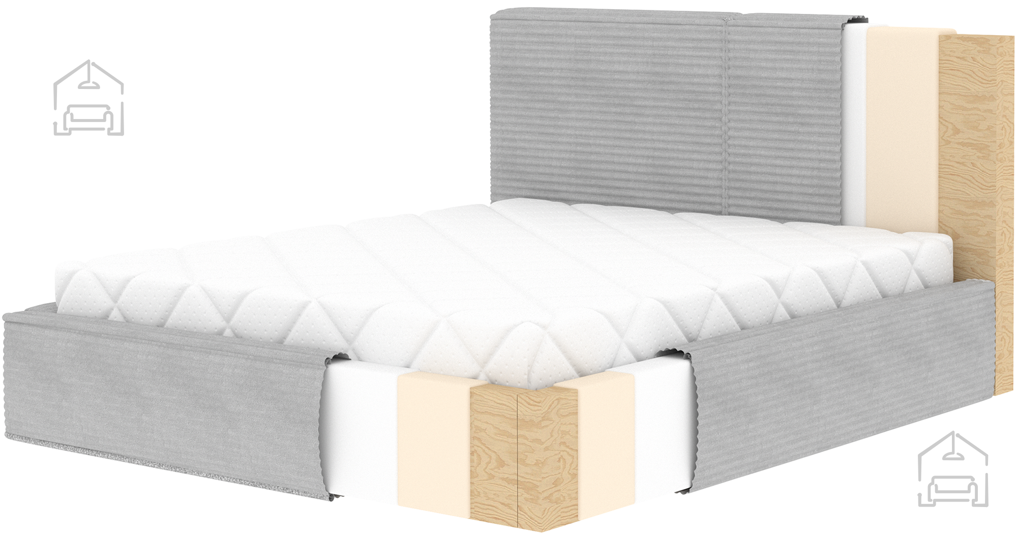 Der Metallrahmen wird durch Holzelemente ergänzt, was zusätzliche Stabilität und Verlässlichkeit bietet. Die innere Konstruktion besteht aus Holz, während der Bezug aus einem hochwertigen Stoff gefertigt ist, der sich angenehm anfühlt und leicht zu pflegen ist. Auf dem Foto ist das Bett im Stoff Modullo 40 abgebildet, der jedoch in mehreren Farben erhältlich ist, sodass sich das Bett verschiedenen Einrichtungsstilen anpassen lässt.