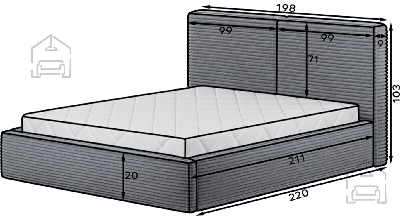 Die Gesamtlänge des Bettes beträgt 220 cm, die Höhe des Kopfteils 103 cm. Je nach gewählter Ausführung ist die Liegefläche in drei Größen erhältlich: 140x200 cm, 160x200 cm und 180x200 cm. Die Breite variiert je nach Modell und lässt sich so optimal an den Raum anpassen. Trotz des modernen Designs bleibt das Bett kompakt und passt sowohl in größere als auch in kleinere Schlafzimmer.