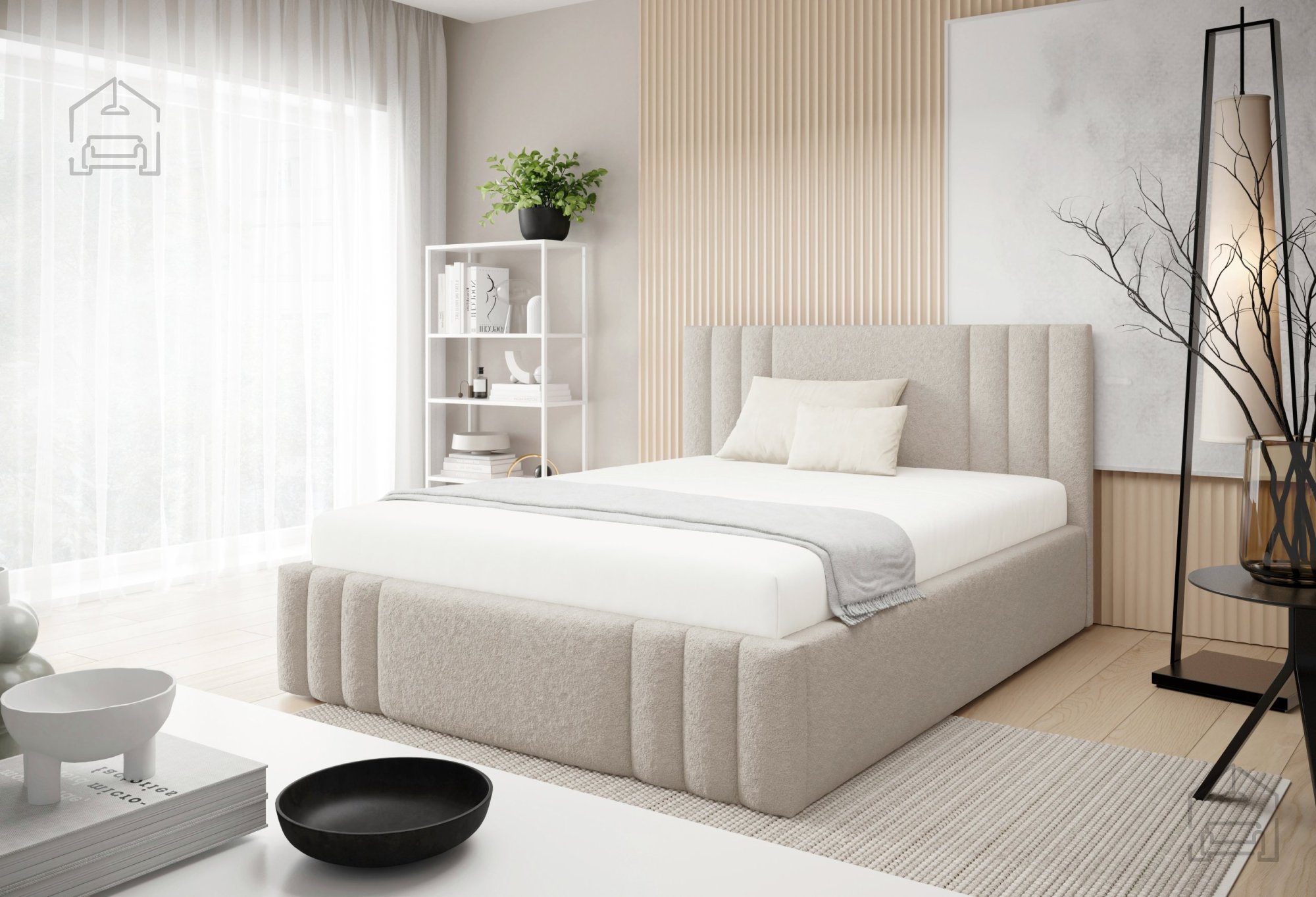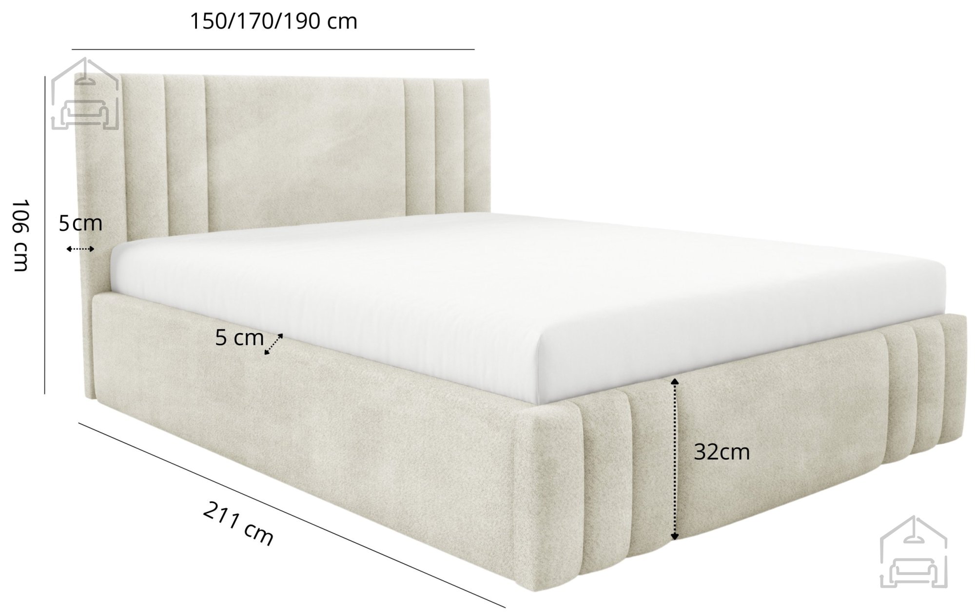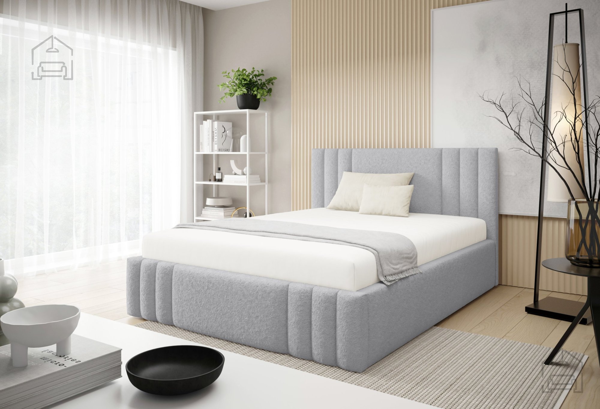 Die Basis des Bettes Ribo bildet ein Holzrahmen, der für Stabilität und Langlebigkeit sorgt. Der Rahmen ist gepolstert und mit einem angenehm weichen Stoff bezogen, was dem Bett eine elegante Optik und ein behagliches Gefühl verleiht. Die gepolsterte Oberfläche sorgt für Wärme und Komfort, wodurch das Bett zum Mittelpunkt des Schlafzimmers wird. Die Höhe der Konstruktion und der Standard 32 ermöglichen eine stabile Liegefläche und ein bequemes Aufstehen.