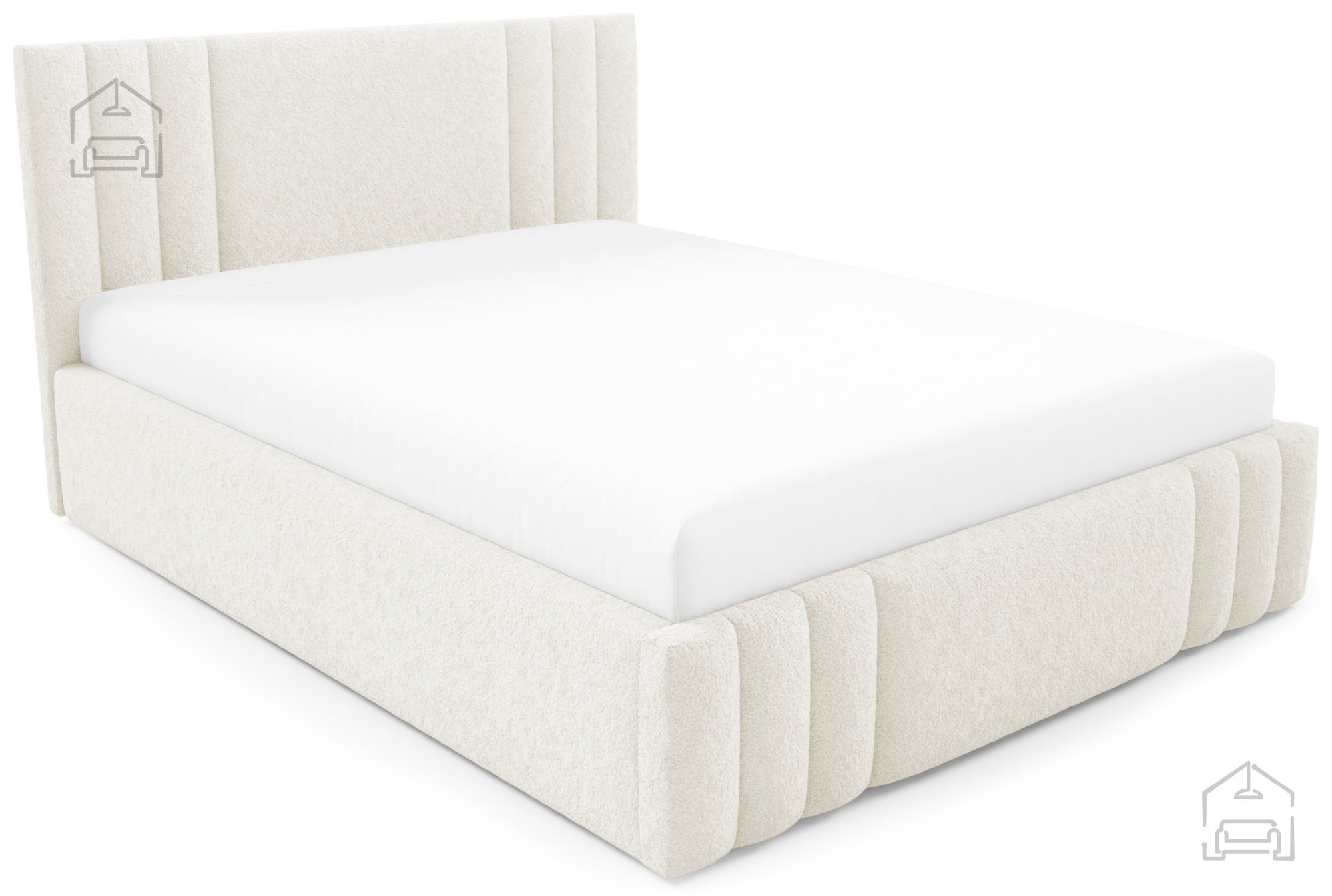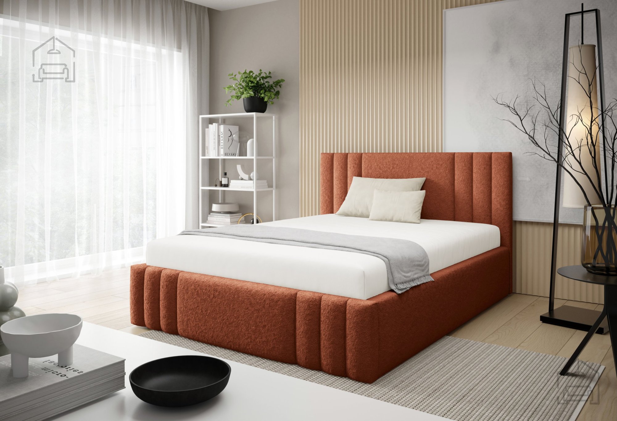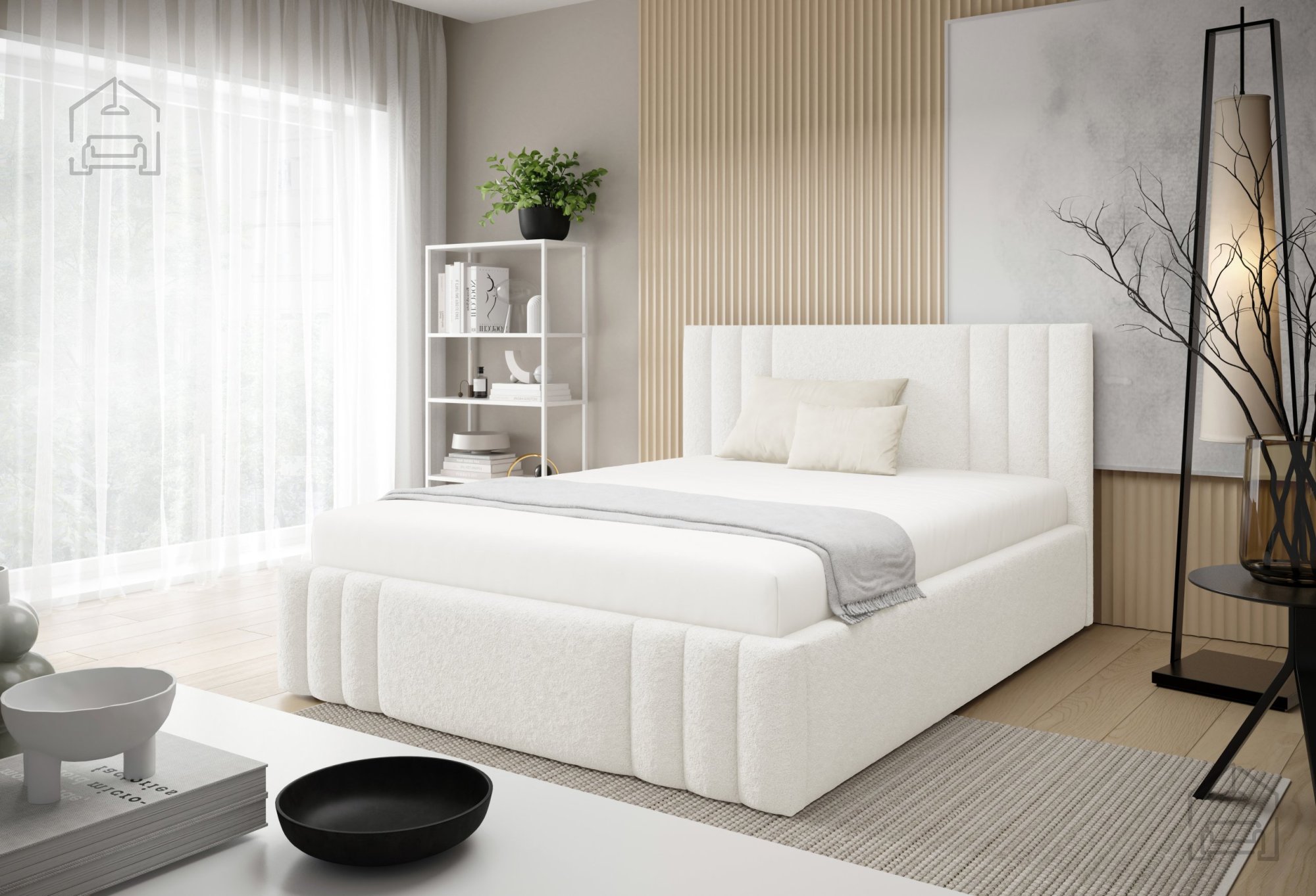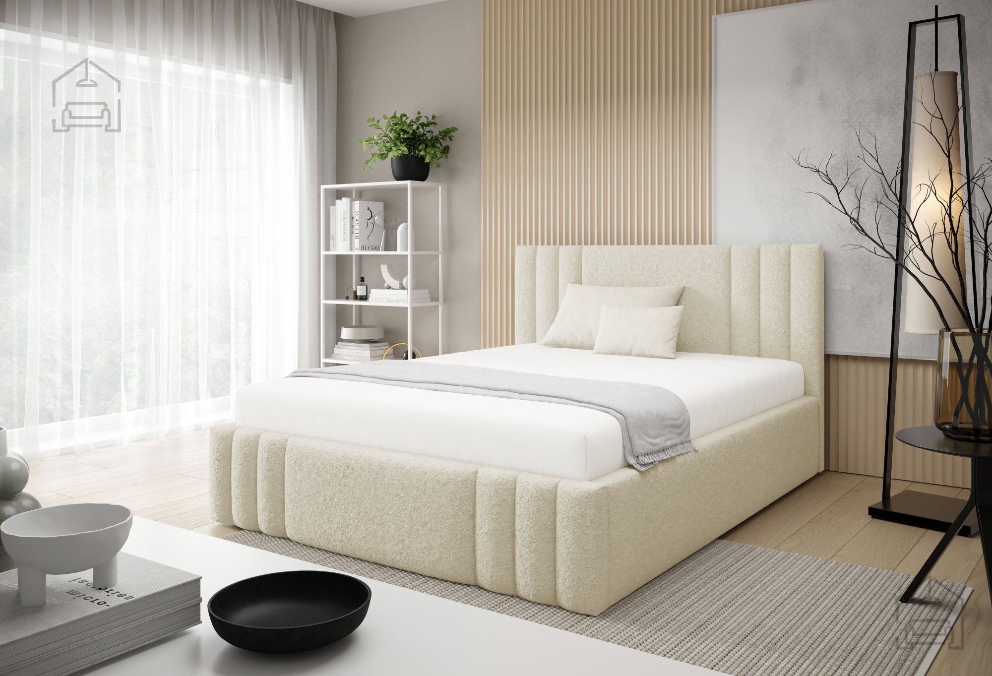 Die Basis des Bettes Ribo bildet ein Holzrahmen, der für Stabilität und Langlebigkeit sorgt. Der Rahmen ist gepolstert und mit einem angenehm weichen Stoff bezogen, was dem Bett eine elegante Optik und ein behagliches Gefühl verleiht. Die gepolsterte Oberfläche sorgt für Wärme und Komfort, wodurch das Bett zum Mittelpunkt des Schlafzimmers wird. Die Höhe der Konstruktion und der Standard 32 ermöglichen eine stabile Liegefläche und ein bequemes Aufstehen.