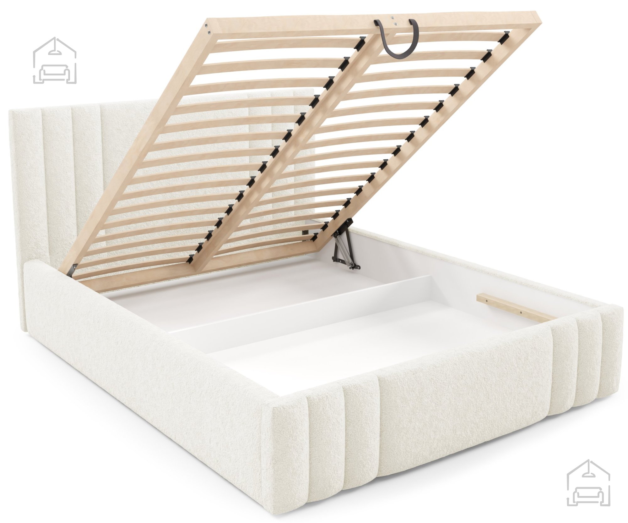 Ein besonderes Highlight des Bettes Ribo ist der Hebemechanismus mit Federunterstützung. Dieser ermöglicht einen einfachen Zugang zur geräumigen Bettzeuglade unter der Liegefläche. Die Lade ist eine praktische Lösung, um Decken, Kissen, Bettwäsche oder saisonale Kleidung ordentlich zu verstauen. Dank der Federmechanik lässt sich die Liegefläche leicht und mühelos anheben – auch bei größeren Bettgrößen.