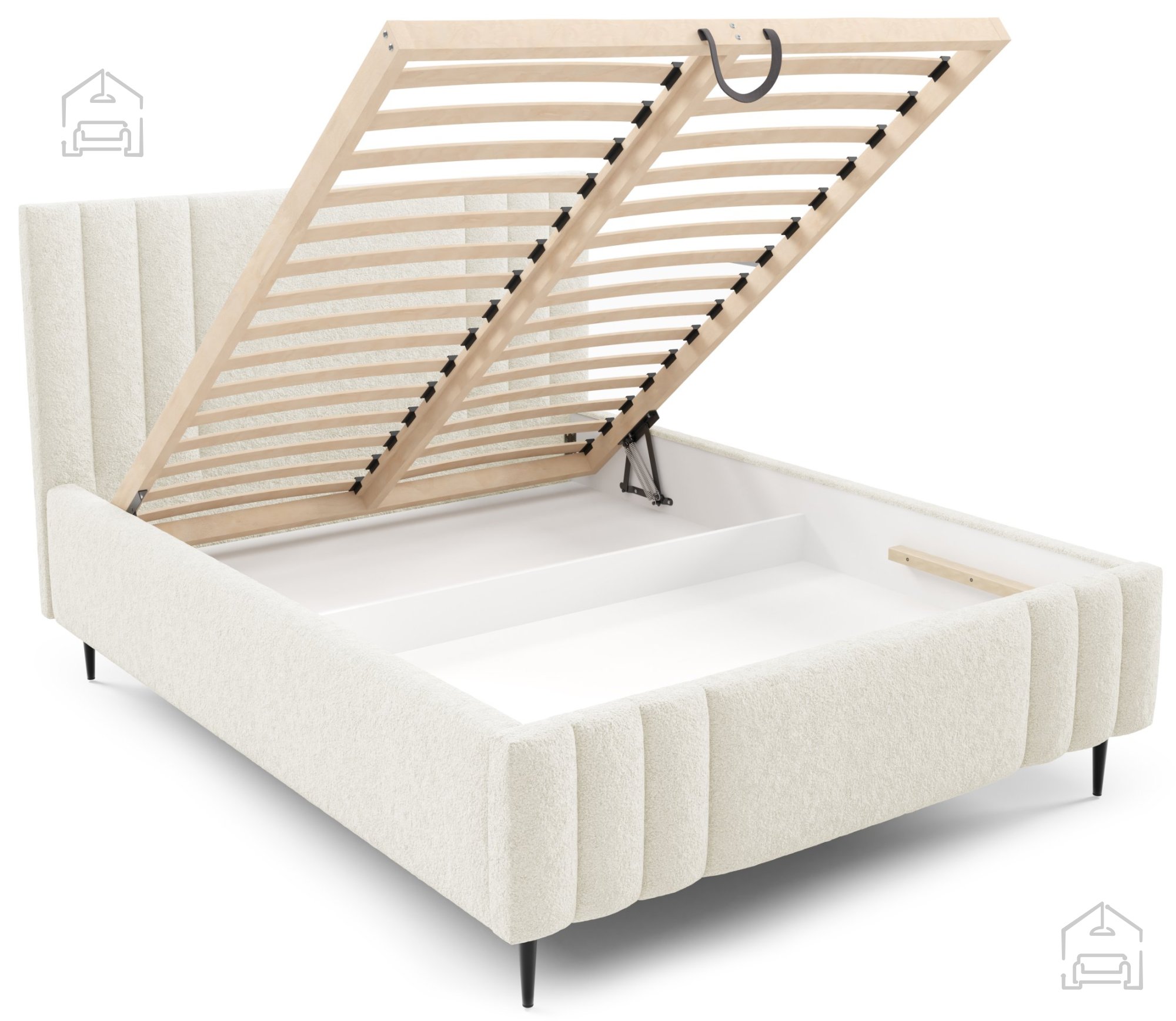 Ein besonderes Highlight ist der Hebemechanismus mit Federöffnung, der einen einfachen Zugang zum geräumigen Bettkasten ermöglicht. Diese Lösung ist besonders praktisch in kleineren Wohnungen oder Schlafzimmern, wo zusätzlicher Stauraum willkommen ist. Der Mechanismus ist so konstruiert, dass sich der Bettkasten leicht und sicher öffnen lässt – ganz ohne großen Kraftaufwand. Er bietet ausreichend Platz für Decken, Kissen oder saisonale Kleidung und hilft, Ordnung im Raum zu halten.