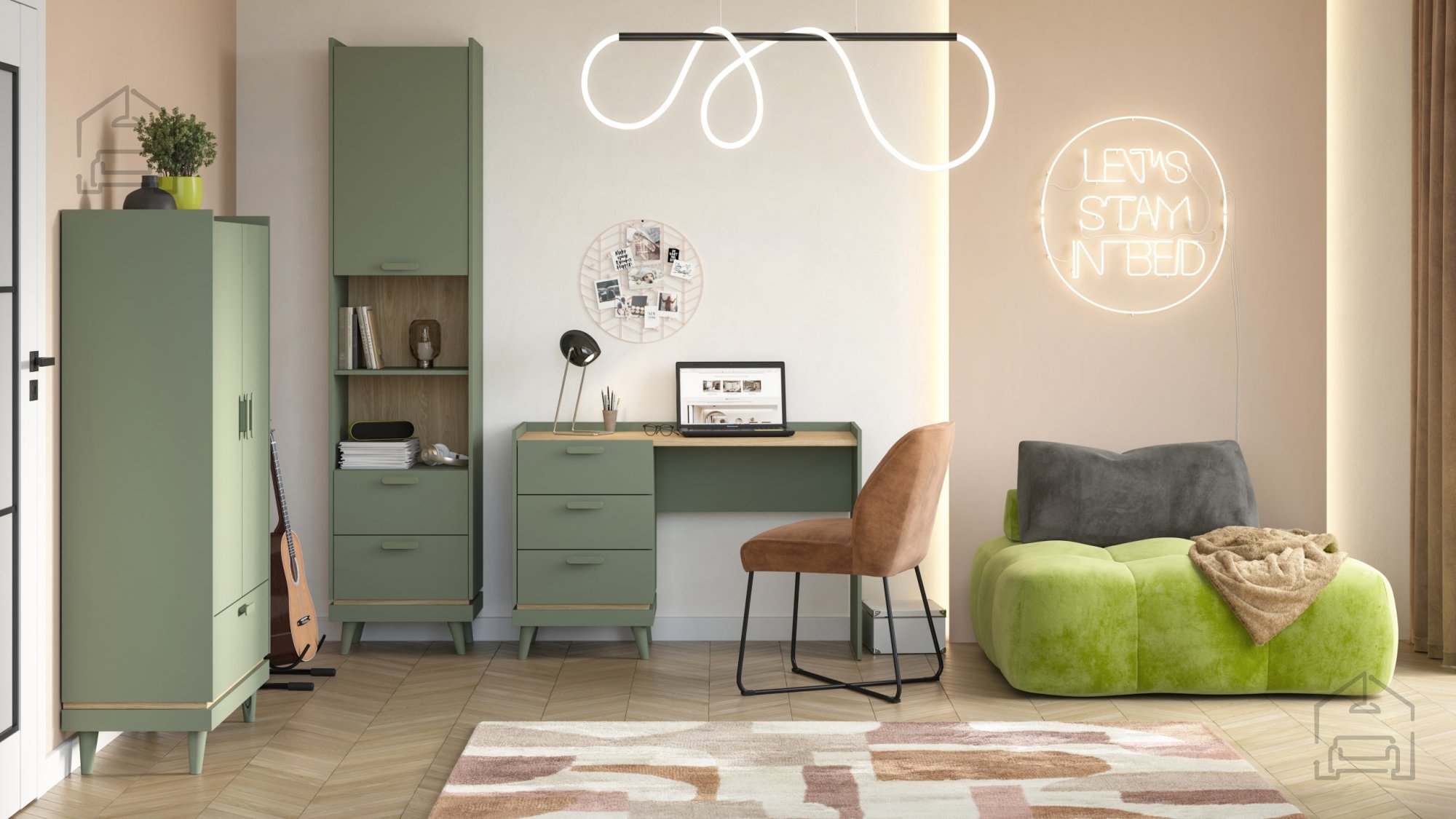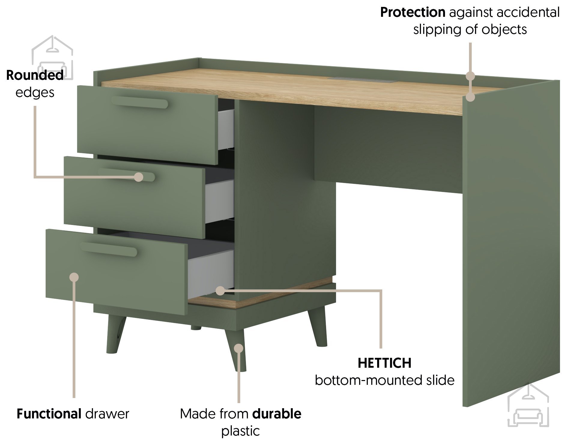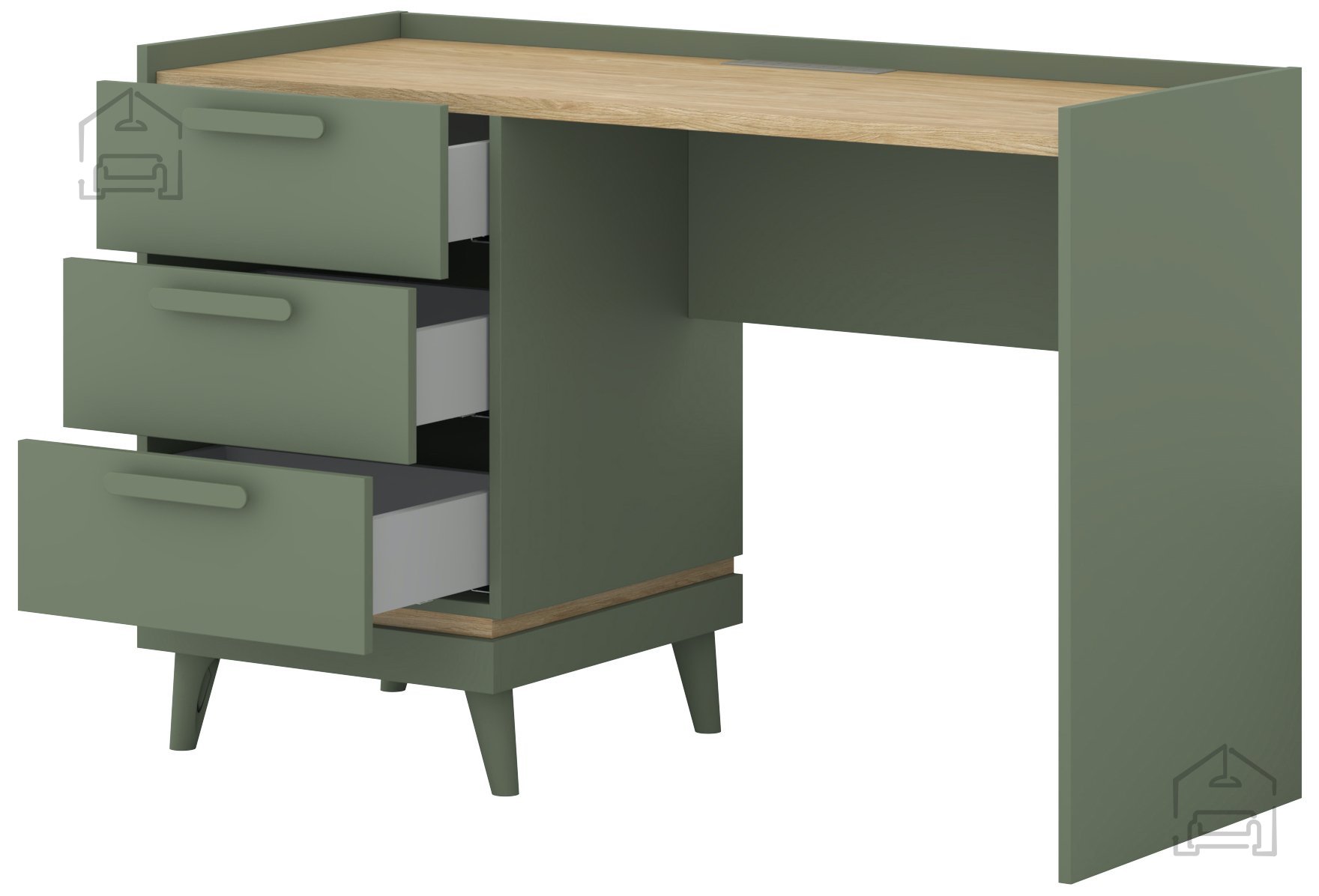 Die natürlichen Farbtöne verleihen dem Schreibtisch Scandi eine angenehme, warme Ausstrahlung. Die Kombination aus verwaschenem Grün und Elementen in geölter Eiche schafft ein frisches und zugleich ruhiges Ambiente. Der sanfte Kontrast dieser beiden Farben bringt eine dezente Dynamik in den Raum, ohne ihn zu überladen. Kunststoffgriffe und -füße in neutralem Farbton runden das moderne Gesamtbild ab und erleichtern gleichzeitig Pflege und Handhabung.